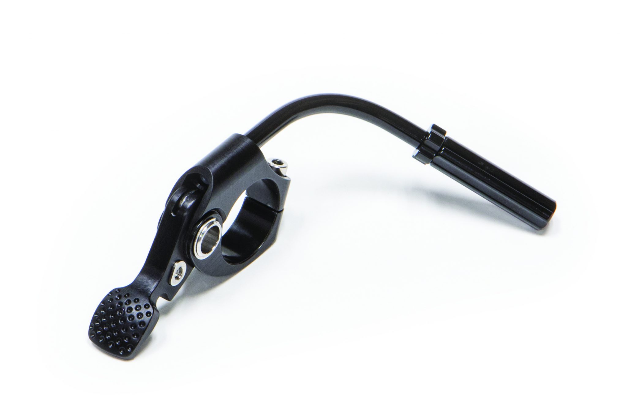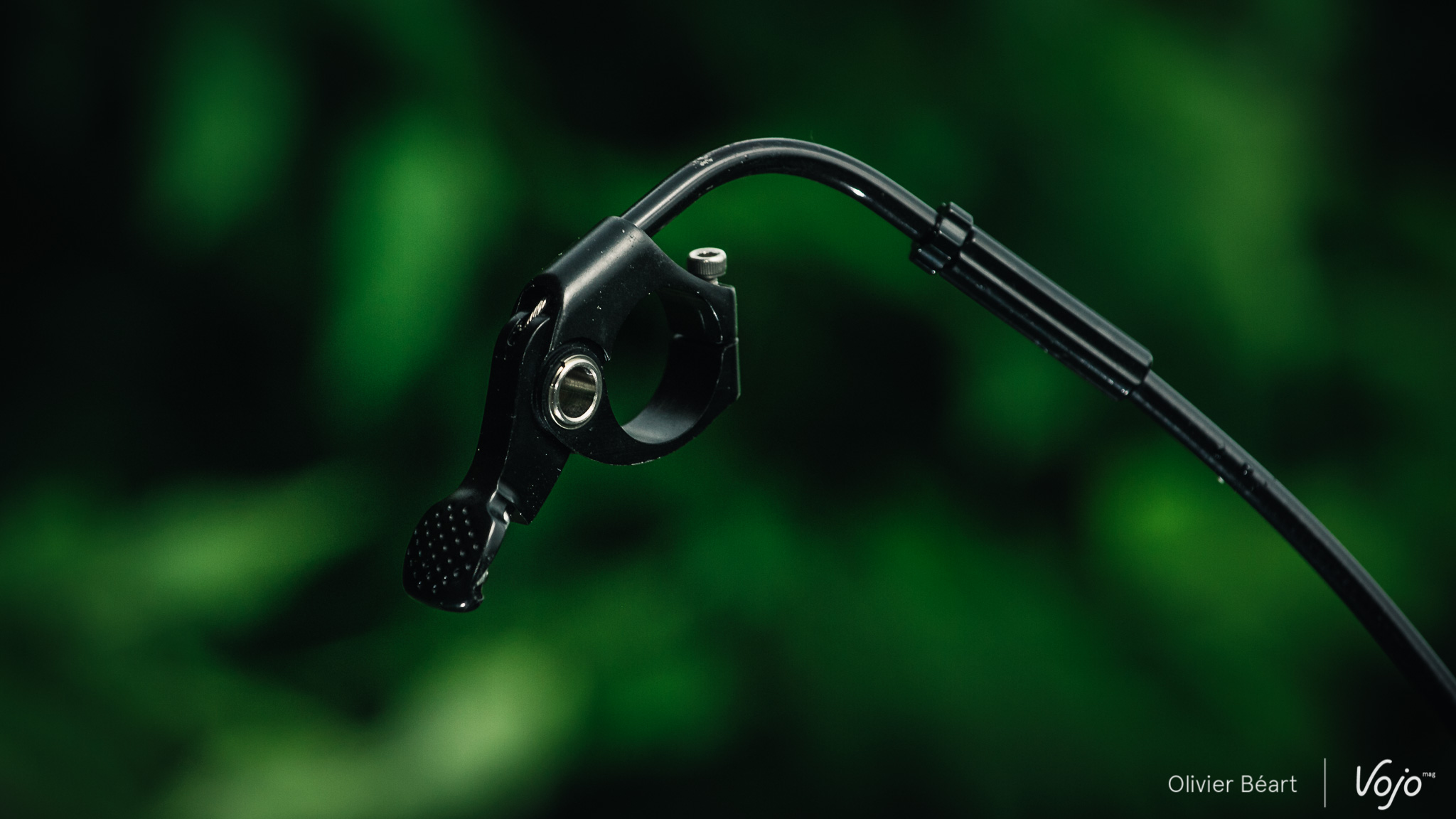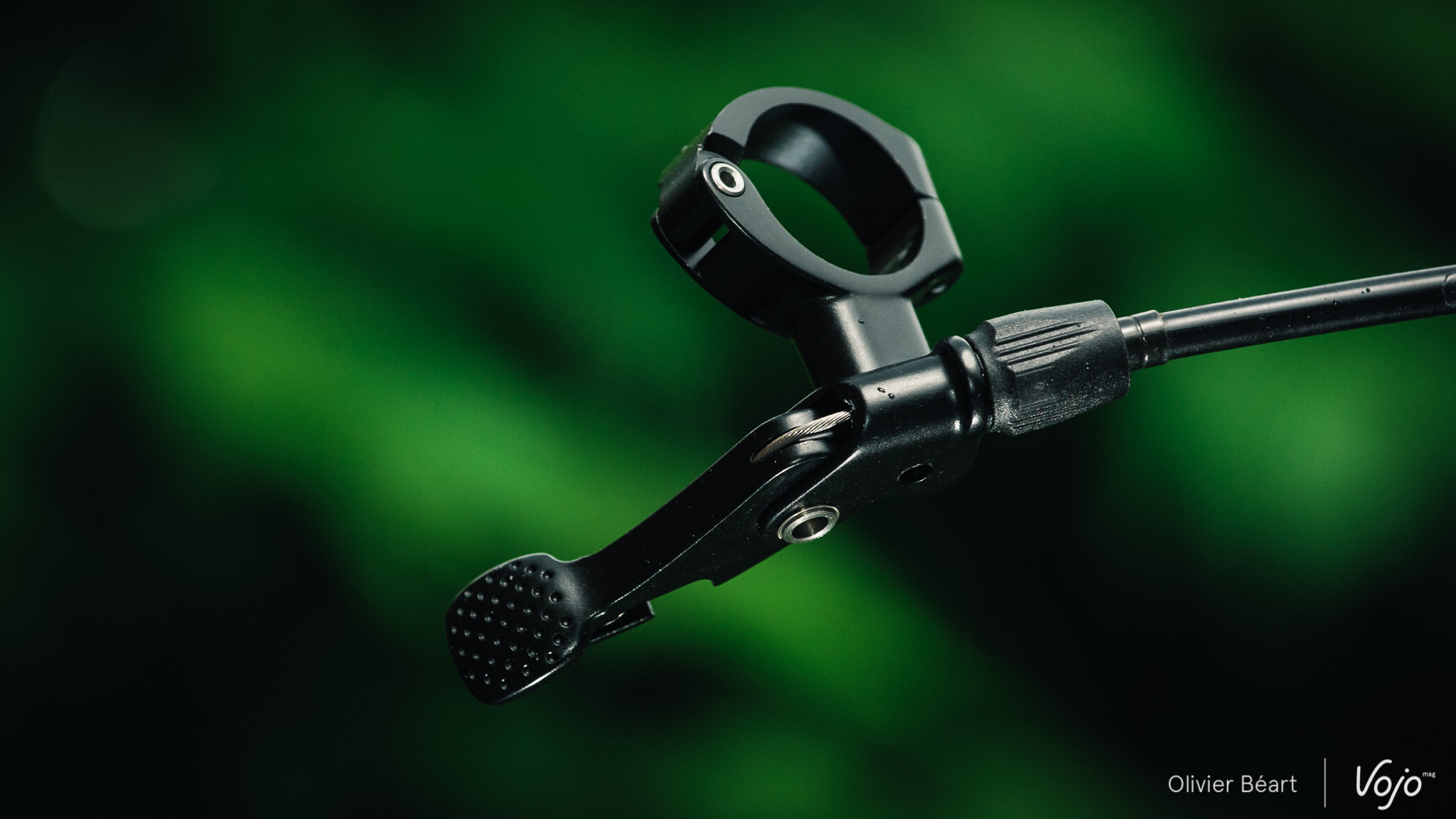 Première évidence en montant la tige de selle sur le vélo : c’est d’une simplicité enfantine. Plusieurs raisons à cela : tout d’abord, on peut connecter et déconnecter le câble très facilement de la tige de selle et, autre détail tout simple mais qui a toute son importance lors du montage, l’extrémité à couper du câble (sans la petite ferrure scellée) se trouve du côté de la commande au guidon. On peut donc placer sa tige de selle, sa gaine et son câble tranquillement dans le cadre, positionner sa commande pile-poil sur le cintre et couper aisément le câble à la bonne longueur à ce niveau. Si la partie située en bas de la tige de selle fait penser à la KS Lev, la partie sur le cintre rappelle la tige de selle Thomson, avec en plus une petite échancrure qui a été faite à l’arrière du levier pour loger la petite butée qu’on place pour éviter que le câble s’effiloche.