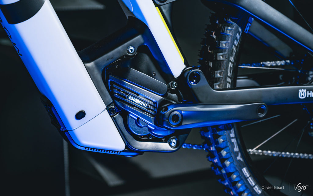 A l’avant, on constate que le logo Husqvarna est posé sur une petite grille. Au-delà du côté design, cette grille a également une fonction d’aération passive de la batterie. « Il y a aussi des petites ouïes dans le bas du tube pour créer une légère couche d’air entre le cadre, le moteur et la batterie. On ne va pas raconter qu’il y a un flux d’air qui fait du refroidissement avec la vitesse comme en moto ! Ce n’est pas cela. C’est juste une aération passive, mais dont nous avons vu l’efficacité pour tempérer la zone et éviter/retarder les températures extrêmes chaud/froid autour de la batterie. »
