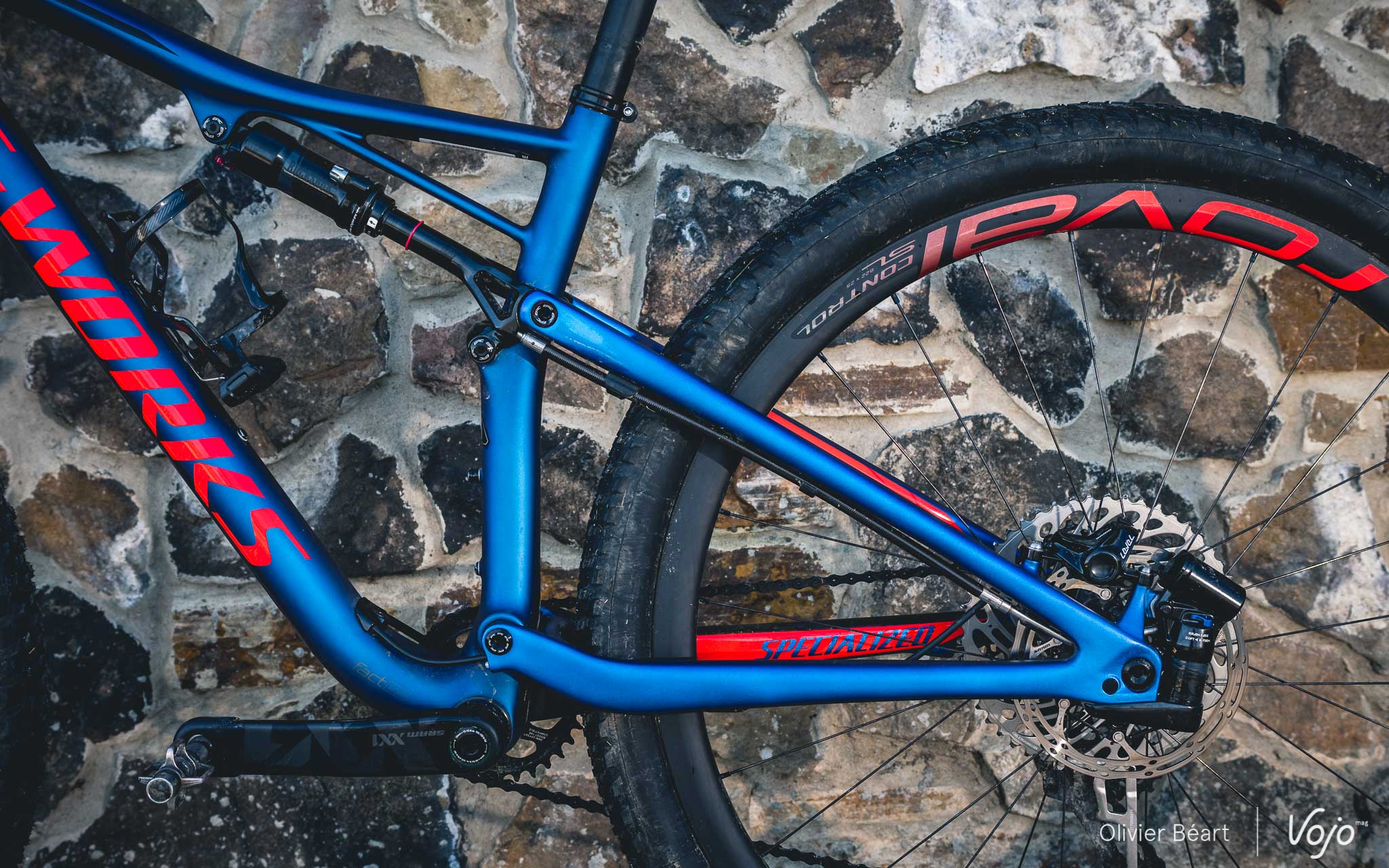 C’est la version qui évolue le plus. Par rapport à l’Expert actuel que nous avions testé dans le cadre de notre grand match de fulls XC un peu plus tôt cette année, il gagne un triangle arrière en carbone et des roues également en carbone, ce qui justifie amplement l’augmentation de prix de 300€ à 4999€.