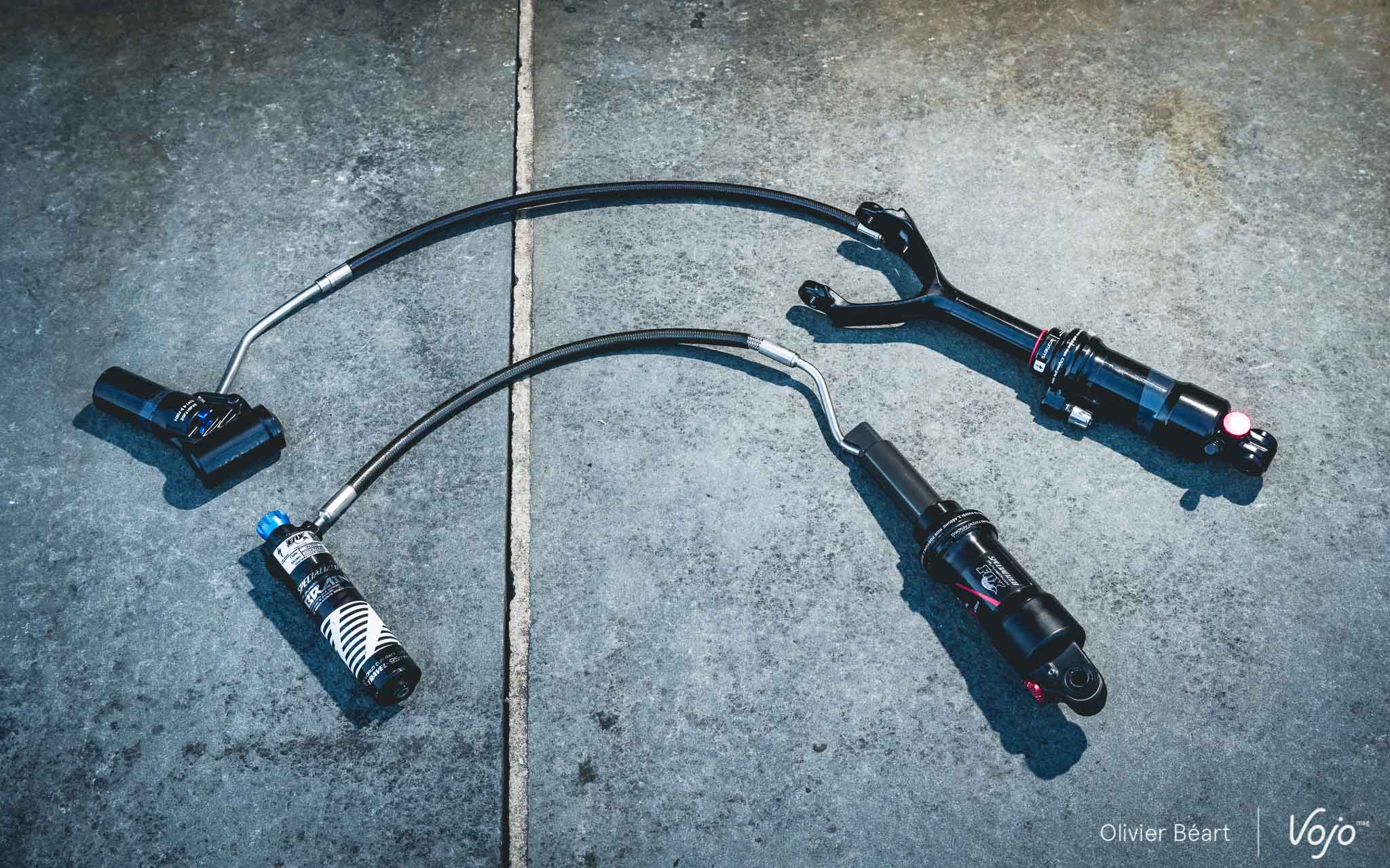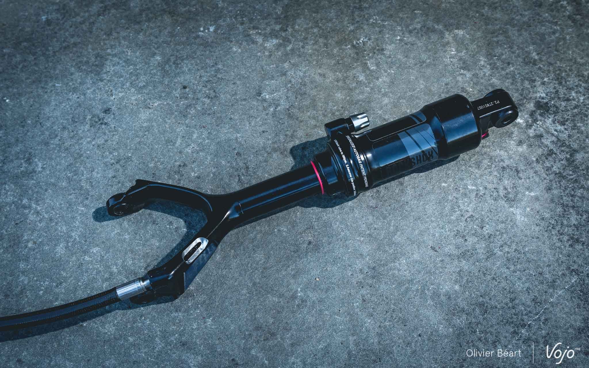Outre un trajet très droit entre le Brain et l’amortisseur, le passage de l’huile se fait désormais à travers du « yoke » qui assure la liaison entre l’amortisseur et la biellette, toujours pour assurer une transmission la plus directe possible. Le petit levier bleu qu’on aperçoit sur le Brain permet le réglage de la sensibilité sur 5 positions.