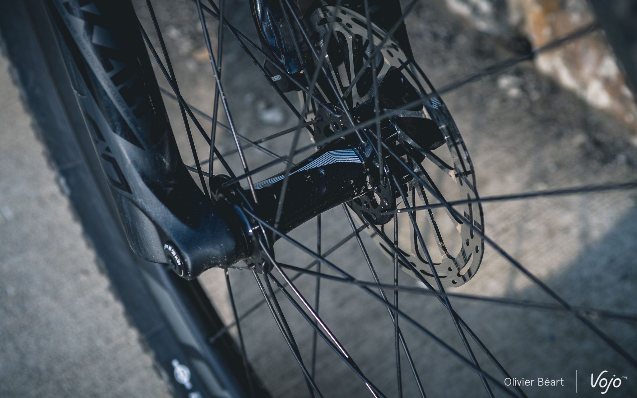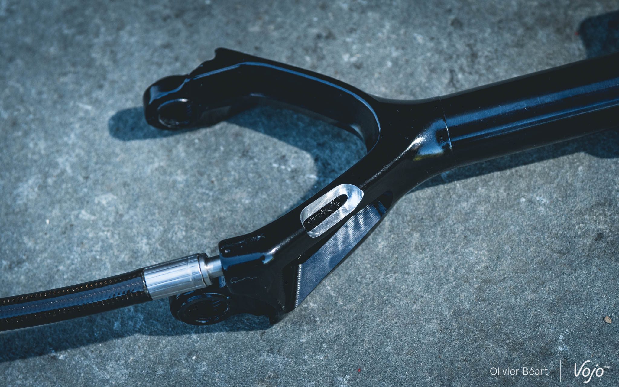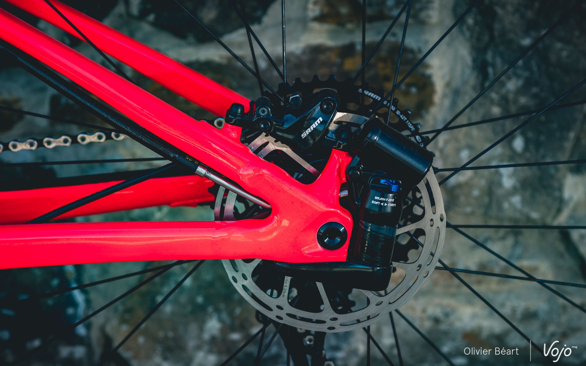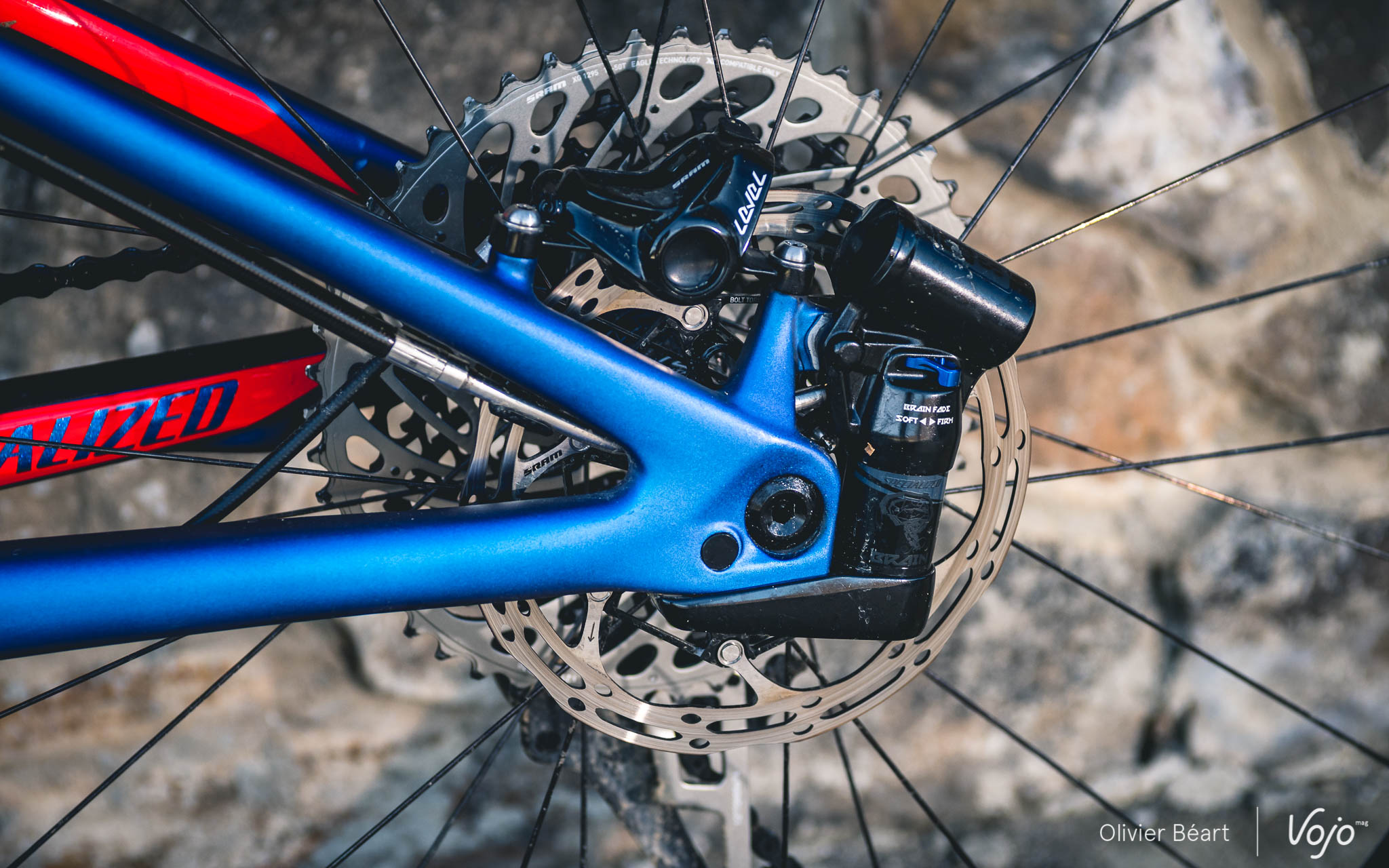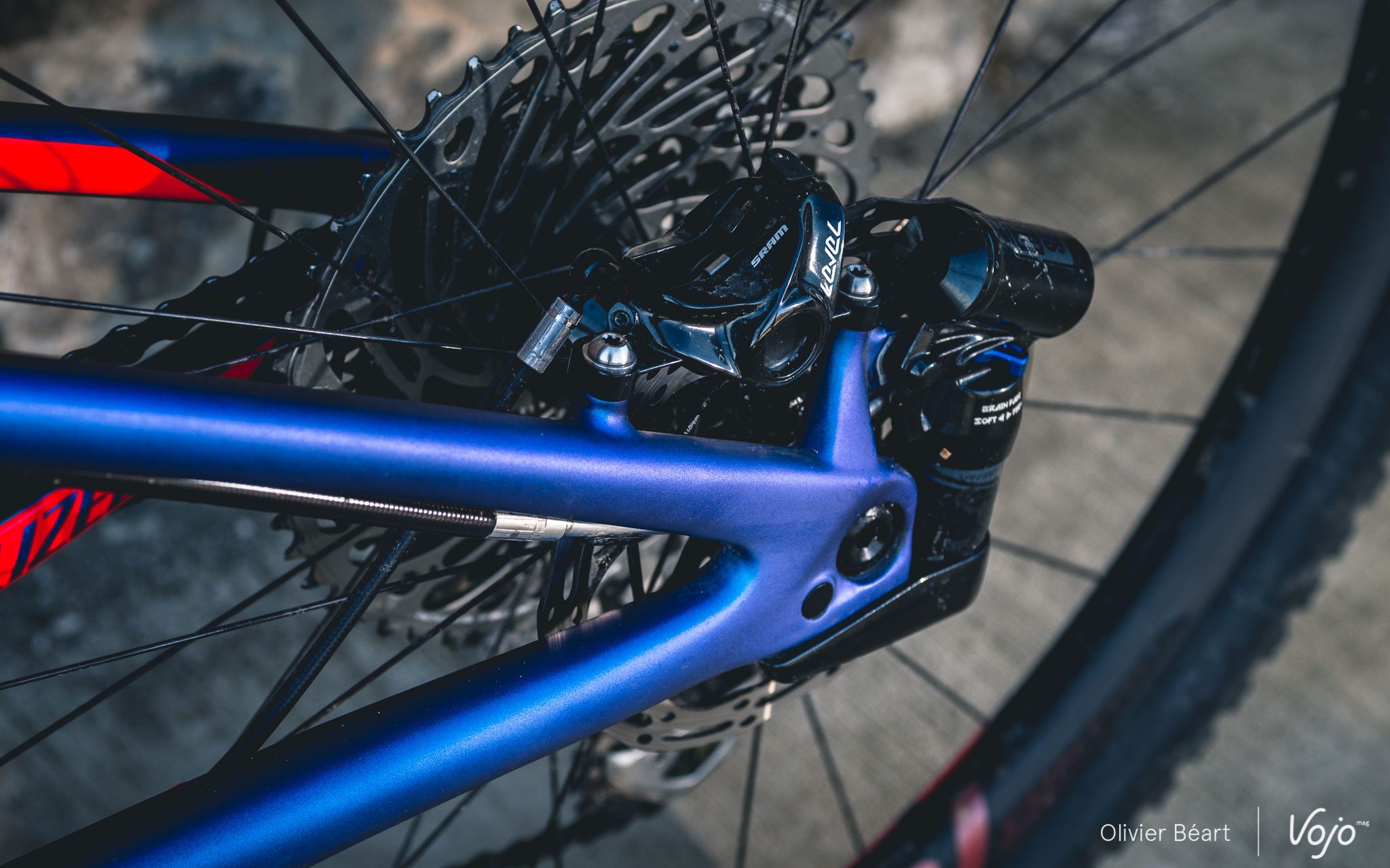 L’amortisseur a aussi été retravaillé dans cet esprit en compagnie de RockShox, avec une « Spike Valve » qui crée une courbe d’amortissement décroissante pour améliorer le confort dans les situations de saccades à haute vitesse et l’huile circule désormais dans un « Fade Circuit » qui assure des réactions identiques de l’amortisseur lui-même quel que soit le réglage du Brain sélectionné parmi les 5 proposés (du plus sensible au plus ferme).