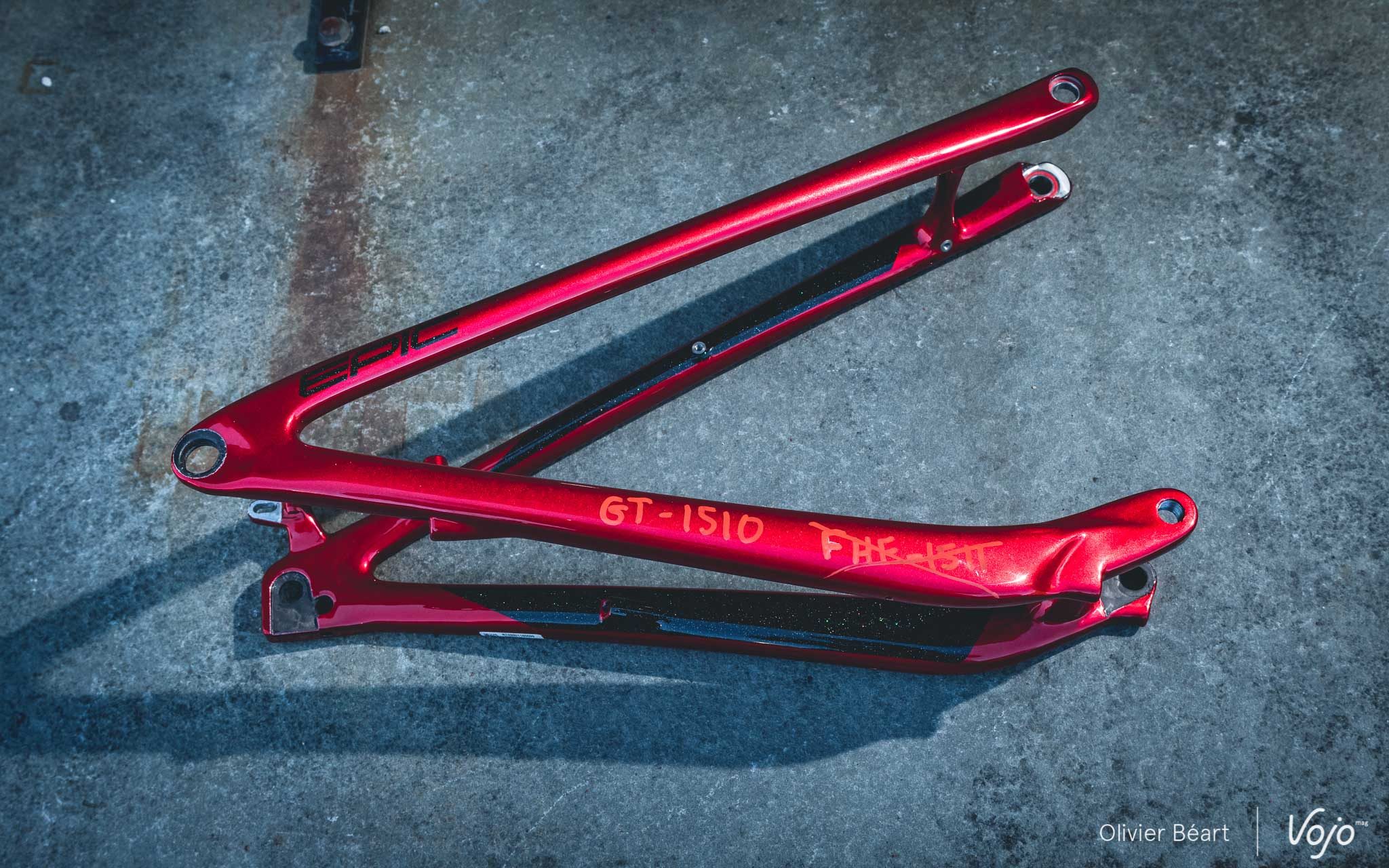 Outre le triangle avant, qui s’inspire du nouvel Epic HT apparu l’an dernier (voir notre test), c’est surtout sur le bras arrière que Specialized a gratté le plus de grammes, comme nous l’explique Brian Gordon, le « papa » du cadre de ce nouveau Specialized Epic (et accessoirement aussi champion des USA de XCM en catégorie amateur) : » Nous avons réussi à gagner 240g rien que sur cette partie, soit 39% ce qui est énorme. Mais c’est uniquement grâce au travail mené avec le département suspension que nous avons pu réussir cela. Car si vous regardez bien, le fameux Horst Link de la suspension FSR a disparu, ce qui nous a permis non seulement d’économiser le poids des roulements, mais aussi de travailler avec des fibres de carbone continues des bases jusqu’aux haubans pour alléger l’ensemble et gagner en rigidité ».