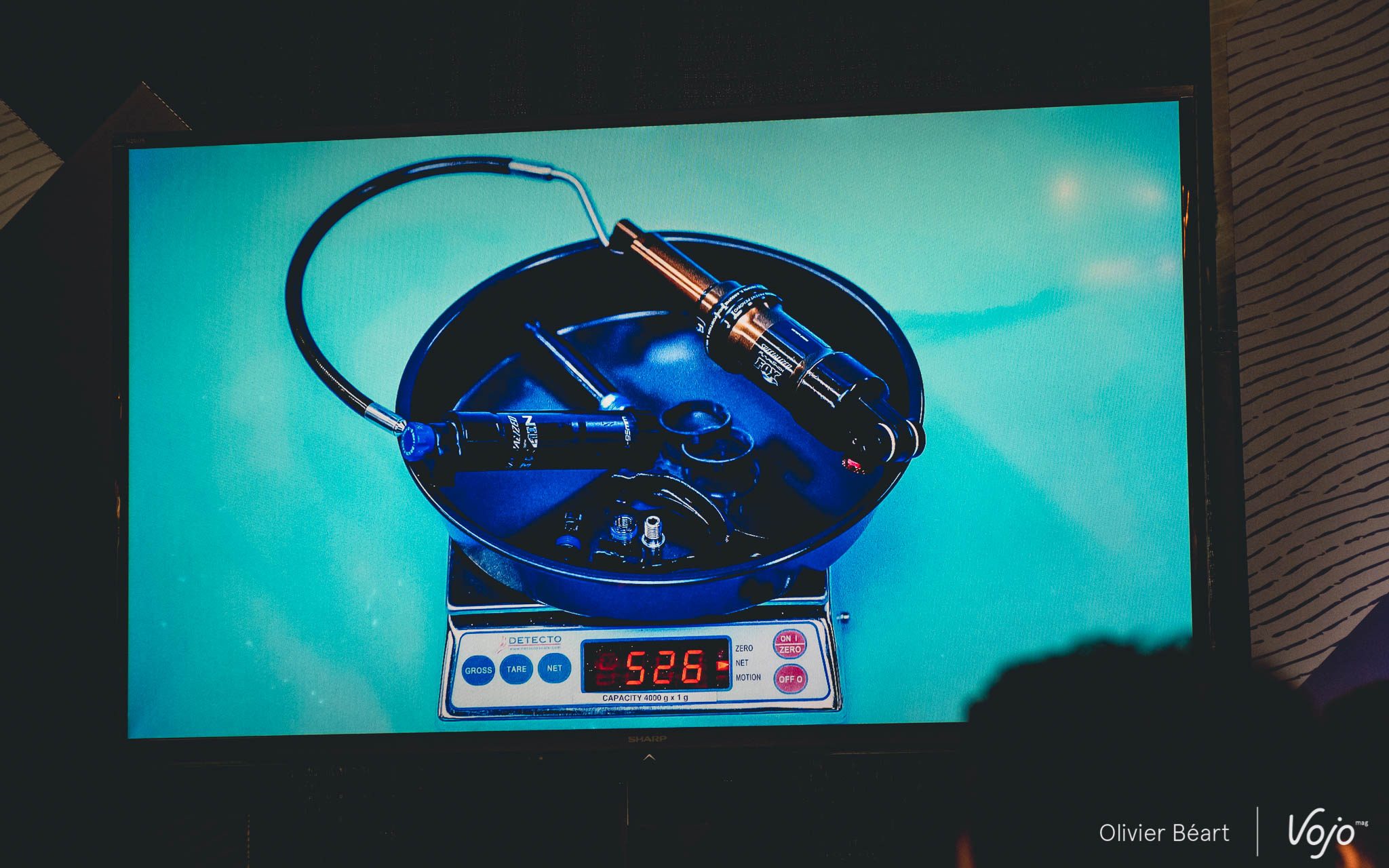 Vous l’aurez sans doute remarqué, le Brain est désormais en deux parties. Outre le système de valve d’inertie (partie grise, en bas), c’est désormais un système avec membrane (partie noire dans le réservoir du dessus) qui sert à séparer la charge d’azote du système de l’hydraulique de l’amortisseur ; et plus un piston séparateur. Selon Mike McAndrews : « Un piston a tendance à se déplacer de manière plus saccadée lorsque l’amortisseur évolue sur son débattement, alors que la vessie permet un mouvement beaucoup plus doux. Les transitions de la compression au rebond sont plus rapides, ce qui améliore le comportement de l’amortisseur à haute vitesse ».