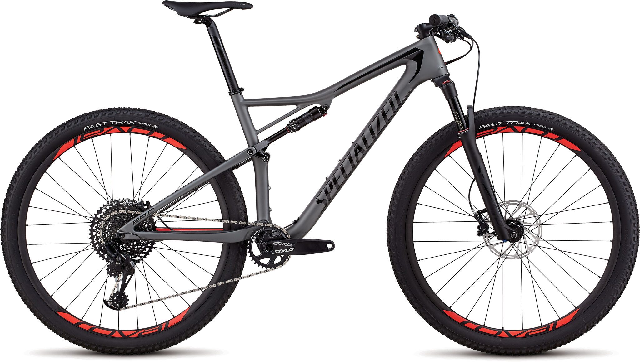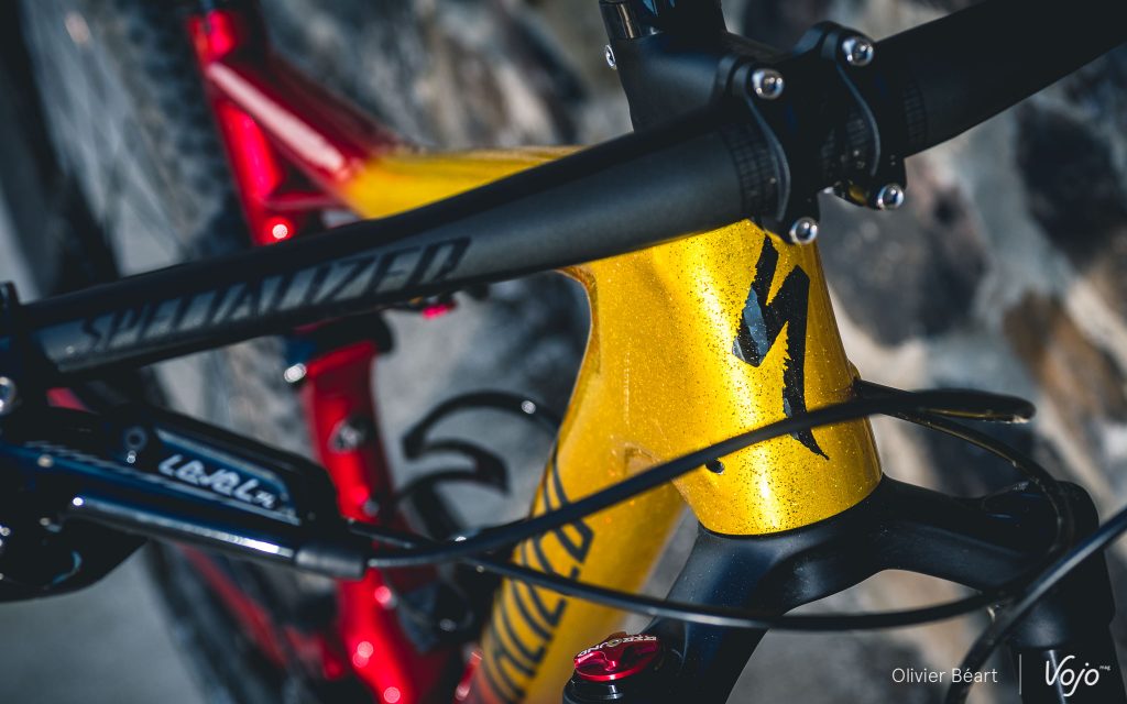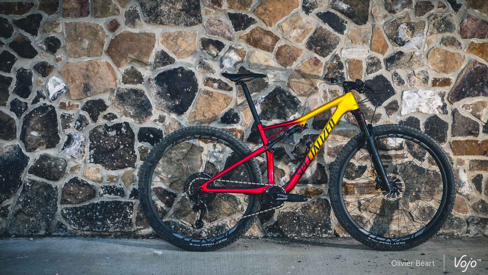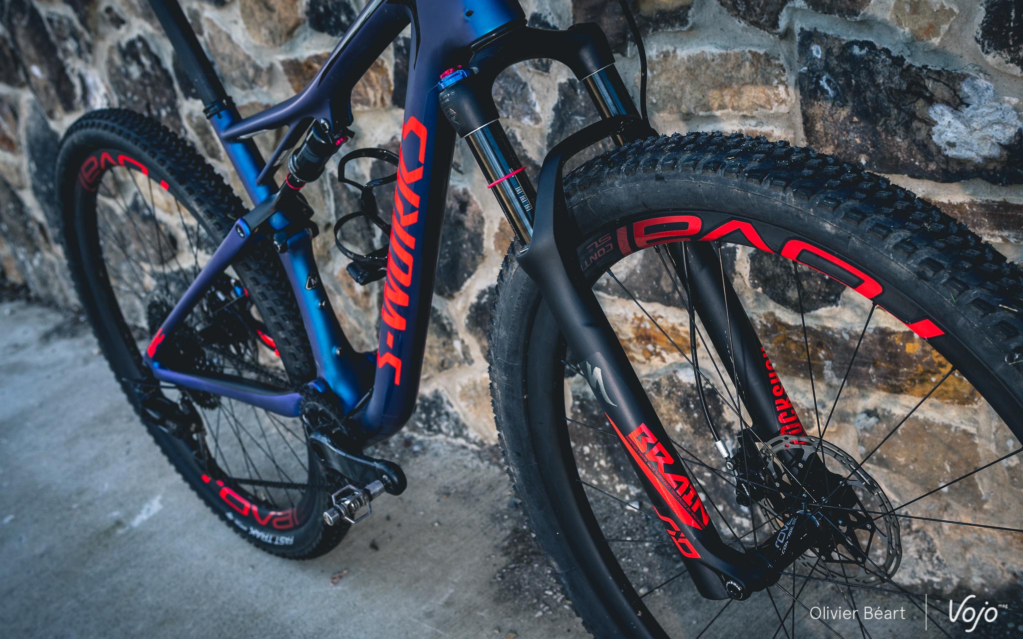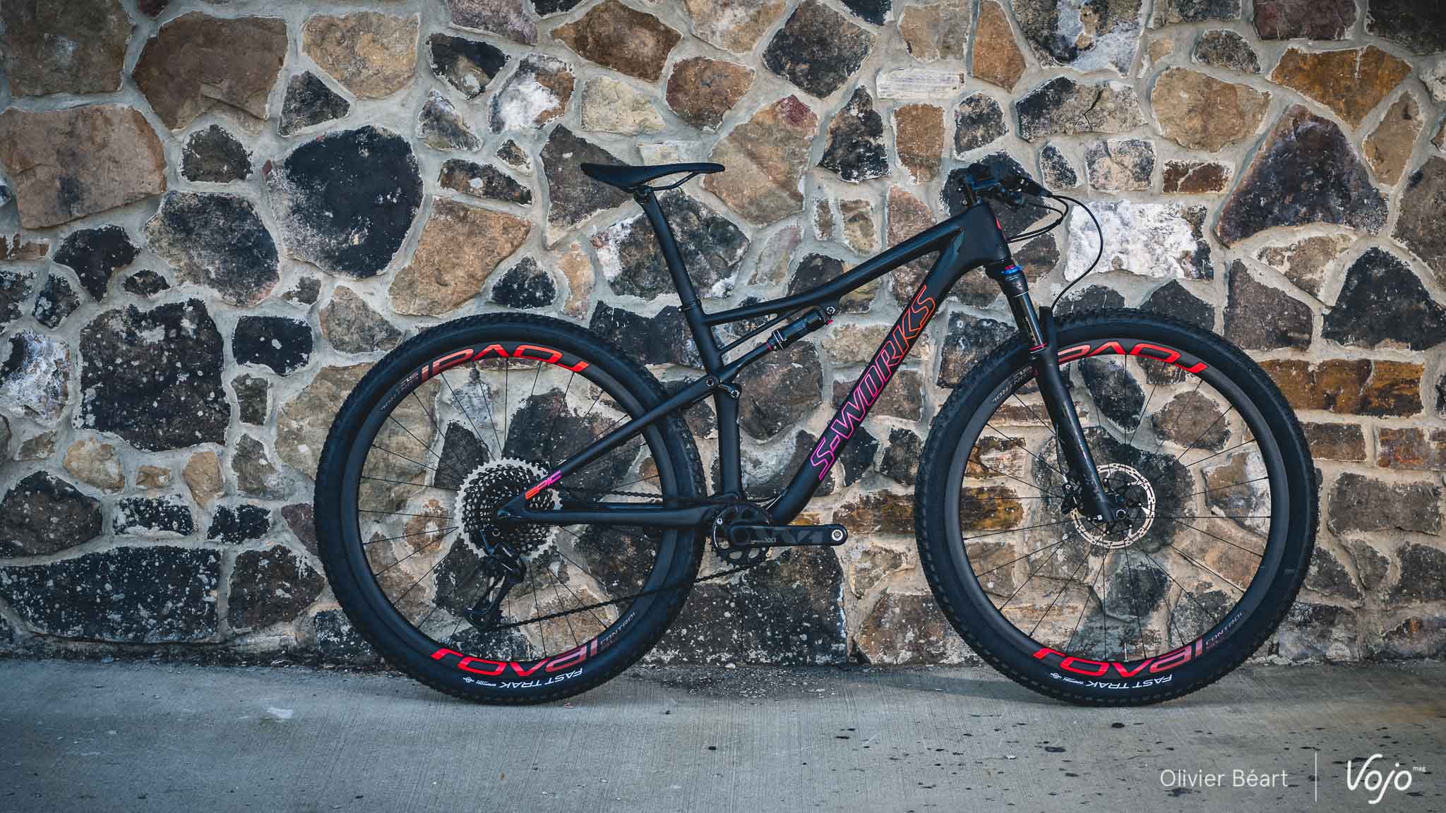Il est équipé d’un groupe Sram XX1 Eagle, de freins Sram Level, d’une fourche RockShox SID Brain World Cup, des nouvelles roues Roval Control SL avec jantes en 25mm de large, de pneus Fast Track Gripton Grid en 2.3 devant et 2.1 derrière, ainsi que d’une tige de selle et d’un cintre carbone.