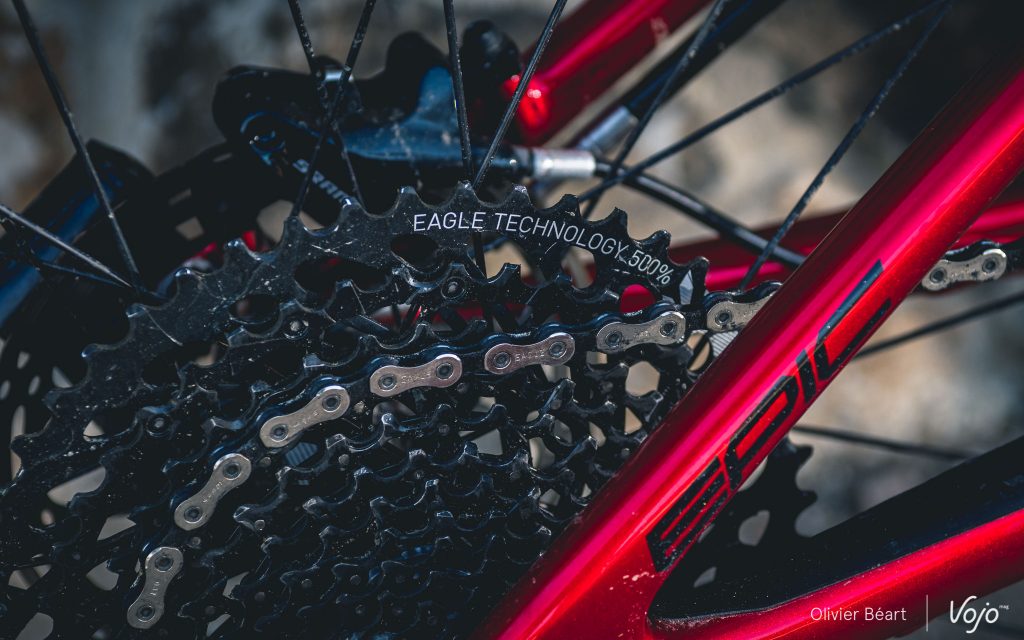 Il est équipé du même cadre Fact 11M que le Pro, d’un groupe Sram GX Eagle, de freins Sram Level TL, de la fourche SID Brain et de roues Roval Control Carbon dont les moyeux changent par rapport à la version Pro, mais aussi les jantes qui, si elles sont toujours en 22mm de large, sont celles des Roval Control, et non des anciennes SL comme sur le Pro.