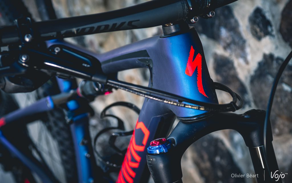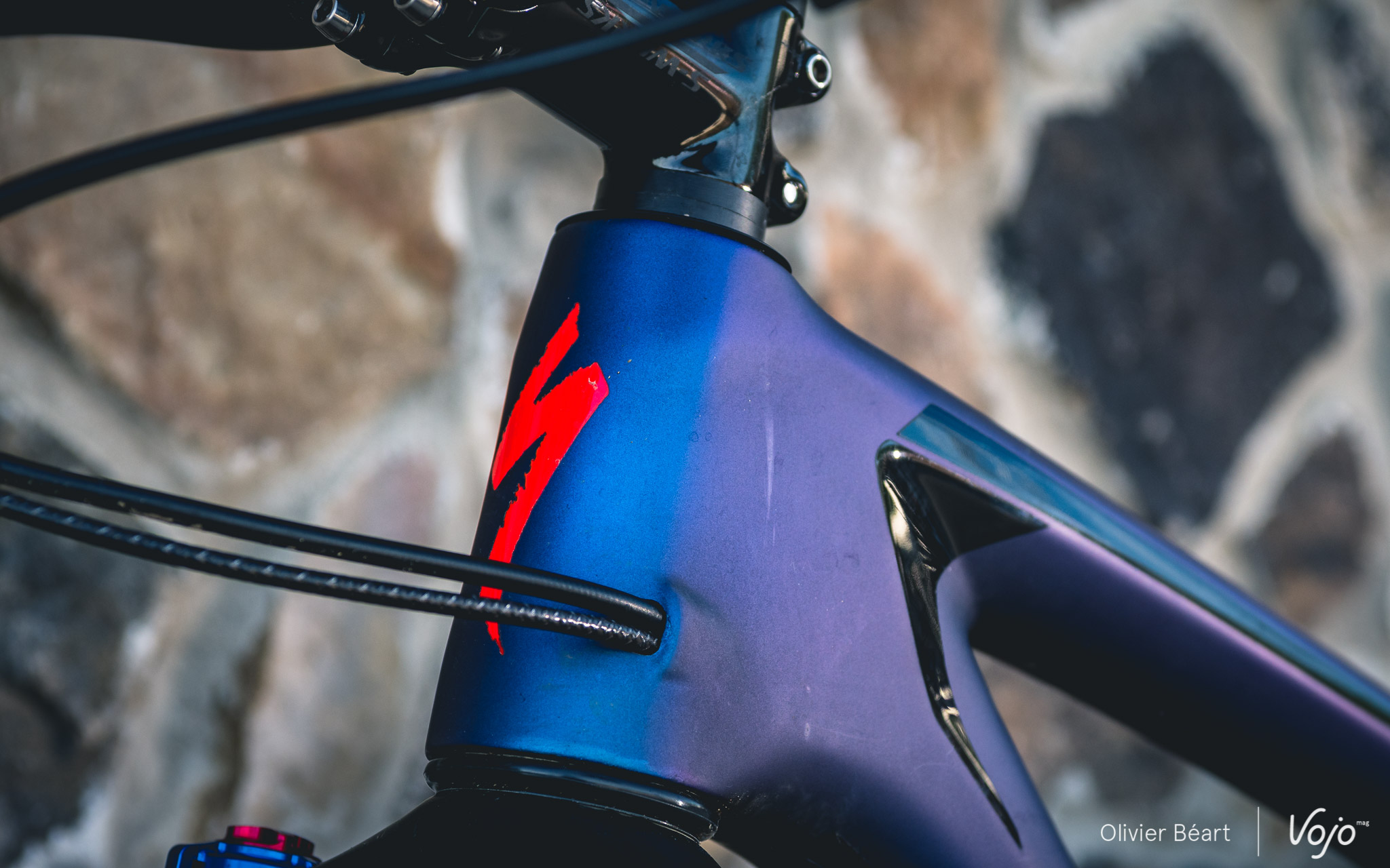 Le passage interne n’est pas complètement « tubé » comme sur un Stumpjumper (question de poids), mais un petit guide permet de récupérer facilement les câbles dans le bas du tube diagonal.