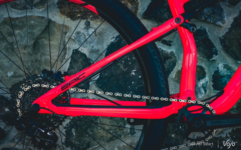 Les spécialistes apprécieront la portée de cette petite « révolution » (pas spécialement sur le terrain mais au niveau de la philosophie de conception) : le nouveau Specialized Epic est donc désormais un mono-pivot avec biellette, ce qui est un changement de conception majeur en dépit d’un look qui reste globalement très proche. Et ce sont donc désormais les haubans en carbone (aplatis) qui se déforment lors des mouvements de la suspension ; un principe déjà aperçu dans d’autres marques et désormais bien connu dans le monde du VTT.