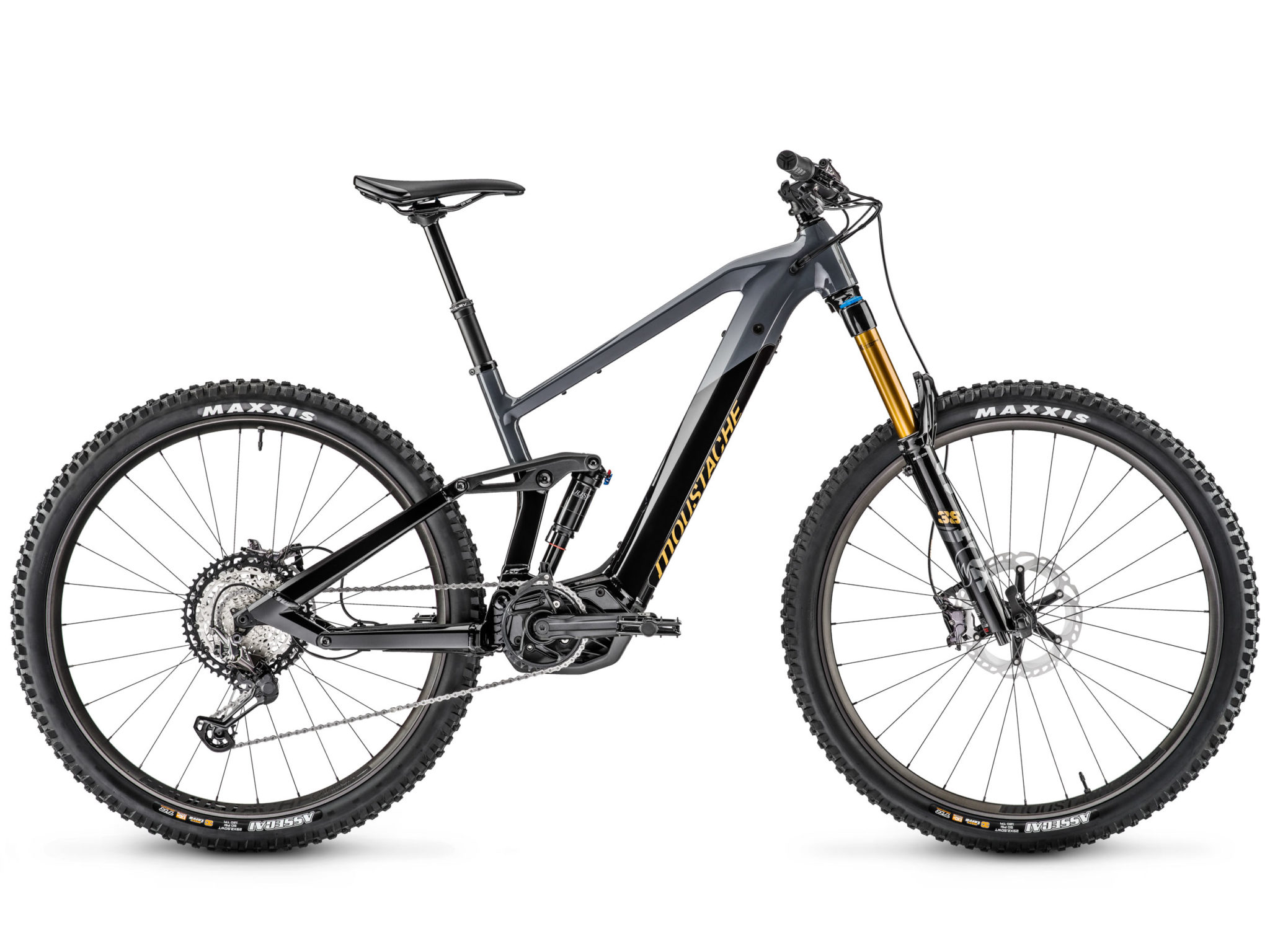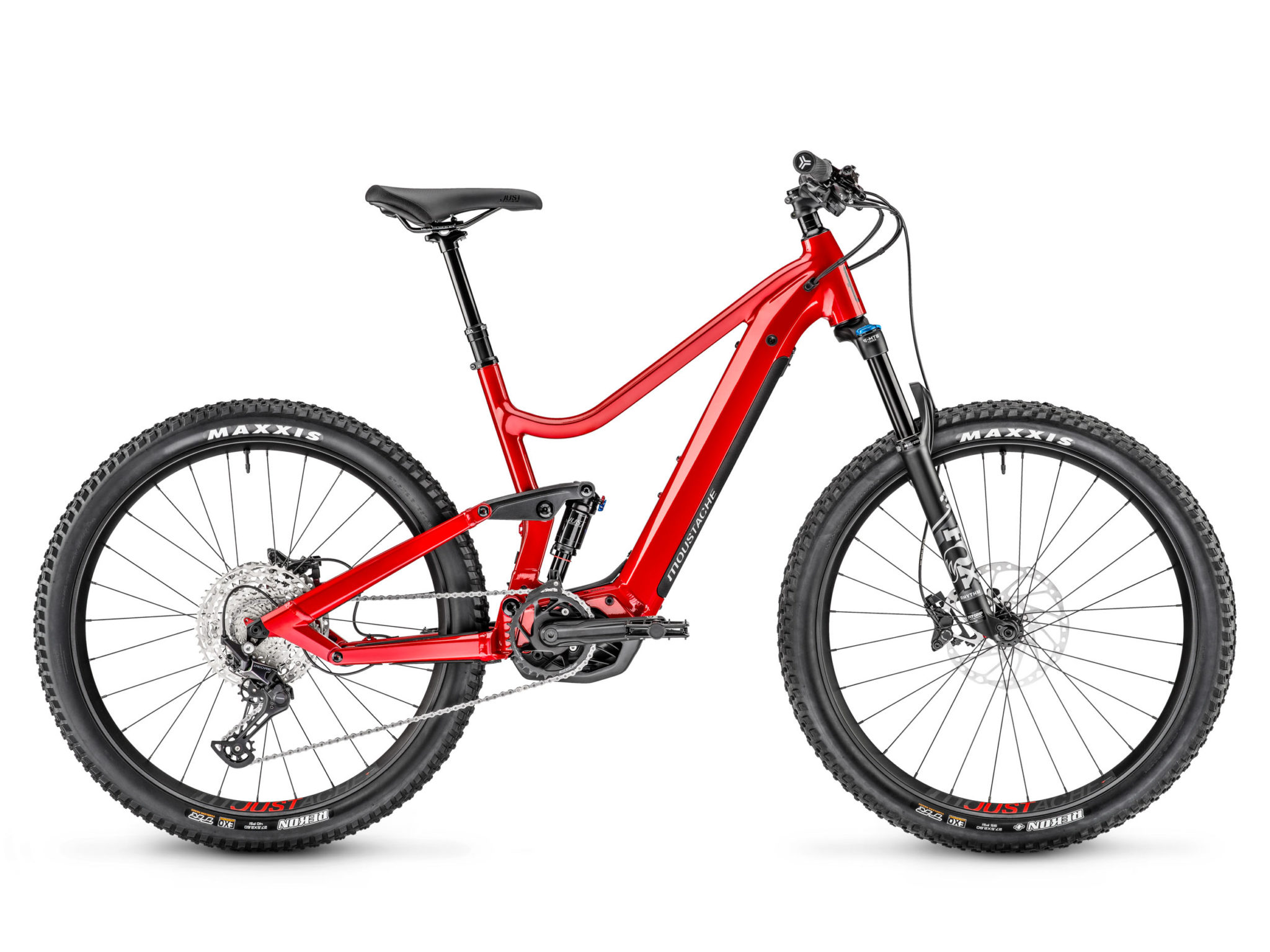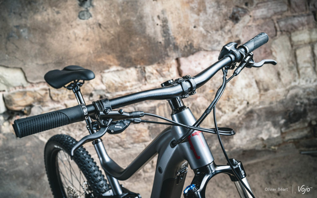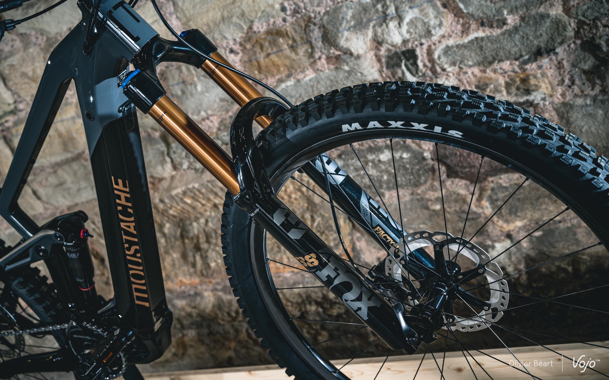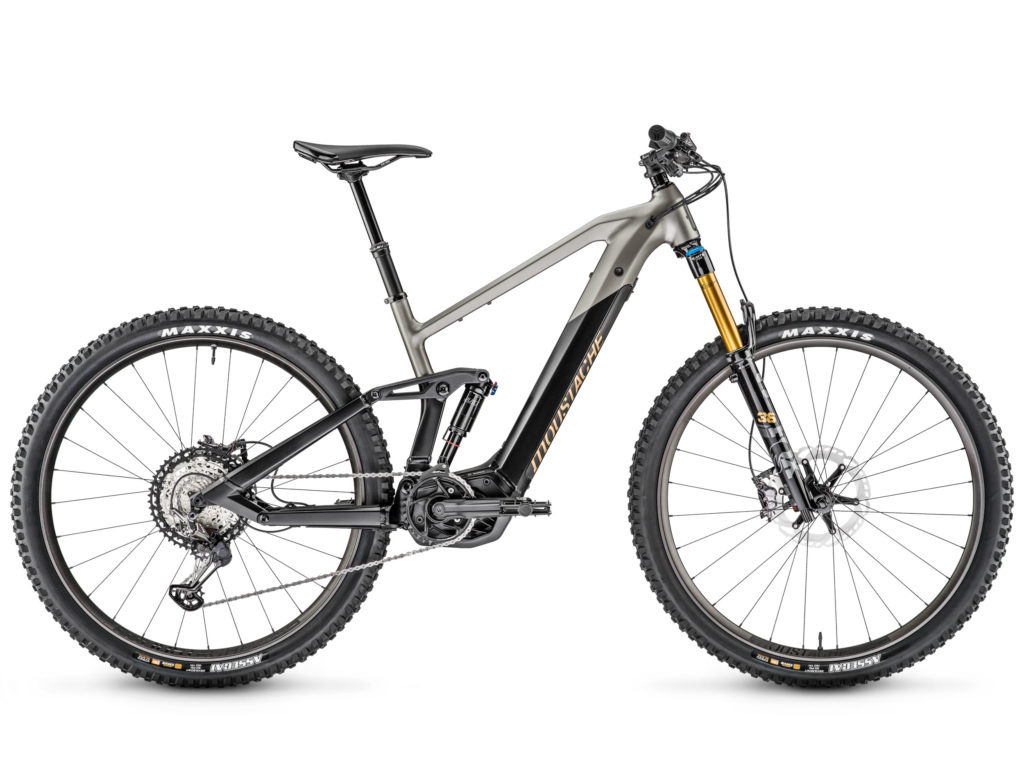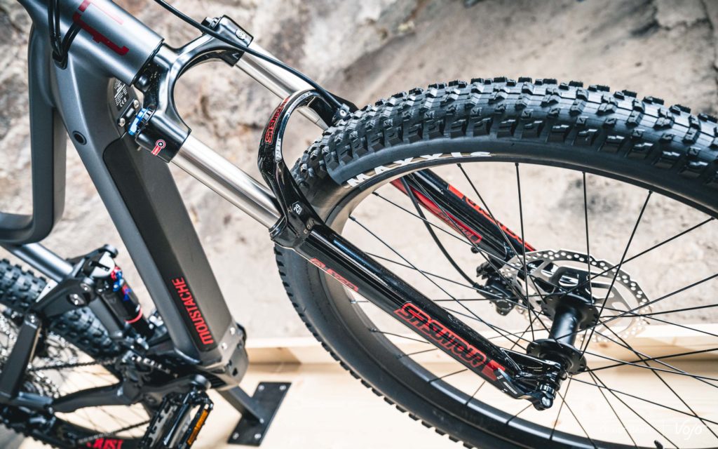 Au niveau des équipements, Moustache travaille uniquement avec Shimano pour les transmissions et les freins, ainsi que pour les moyeux (essentiellement sur les modèles haut de gamme dans ce cas). Du côté des suspensions, Fox reste le partenaire prioritaire, même s’il y a aussi du Suntour et un peu de RockShox en entrée de gamme. Enfin, les pneus proviennent systématiquement de chez Maxxis (Rekon en 27,5+ et Assegai en 29″). Depuis plusieurs années, Moustache produit aussi ses propres équipements, ses propres roues et son propre amortisseur arrière, tous excellents.