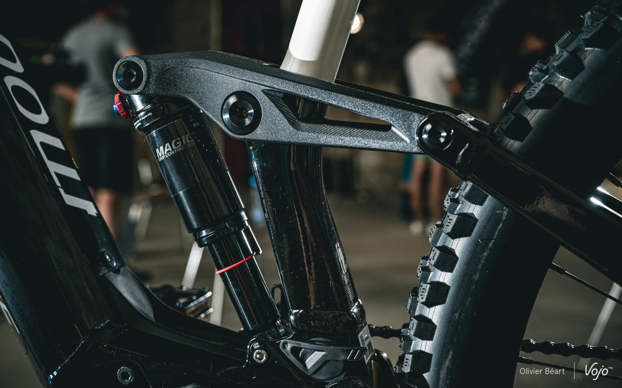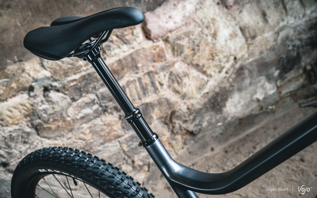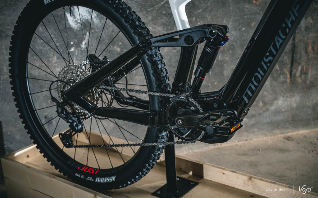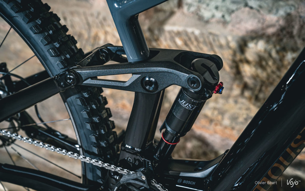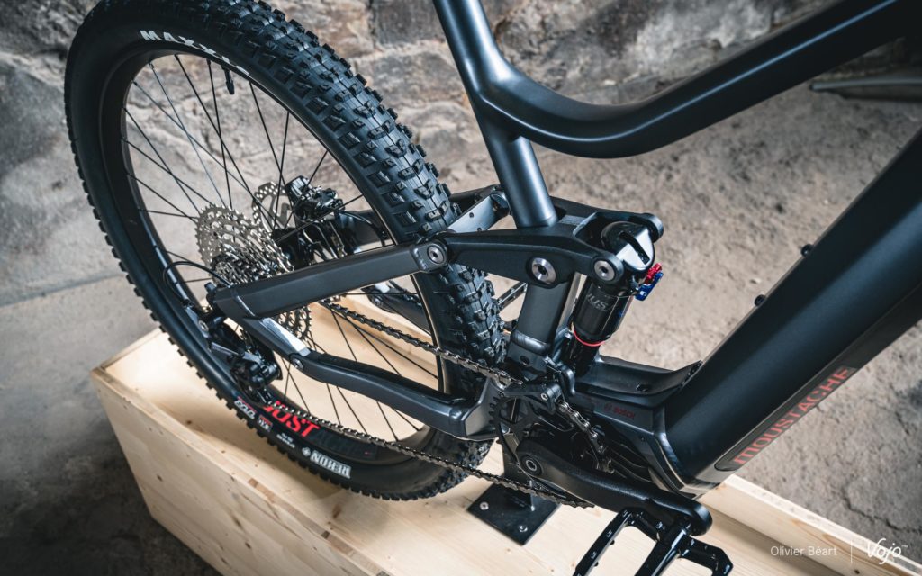 Très à cheval sur les réglages de suspensions, les équipes de développement de Moustache ont aussi revu le setting de leur amortisseur maison pour s’accorder parfaitement au changement de format de roues et de plateforme pour la fourche. Vu la présence de grandes roues, le « flip chip » situé au niveau de l’ancrage inférieur de l’amortisseur est désormais placé en position basse. On note aussi l’apparition d’une nouvelle biellette évidée et affinée, plus esthétique et légère que la précédente.