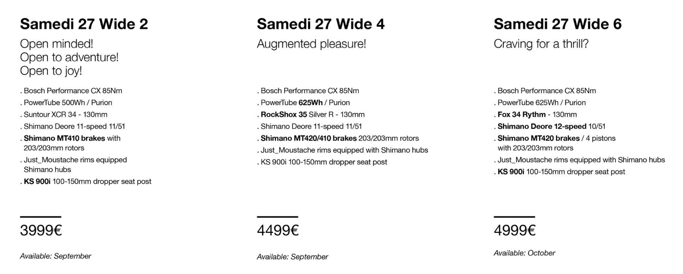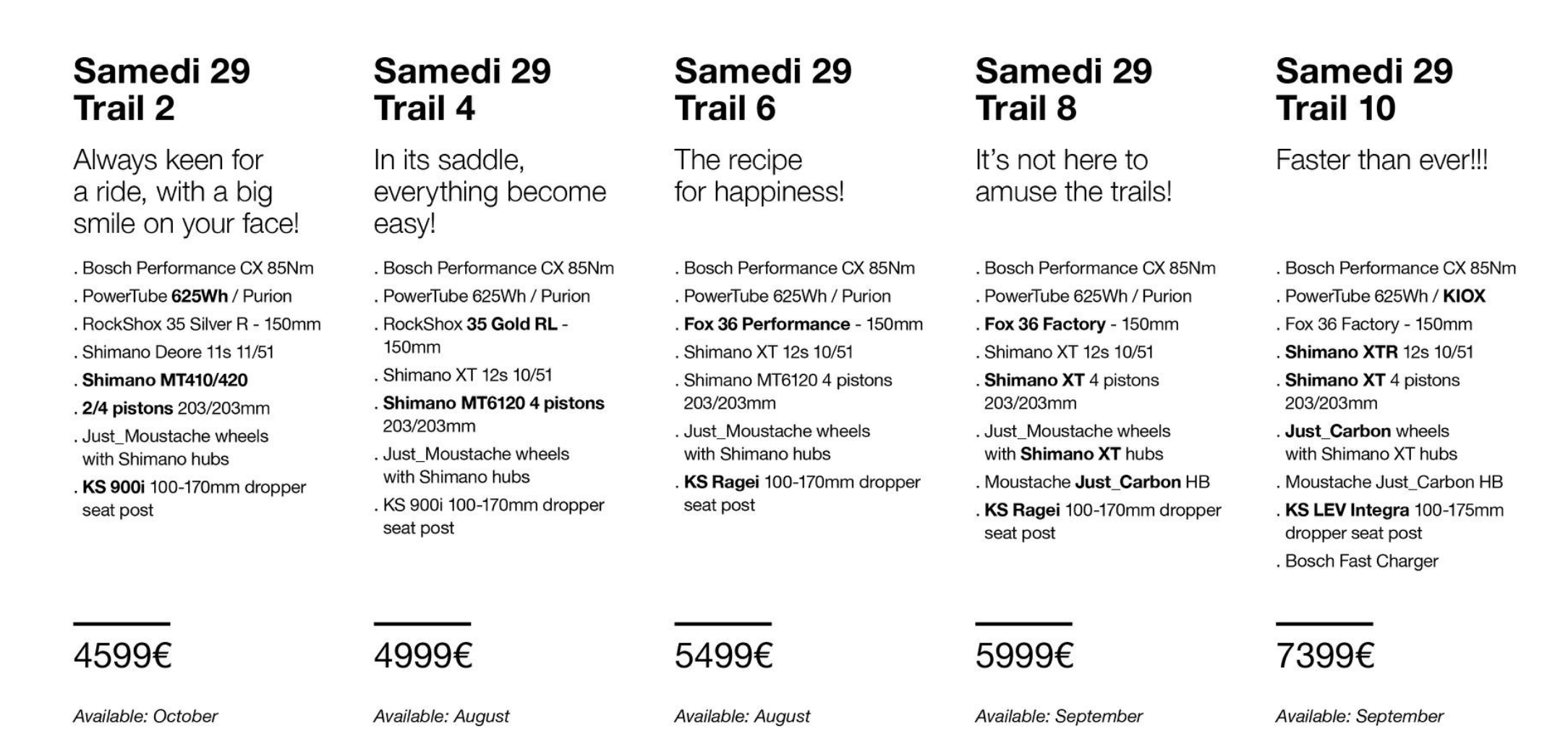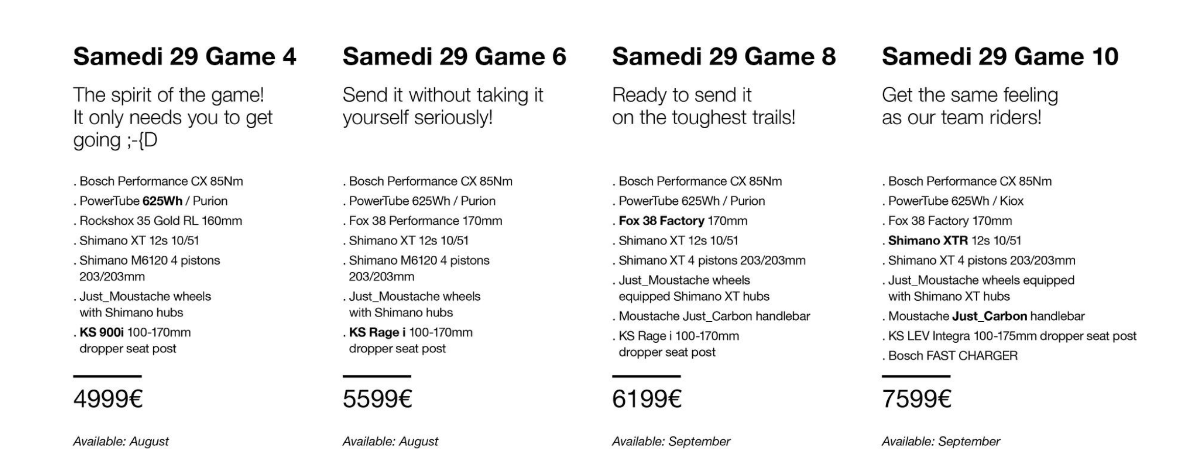 Esthétiquement, mis à part le Wide, les modèles Trail et Game de la Saison 10 se distinguent par une nouvelle finition bicolore, avec une présence de noir sur la partie basse du cadre, dans le prolongement du cache de la batterie. Selon les versions, tous ces modèles seront disponibles en magasin entre les tout prochains jours, soit début août, et la fin du mois de septembre.