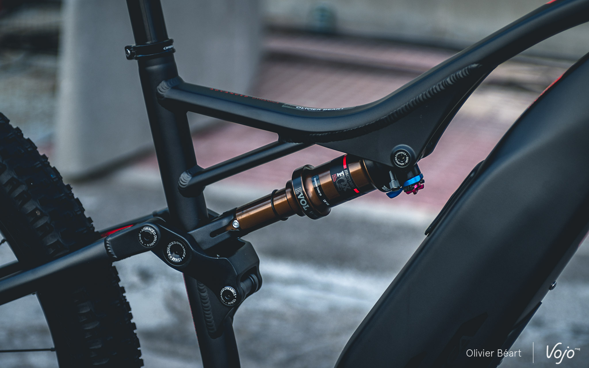 La suspension arrière Advanced Dynamics rappelle celle d’un Orbea Occam et c’est vrai qu’elle en est largement inspirée, mais le débattement est de 140mm (à l’avant comme à l’arrière), les points de pivot sont renforcés et l’amortisseur ainsi que la fourche sont spécifiques ebike (courbe de compression custom et châssis renforcé pour la fourche).