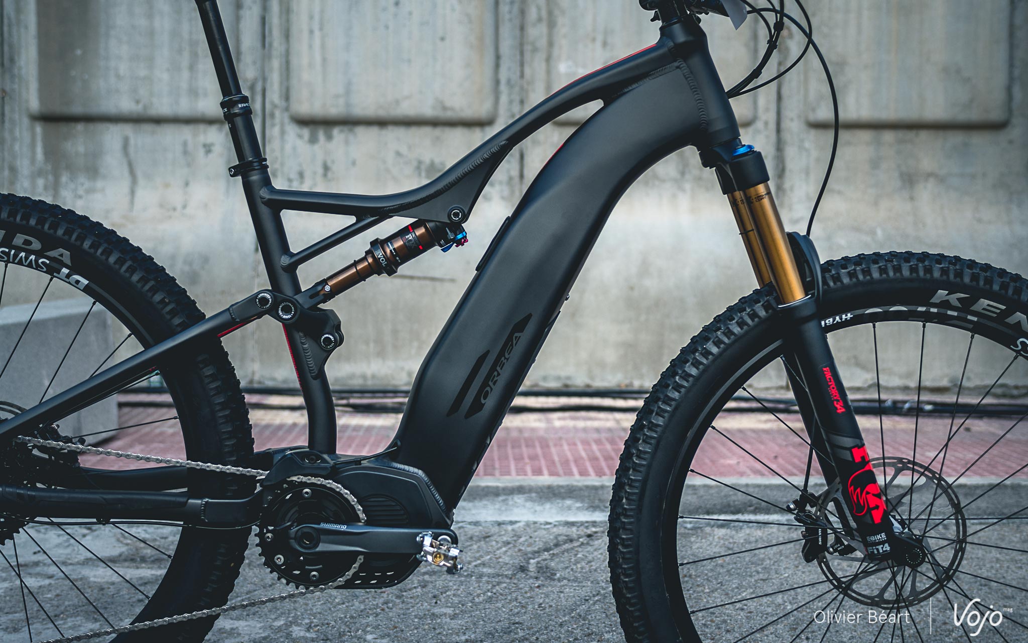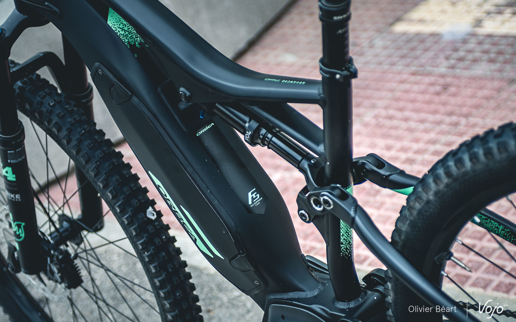 Bon, c’est vrai qu’avec cet énorme tube diagonal, on dirait un peu « un boa qui a avalé un animal trop gros pour lui », pour reprendre les mots d’un observateur anonyme. On sent bien qu’Orbea a dû faire des concessions au niveau du look et, même si le résultat n’est pas désagréable à l’œil quand on a le vélo en face de soi, on ne se dit pas non plus « woaw, quel design fabuleux ». C’est, à l’heure actuelle, très clairement un des soucis de beaucoup de vtt électriques qui doivent choisir entre esthétique et fonctionnalité. Orbea a tenté de ménager la chèvre et le chou et nul doute que d’ici quelques années, on peut espérer que l’arrivée de nouvelles batteries permettront de faire moins faire de compromis. Mais, au final et en attendant, on va voir que c’est le côté fonctionnel et plaisir de pilotage qui ont pris le dessus chez Orbea, ce qui n’est pas plus mal.