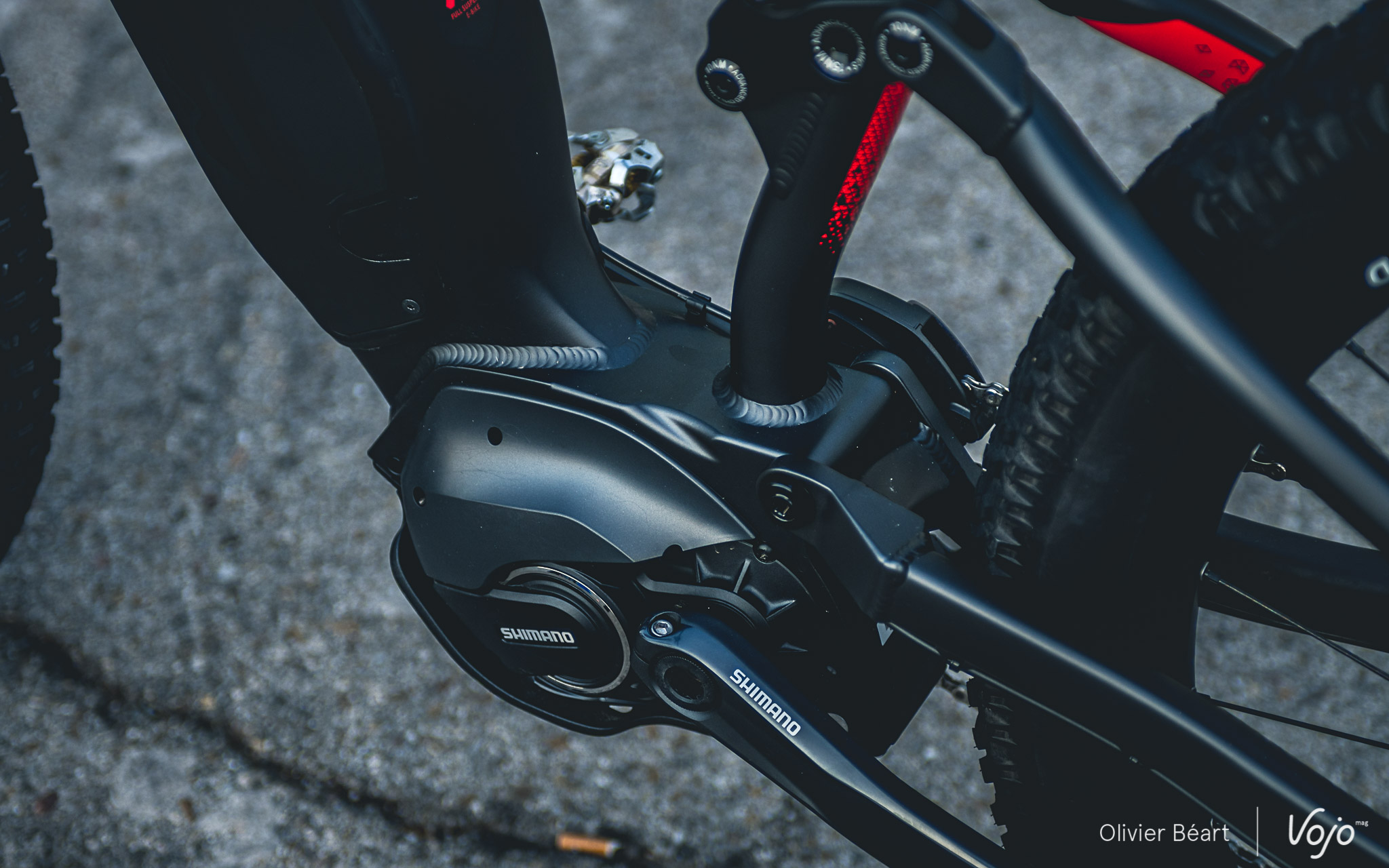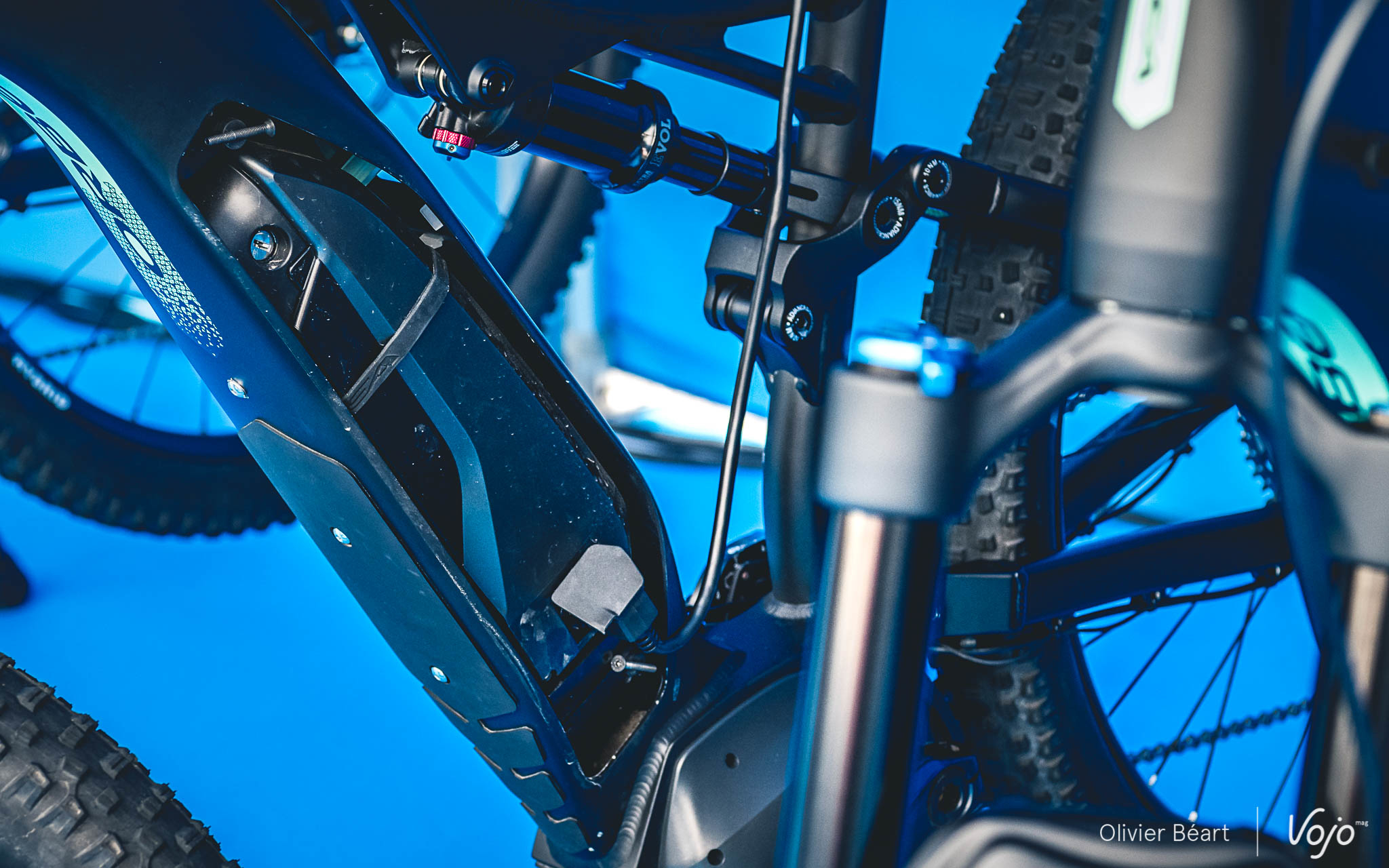 Cette intégration de la batterie externe est la solution retenue par Orbea pour, d’une part, tenir compte des demandes de la plupart des clients qui veulent une batterie intégrée, tout en préservant un comportement joueur et vif… souvent compromis par l’utilisation de la batterie intégrée Shimano. En effet, vu sa longueur, elle va remonter très haut près de la douille de direction et charger l’avant du vélo, avec le risque de détériorer la maniabilité.