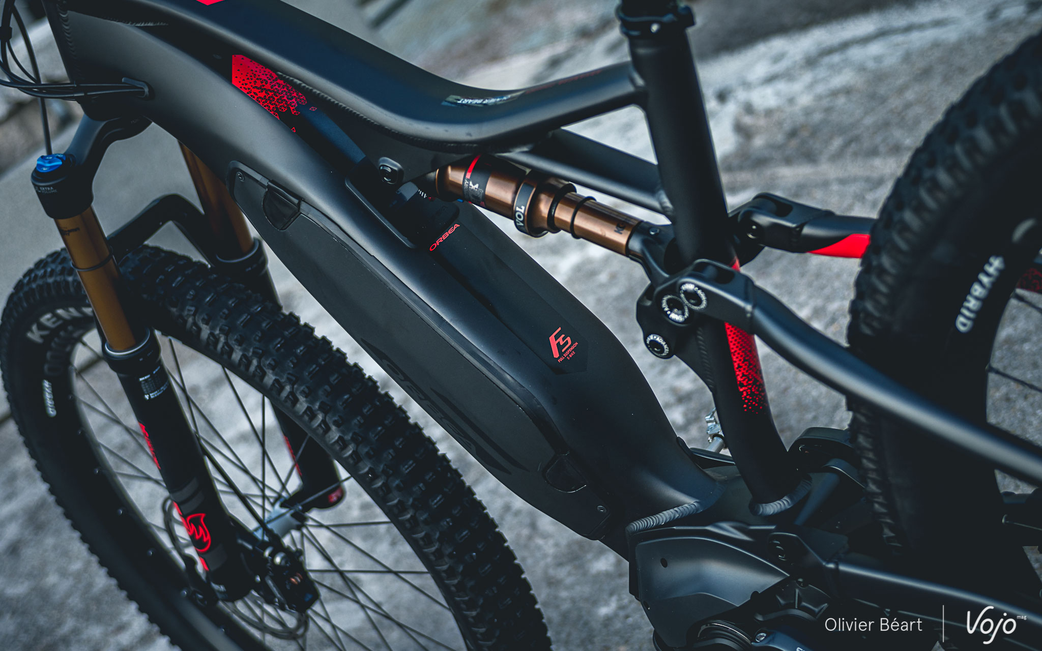 Face à cette situation, chaque marque y va de sa solution. A titre d’exemples dans les derniers vélos que nous avons pu essayer : BMC compose avec la batterie intégrée Shimano, Lapierre a recours a une intégration qui lui est propre, Commencal reste en batterie externe et d’autres comme Pivot… intègrent la batterie externe Shimano dans un châssis en carbone ! Chez Orbea, c’est cette dernière voie qui a aussi été choisie, mais en restant sur un cadre en aluminium.