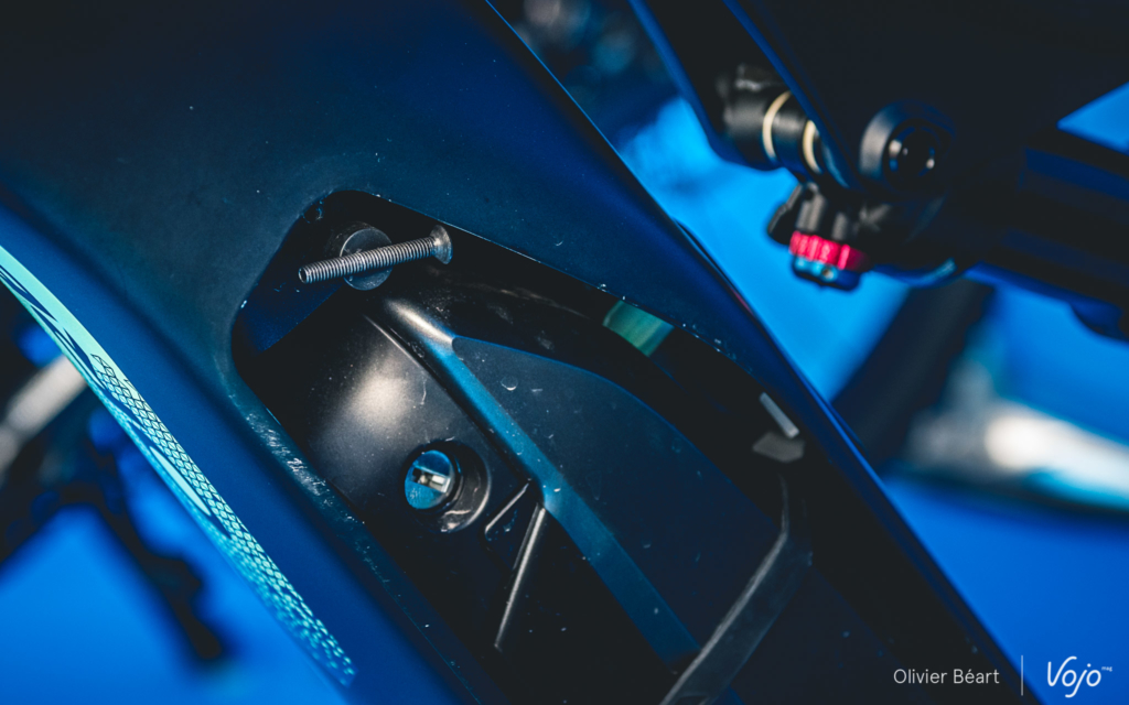 Pour faire rentrer la batterie classique sur le Wild FS, Orbea a choisi la voie latérale, ce qui permet d’avoir une bonne protection contre les chocs au niveau de la partie inférieure. « Vous mettriez votre iPhone ou votre GPS sous le tube diagonal de votre vélo ? Non, alors n’y mettons pas non plus la batterie qui est la pièce la plus chère du vélo », plaisante John Gantxegi, le « papa » du Wild FS. La batterie coulisse donc dans son logement, ce qui laisse la clé et le port de recharge accessibles, et le tout est refermé par un capot aimanté (qui peut également être sécurisé par deux vis même si elles ne sont pas indispensables).