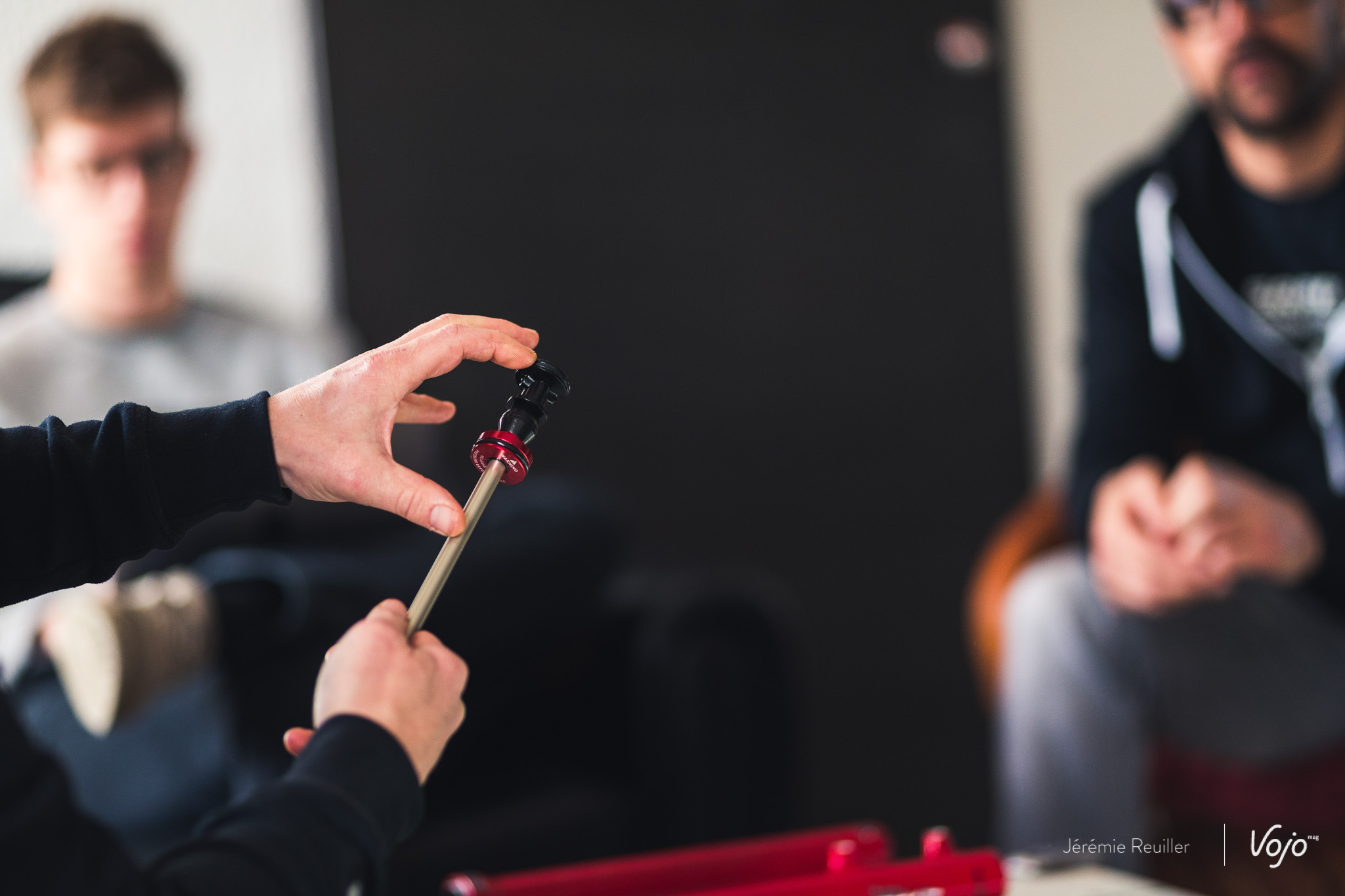 On règle la machine fraîchement assemblée dans l’atelier, la veille de notre premier jour de vélo. On repère évidemment la couleur rouge de la nouvelle Lyrik, qui sera également déclinée en noir, exit le blanc donc. L’amortisseur est en tous points semblable au précédent mais il cache quelques évolutions. On le comprendra plus tard en découvrant les entrailles des produits (lien).