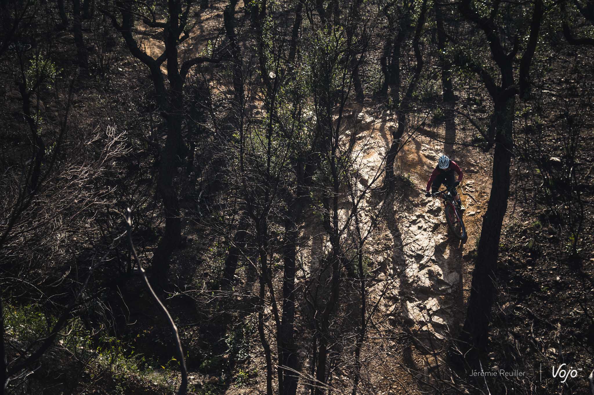 En traversant les forêts brûlées, l’Orbea Rallon R5 réussit le pari d’apporter confort et vivacité. Il pédale très bien et on utilise fréquemment la commande de blocage (qu’on vous présentera plus tard). L’Orbea nous accompagne en descente sans se montrer trop exigeant et quand on lâche les chevaux, le vélo est toujours là, c’est le résultat d’un travail en commun avec les suspensions. Merci !