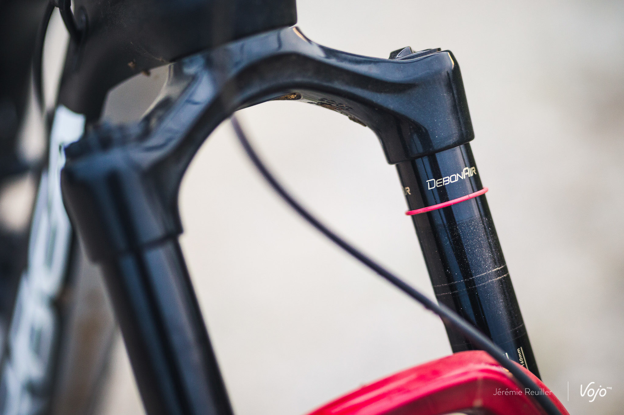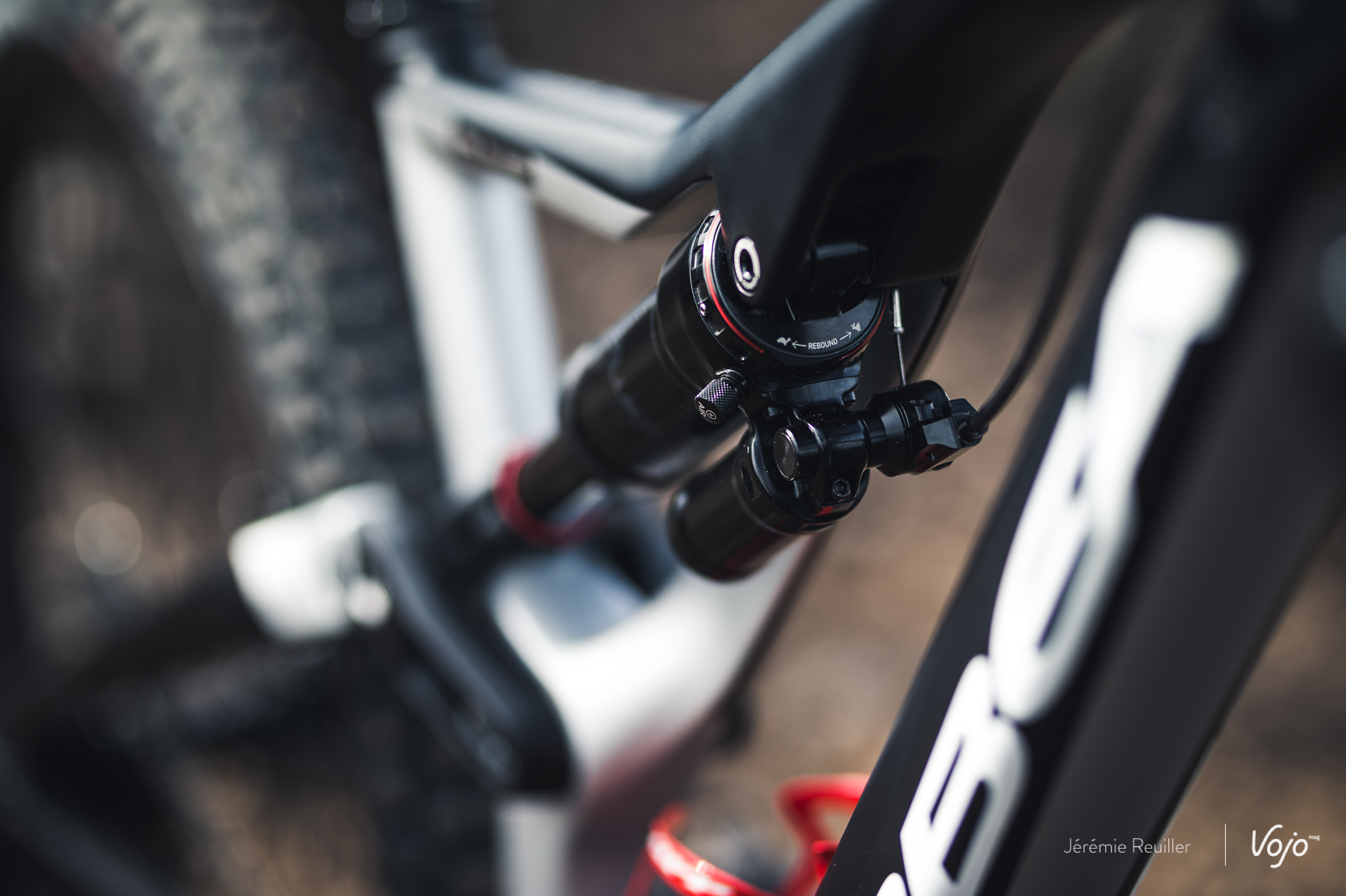 On règle la machine fraîchement assemblée dans l’atelier, la veille de notre premier jour de vélo. On repère évidemment la couleur rouge de la nouvelle Lyrik, qui sera également déclinée en noir, exit le blanc donc. L’amortisseur est en tous points semblable au précédent mais il cache quelques évolutions. On le comprendra plus tard en découvrant les entrailles des produits (lien).