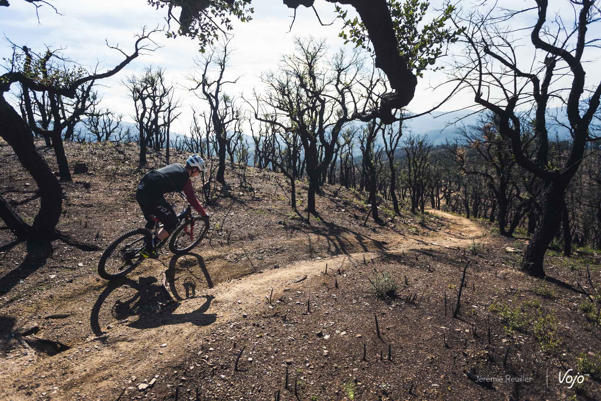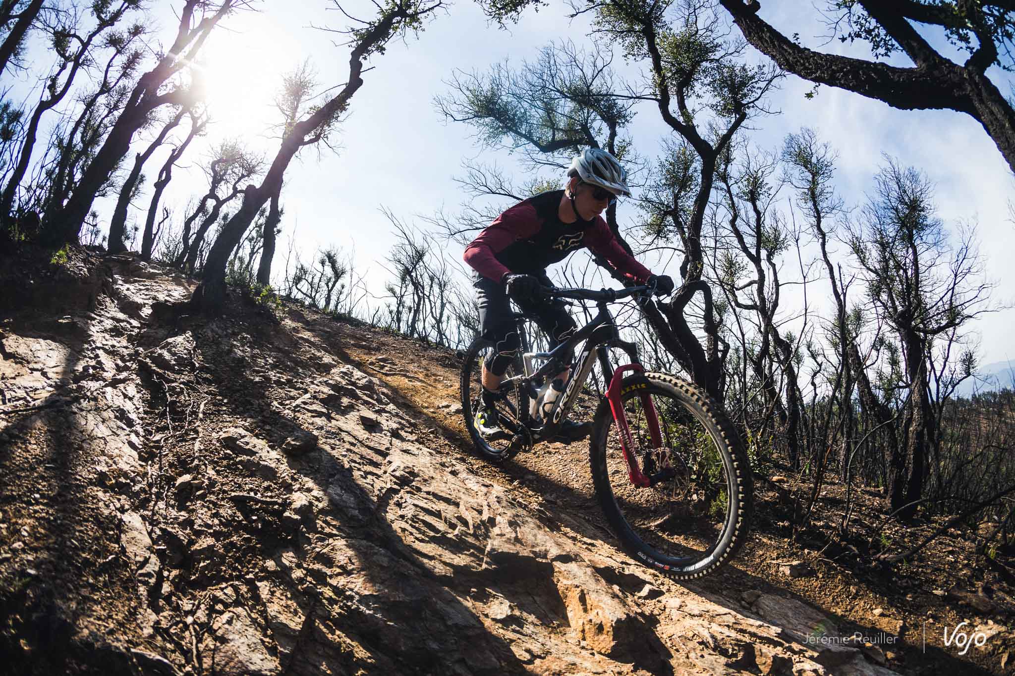 En traversant les forêts brûlées, l’Orbea Rallon R5 réussit le pari d’apporter confort et vivacité. Il pédale très bien et on utilise fréquemment la commande de blocage (qu’on vous présentera plus tard). L’Orbea nous accompagne en descente sans se montrer trop exigeant et quand on lâche les chevaux, le vélo est toujours là, c’est le résultat d’un travail en commun avec les suspensions. Merci !