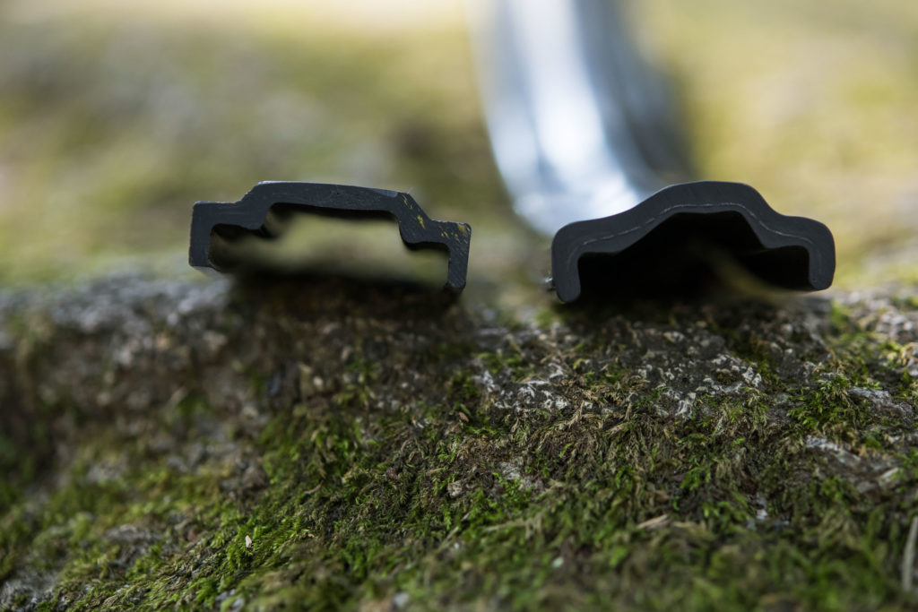 Comme cette jante simple pont n’a pas de chambre interne, les têtes des écrous dépassent à l’intérieur. Il y a donc un premier fond de jante à placer sous le tape tubeless qui assure l’étanchéité et de petites rondelles sont à mettre entre les jantes et les écrous pour éviter les casses sous les contraintes spécifiques imposées par ces jantes. Elles peuvent néanmoins être utilisées avec une chambre à air en dépannage.