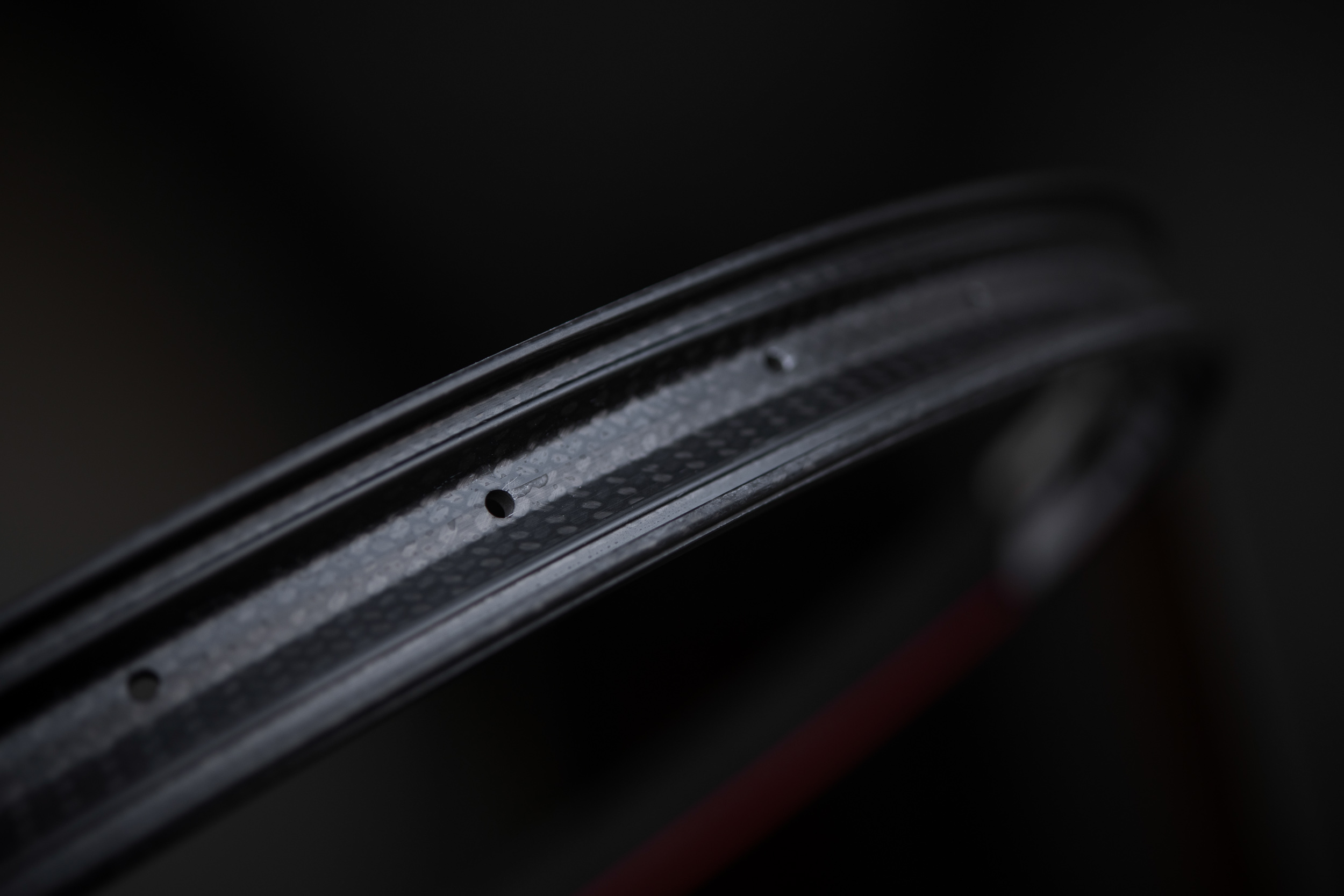 Le résultat final de ce travail de développement, ce sont des roues équipées de jantes plates de 30mm de largeur interne, avec un profil asymétrique, et de pas moins de 37,5mm de largeur externe. Comme il n’y a pas de double chambre, Zipp a pu jouer la carte d’une jante à la simple paroi très épaisse (près de 4mm !) qui mélange différentes couches de fibres différentes (UD, tressées, HM, HR,…) pour combiner leurs qualités respectives de résistance aux impacts, de déformation, de rigidité, de poids, etc.