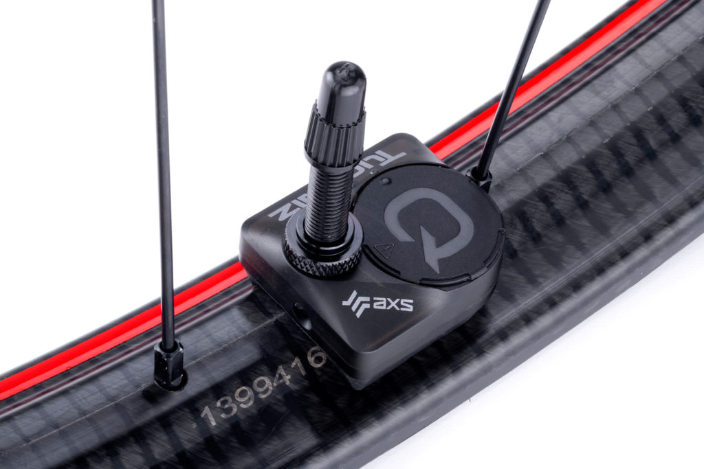 Ici, l’idée est de dire que c’est bien beau de rouler avec des jantes à la pointe de la technologie, mais cela ne sert pas à grand chose si la pression dans les pneus n’est pas correcte. Le principe est simple : les TyreWiz sont connectés à une application (qui disparaitra bientôt pour être intégrée à l’app AXS) qui permet de définir sa pression idéale pour chaque pneu, et une plage de X bars/psi dans laquelle on estime qu’il est acceptable de rouler.