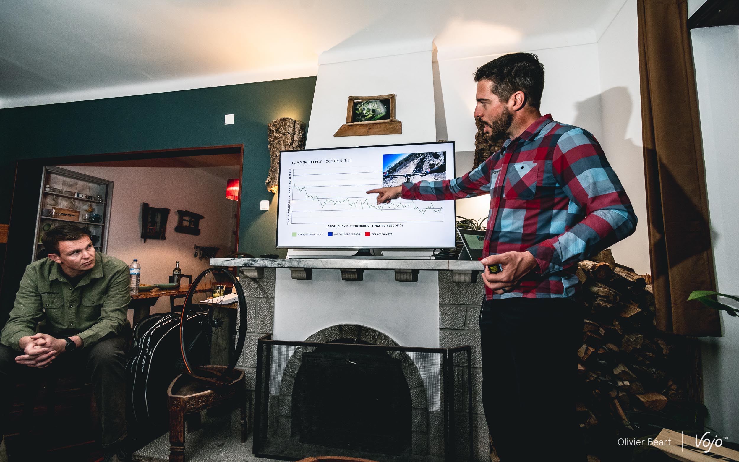 Les tests ne se sont d’ailleurs pas faits uniquement sur base du ressenti des pilotes, mais les retours terrain ont été croisés avec des mesures chiffrées, notamment avec des accéléromètres sur le cintre afin de voir s’il y avait bien un effet de dissipation au niveau des bras du pilote, et c’est bel et bien le cas selon les mesures effectuées par la marque, surtout sur les hautes fréquences, qui sont celles qu’on rencontre le plus lors d’un run en descente et qui fatiguent le pilote.