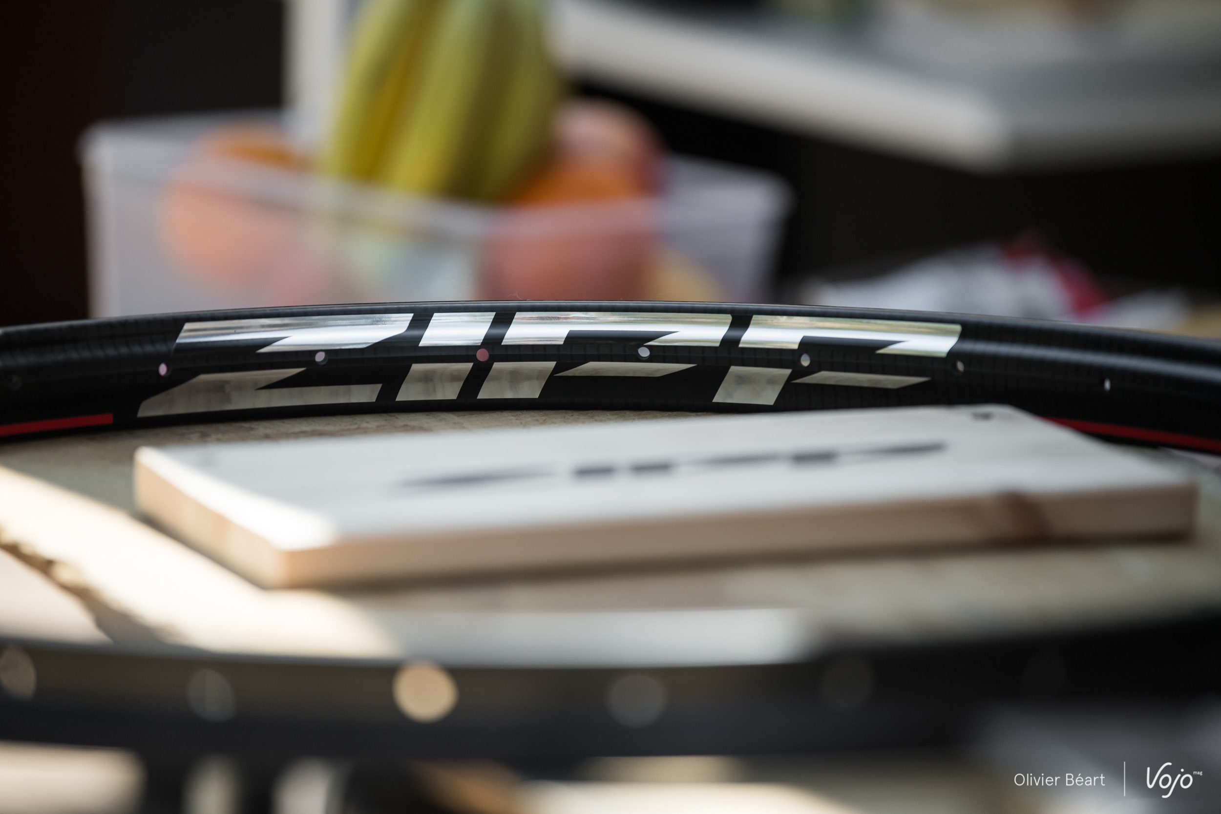 Nous avons eu l’occasion de le tester en statique, sur une jante seule équipée d’un levier au niveau du trou de valve : la jante est en effet capable de se déformer latéralement de plusieurs millimètres, quand une jante carbone classique reste immobile. Idem quand on appuie sur le haut de la jante, la Zipp s’ovalise légèrement quand les autres ne bronchent pas d’un poil.