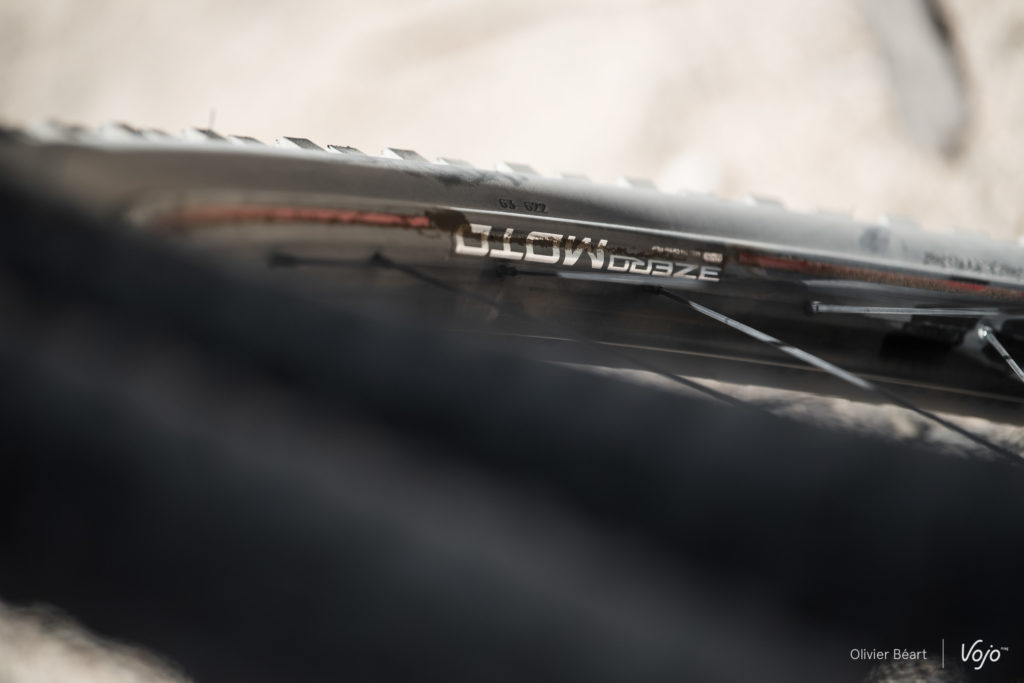 La force des jantes Zipp va résider dans leur capacité à se déformer, ce qui va permettre, outre la tenue de route, de préserver plus les pneus et de se passer d’inserts (type Cushcore, Pepi’s,…), très populaires dans la discipline mais qui ajoutent du poids. « Loin de moi l’idée de dire qu’on ne crève plus avec les jantes Zipp 3Zero Moto, mais nos tests semblent montrer assez clairement que cela réduit très fort les risques de pincement, même si on roule à très basse pression. En plus de 60.000km de tests avec 37 pilotes et 4 générations de jantes, nous n’avons eu que 2 crevaisons rapportées par nos testeurs, et imputables à un pincement entre la jante et le sol. A ce niveau, cela nous semble tout de même assez significatif. Sur les dernières versions, nous n’avons pas non plus encore eu de casse, et les résultats en labo montrent que nous avons sans aucun doute une des jantes les plus solides du marché, pour ne pas dire la plus solide », sourit Bastien Donzé.