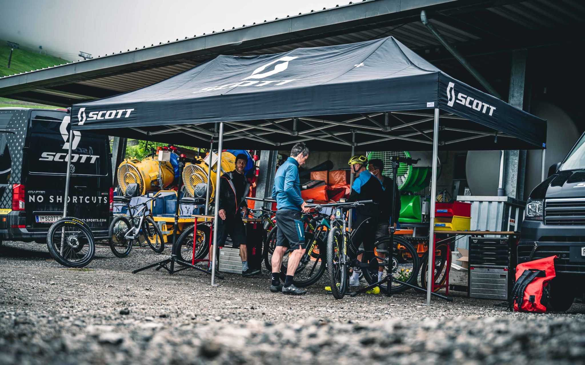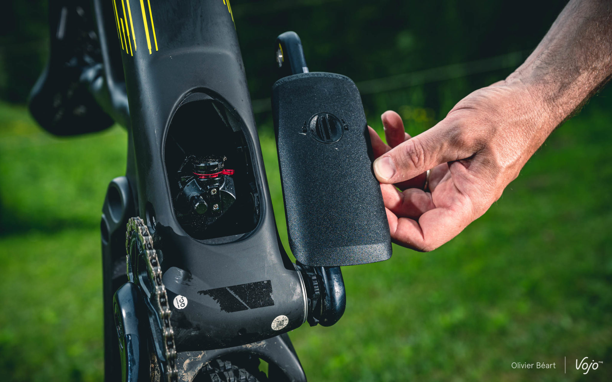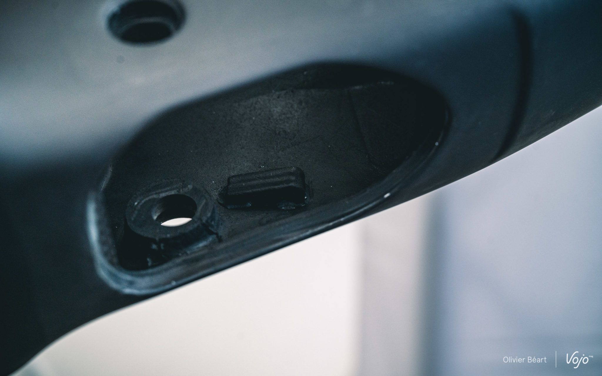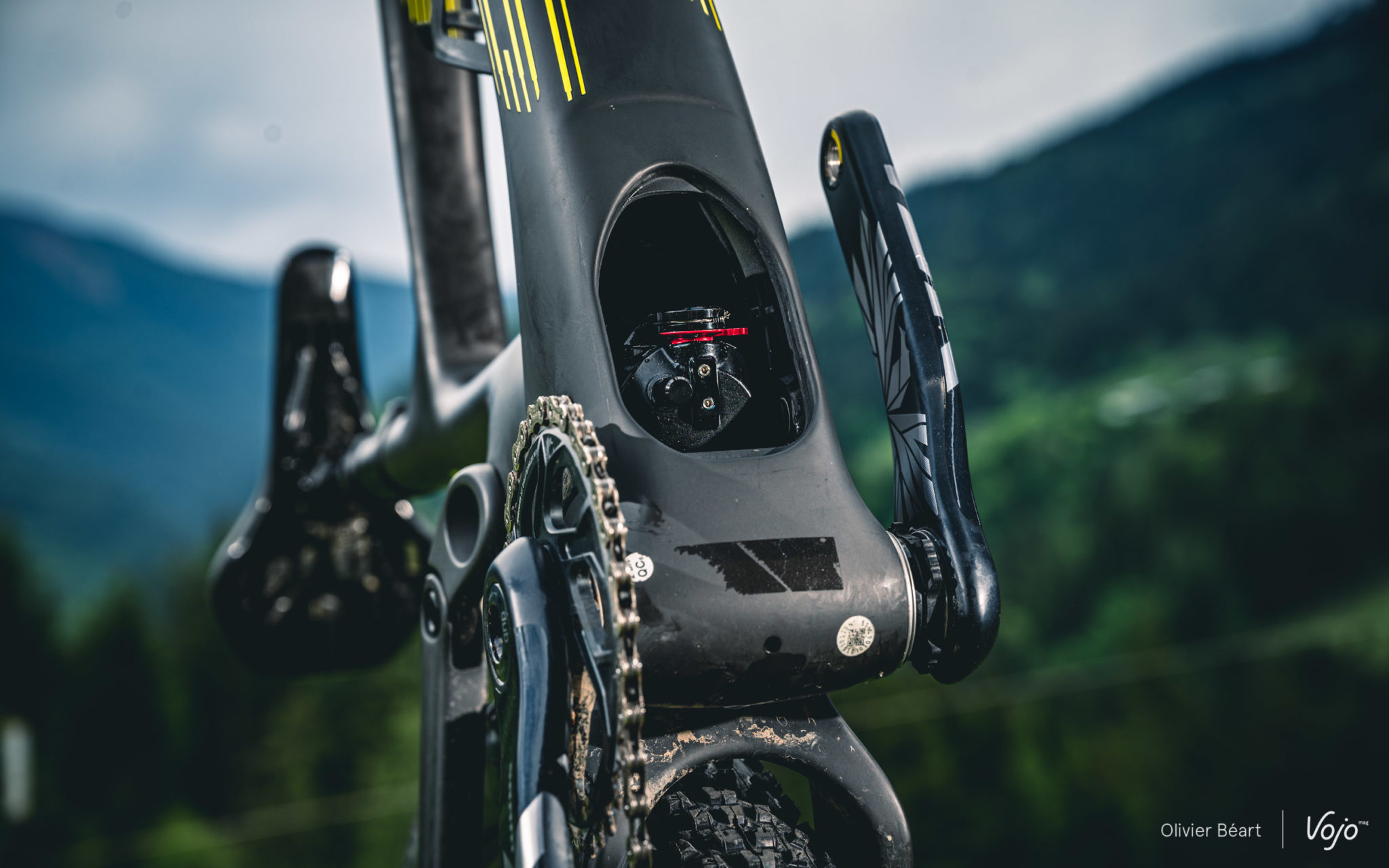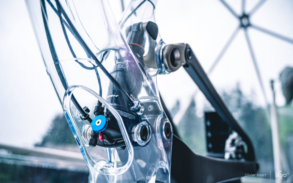 Pour ce qui est des réglages et des opérations de maintenance, une trappe a été placée sur le bas du tube diagonal. Sa forme a été soigneusement étudiée et un ajout de matière sur les bords sont aussi présents pour garantir que cela n’affecte pas la rigidité sans occasionner d’excès de poids. Elle donne un accès direct à la valve de gonflage, au câble du blocage au cintre et aux réglages du rebond. Contrairement à ce qu’on pourrait penser, l’accès et les opérations de maintenance sont très simples. Les mécanos du team Scott-Sram ont veillé au grain car pas question pour eux de perdre du temps à des opérations inutilement complexes. Scott ne veut pas non plus fâcher ses revendeurs, surtout en ces périodes où les ateliers croulent de boulot. Nous avons vu un démontage/remontage de l’amortisseur et celui-ci ne prend que quelques minutes.