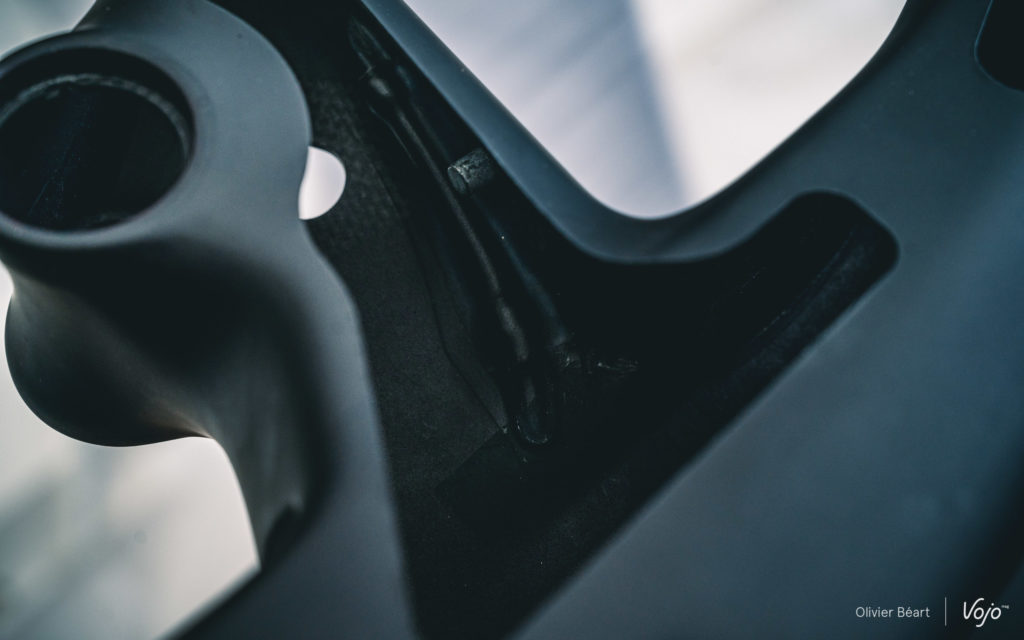 Outre la finition globale, très soignée grâce à la maîtrise des composites par Scott et au travail des designers, un travail important a été fait sur le silence de fonctionnement du vélo. On a déjà parlé des câbles et gaines soigneusement maintenus à l’intérieur du cadre, et cela se manifeste aussi à l’extérieur avec la présence de protections caoutchoutées sur les bases et haubans pour éviter tout bruit de chaîne. Une protection en fibres de carbone tressées est aussi présente au plus près du plateau au niveau de la base pour éviter les dégâts et le chainsuck à ce niveau.