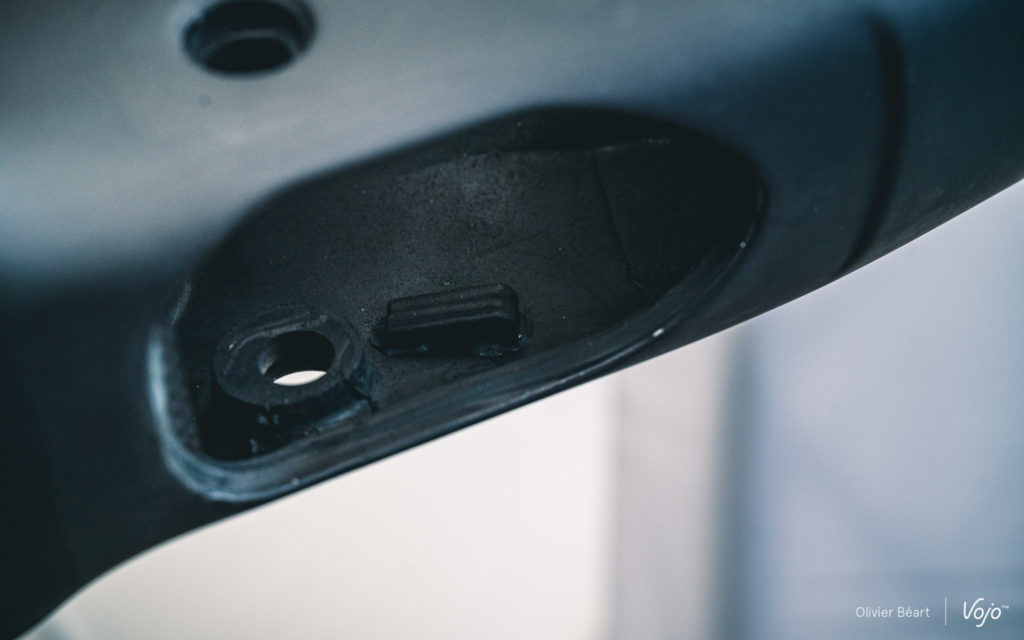 Cette trappe permet aussi un accès facile à cette zone toujours délicate pour le passage des gaines et Durits quand elles sont intégrées. Scott a d’ailleurs beaucoup soigné ce point sur le Spark, avec un guidage précis de la Durit de frein arrière, du câble de dérailleur et de celui de la tige télescopique pour qu’ils soient faciles à mettre en place (les mécanos du team veillent et les concepteurs ont entièrement suivi leurs recommandations) et qu’ils ne viennent en aucun cas user le cadre ou l’amortisseur. Enfin, cette porte de trappe en plastique composite, qu’on peut ouvrir à la main, est remplaçable facilement et sert aussi de protection de cette zone sensible.