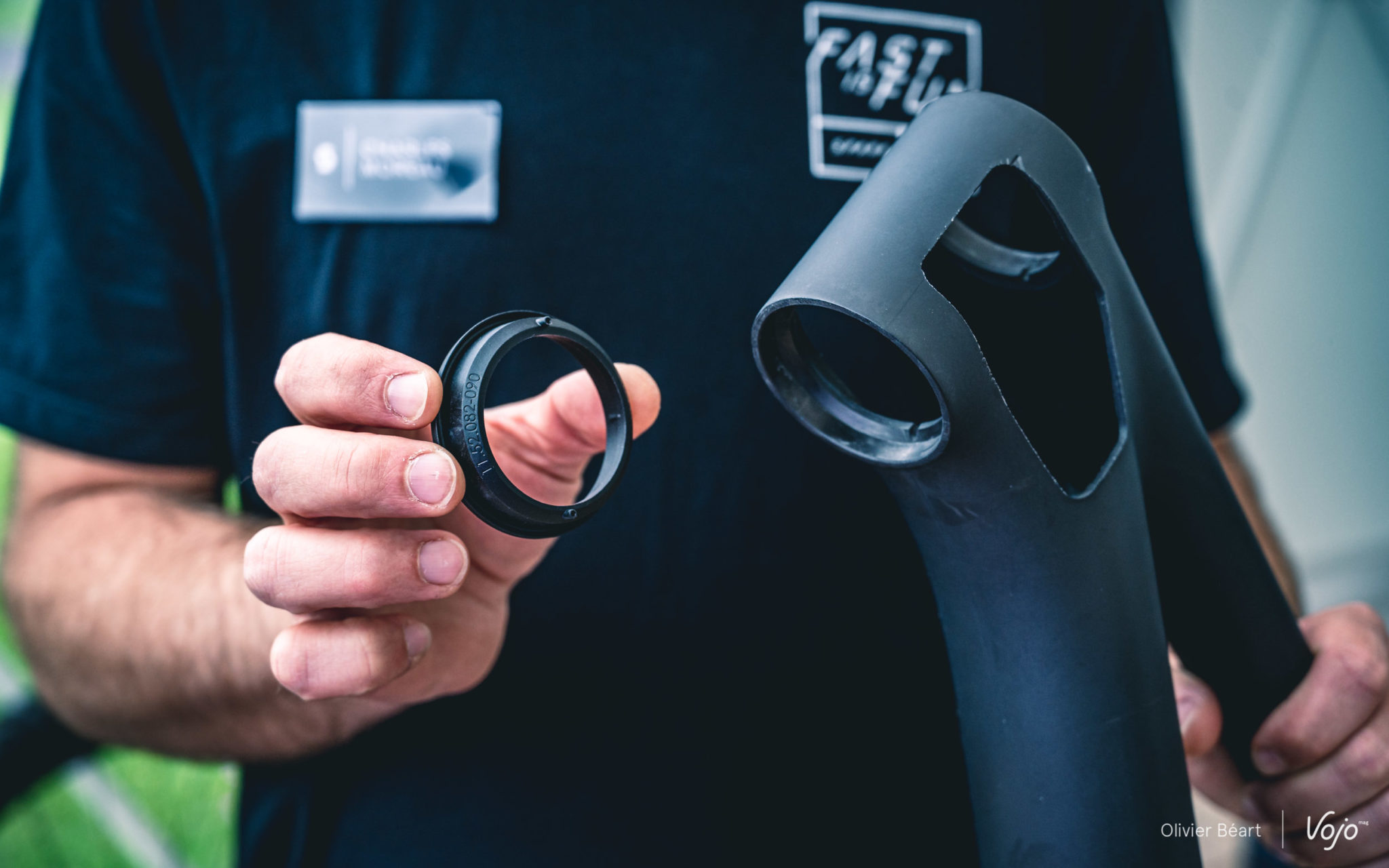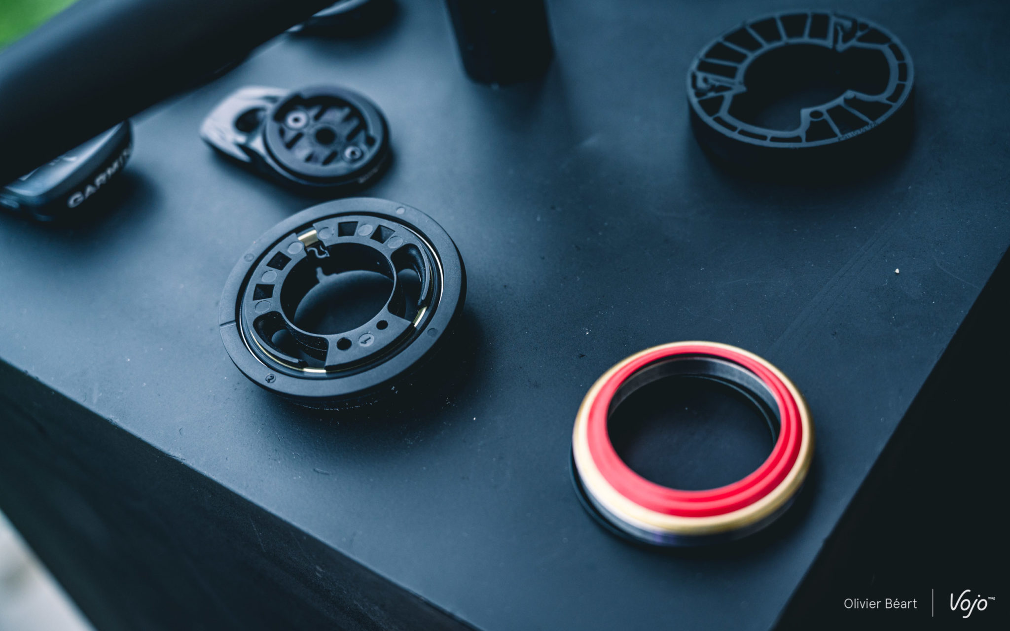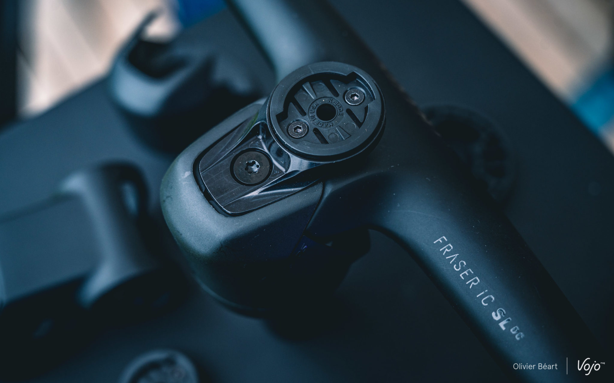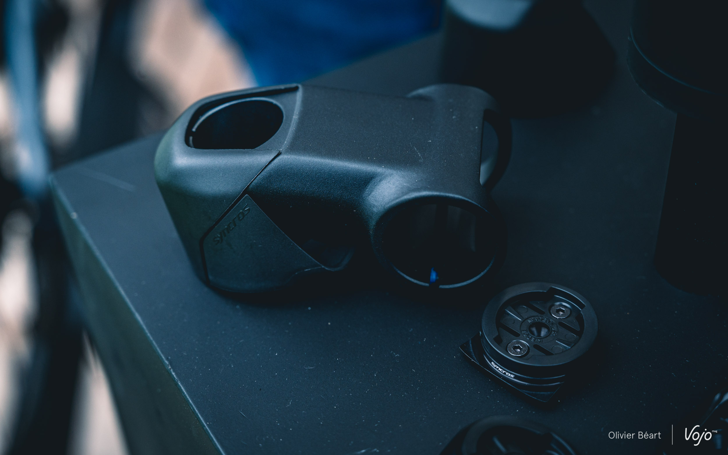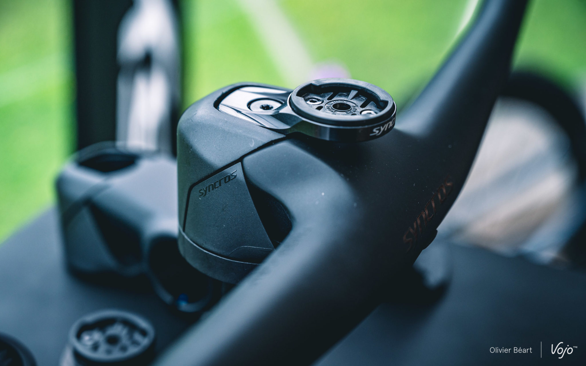 Une fois encore, cette intégration n’est pas qu’esthétique puisqu’elle permet de gagner du poids et de la rigidité structurelle sur le cadre puisqu’il n’y a plus de trous sur les côtés de la douille de direction. Pour le côté esthétique, le capot de potence et un cache du système de serrage de la potence ont été mis au point. Pour l’aspect pratique (qui est aussi lié à l’esthétique), il existe également un capot de potence avec support GPS et le cintre est équipé de deux trous sur le bas pour y placer un prolongateur en vue d’accueillir le GPS si on le préfère plus devant soi, ou une GoPro, ou encore une lampe (Syncros a d’ailleurs développé un nouveau modèle).