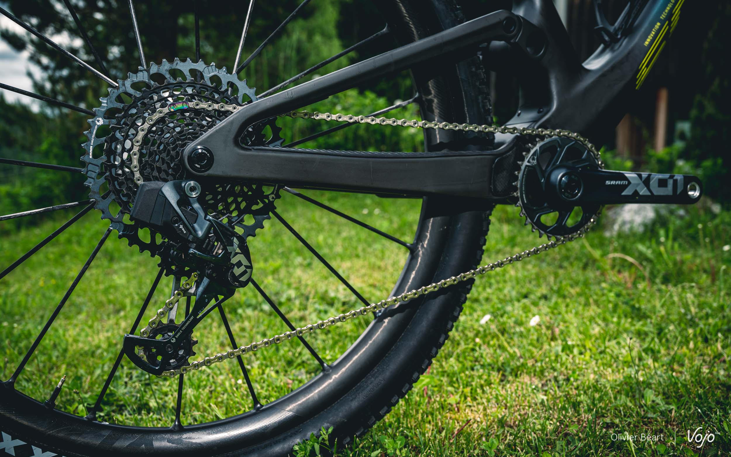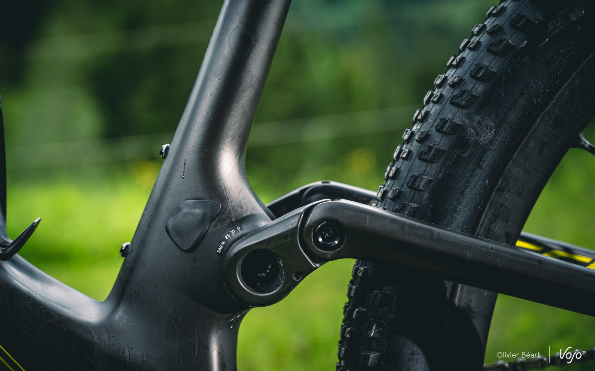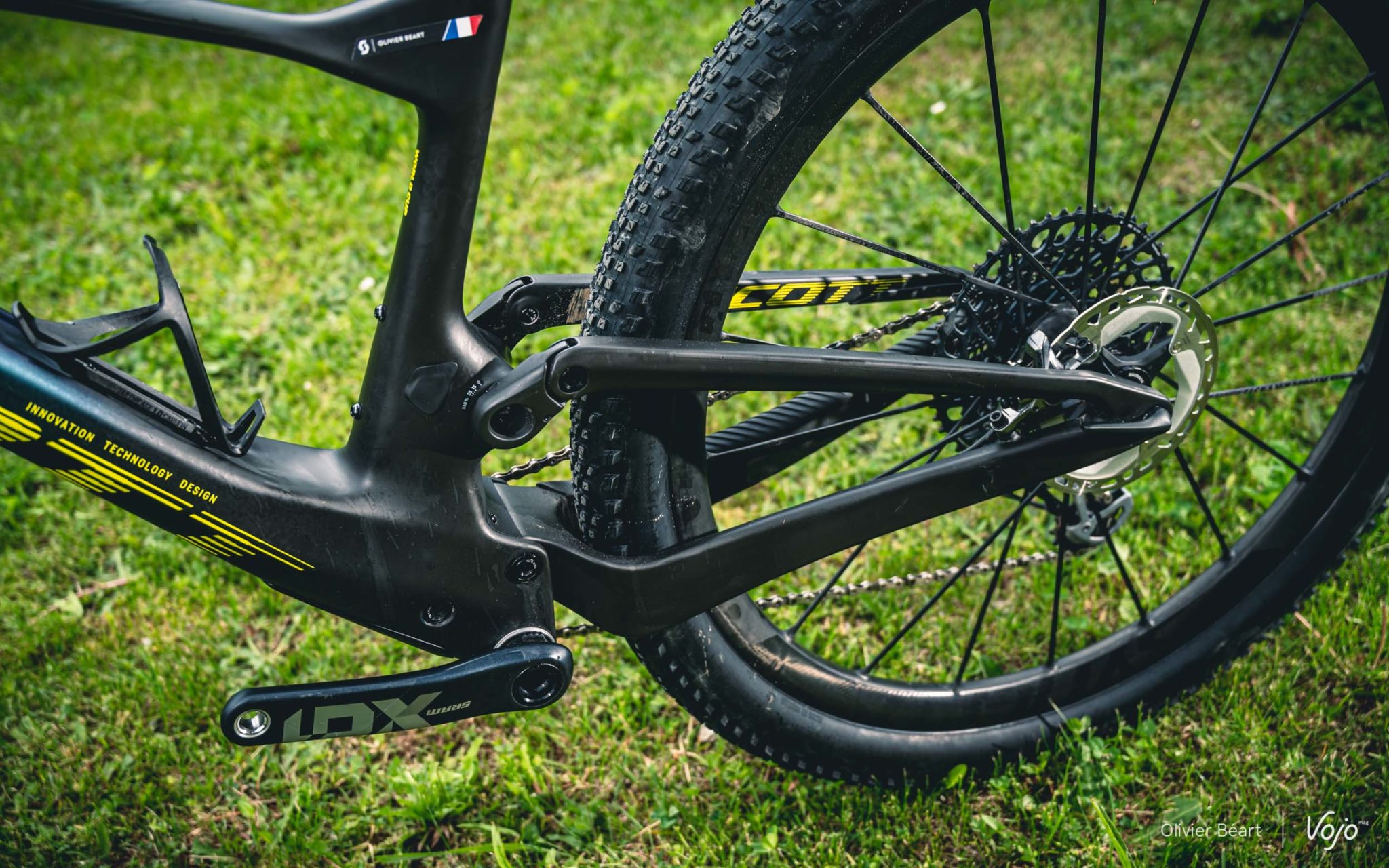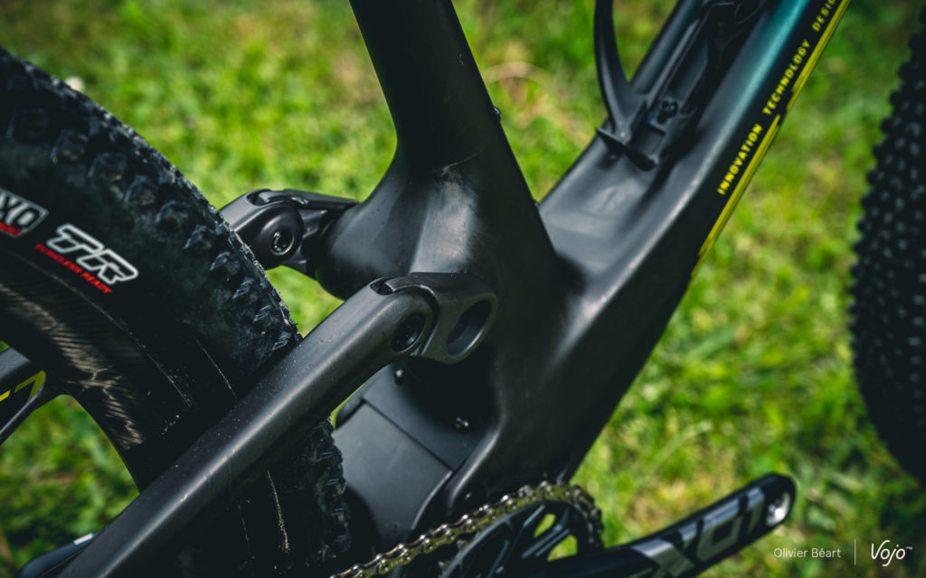 Tant qu’on en est à parler de l’arrière du vélo et du triangle arrière très compact, parlons aussi du dégagement du pneu. On le sait, depuis quelques années, les pilotes de coupe du monde utilisent des pneus de plus en plus large qui leur permettent d’obtenir un meilleur grip et plus de vitesse sur les parcours de niveau mondial devenus très techniques. S’ils gardent des dessins et des carcasses très typées XC/rendement, le ballon de ces pneus est très proche de celui de modèles d’enduro. Il faut donc de l’espace au niveau du cadre pour les accueillir.