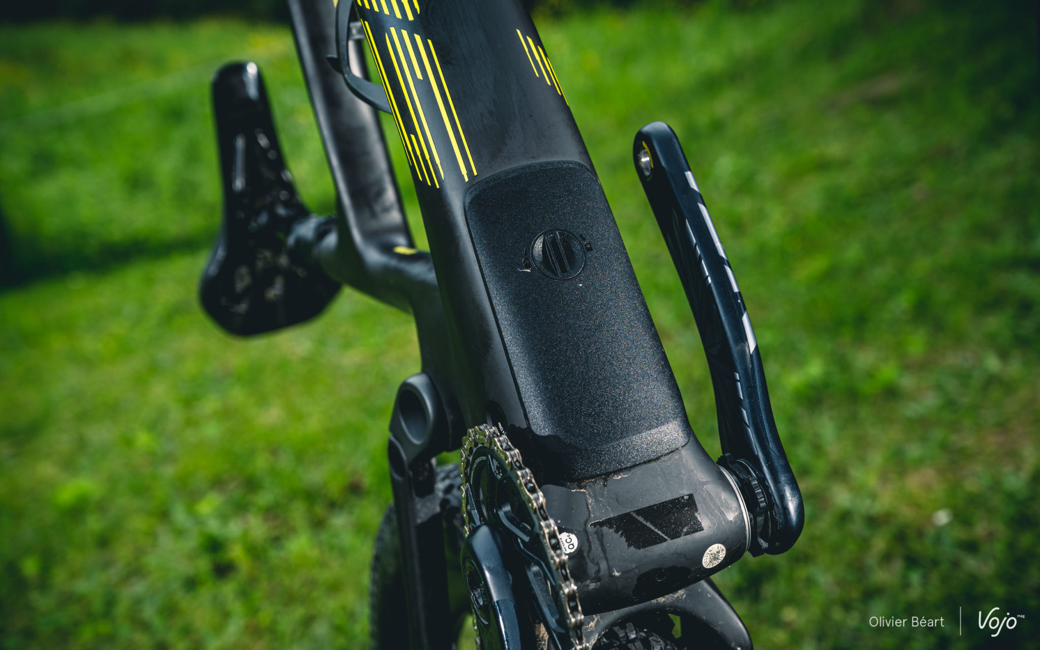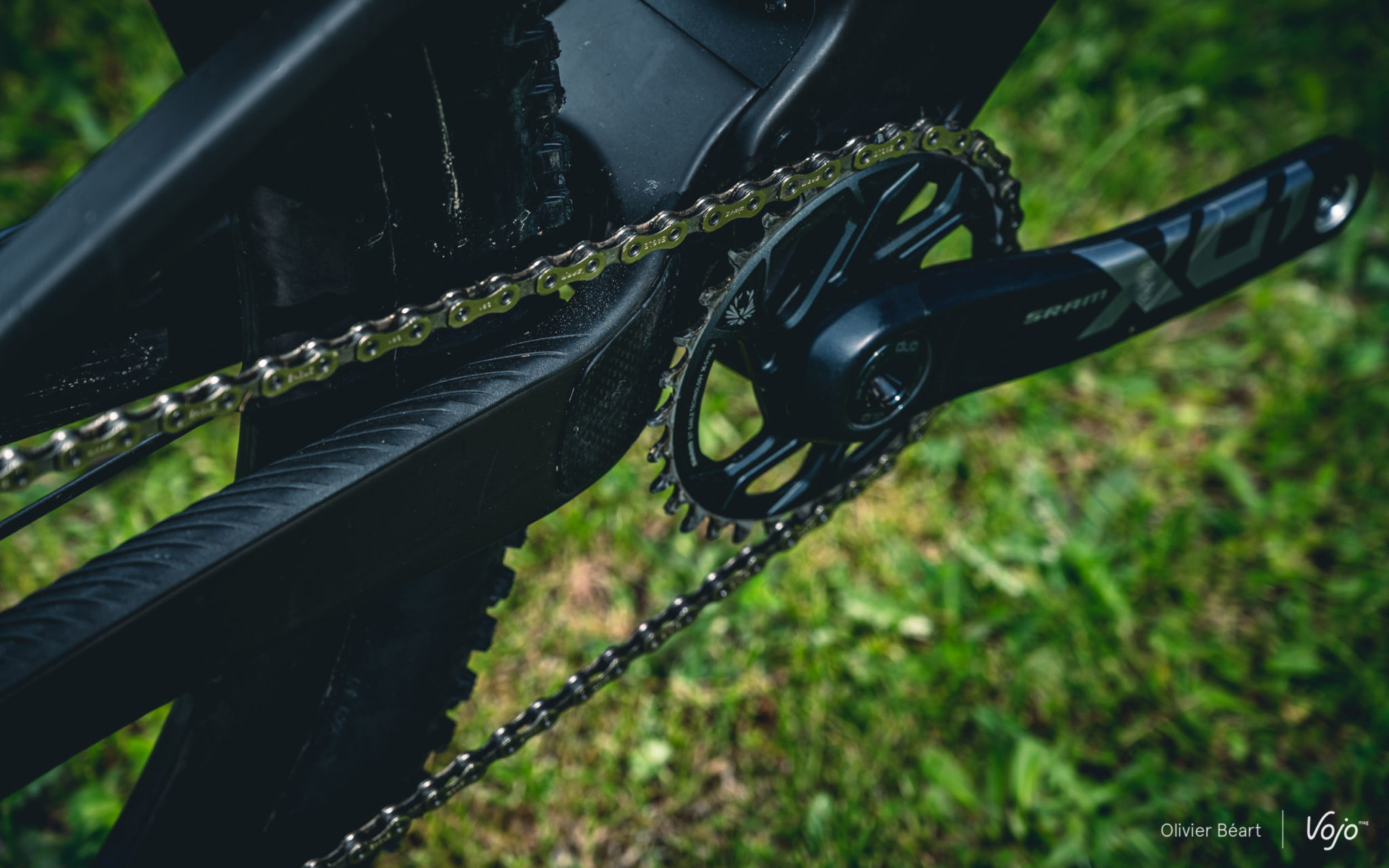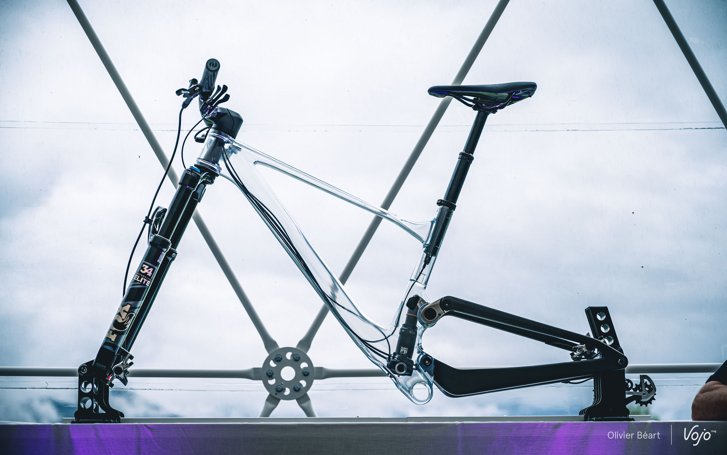 Tant qu’on en est à parler de l’arrière du vélo et du triangle arrière très compact, parlons aussi du dégagement du pneu. On le sait, depuis quelques années, les pilotes de coupe du monde utilisent des pneus de plus en plus large qui leur permettent d’obtenir un meilleur grip et plus de vitesse sur les parcours de niveau mondial devenus très techniques. S’ils gardent des dessins et des carcasses très typées XC/rendement, le ballon de ces pneus est très proche de celui de modèles d’enduro. Il faut donc de l’espace au niveau du cadre pour les accueillir.