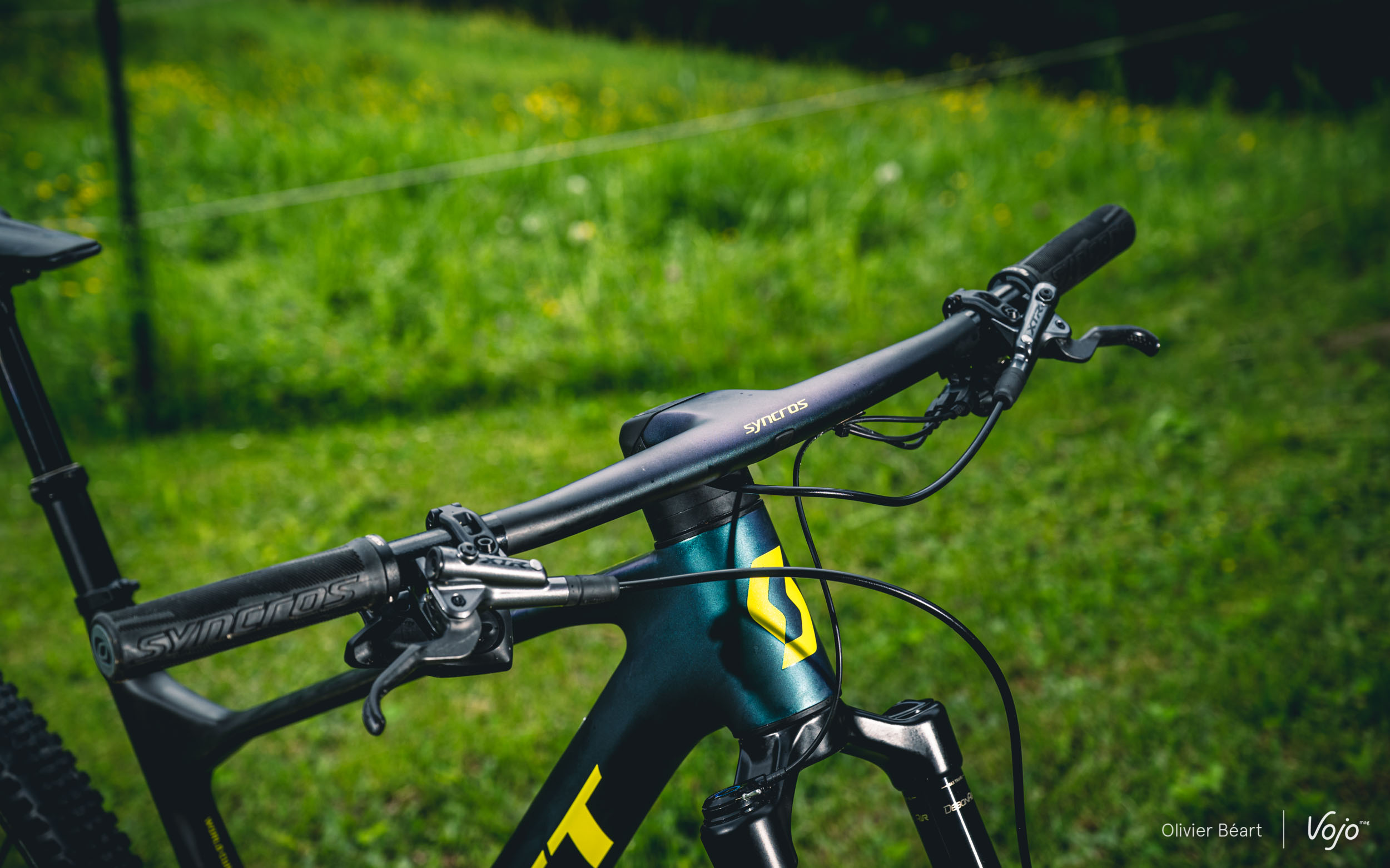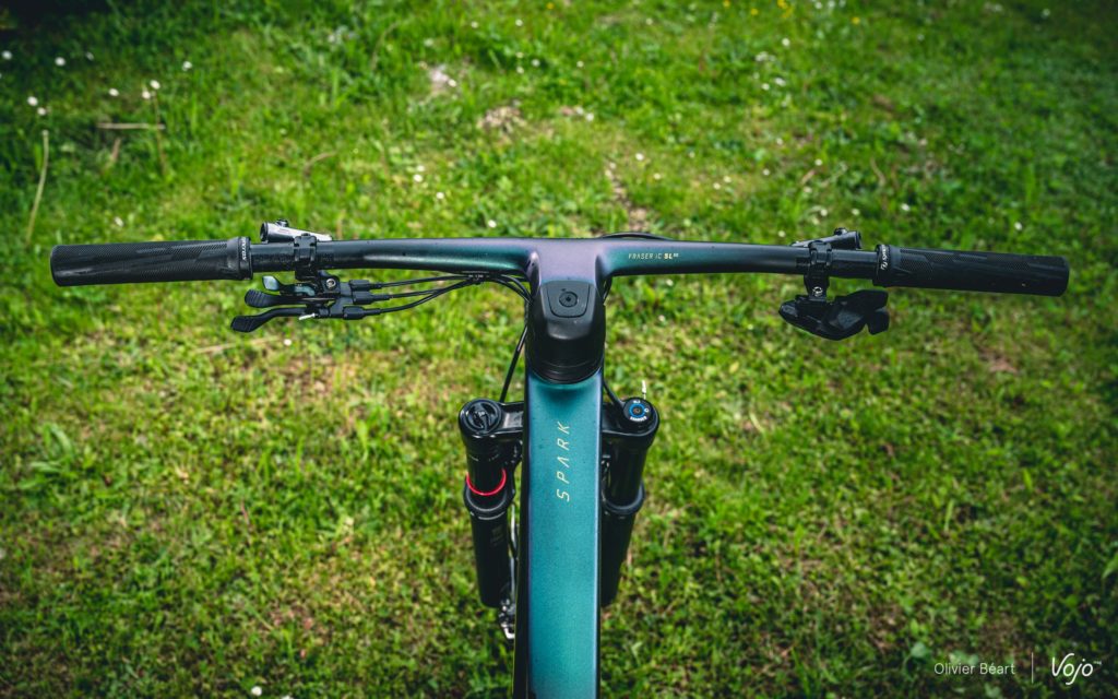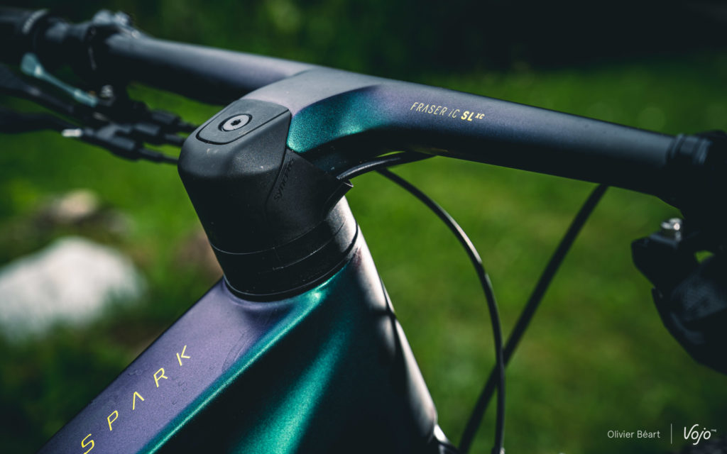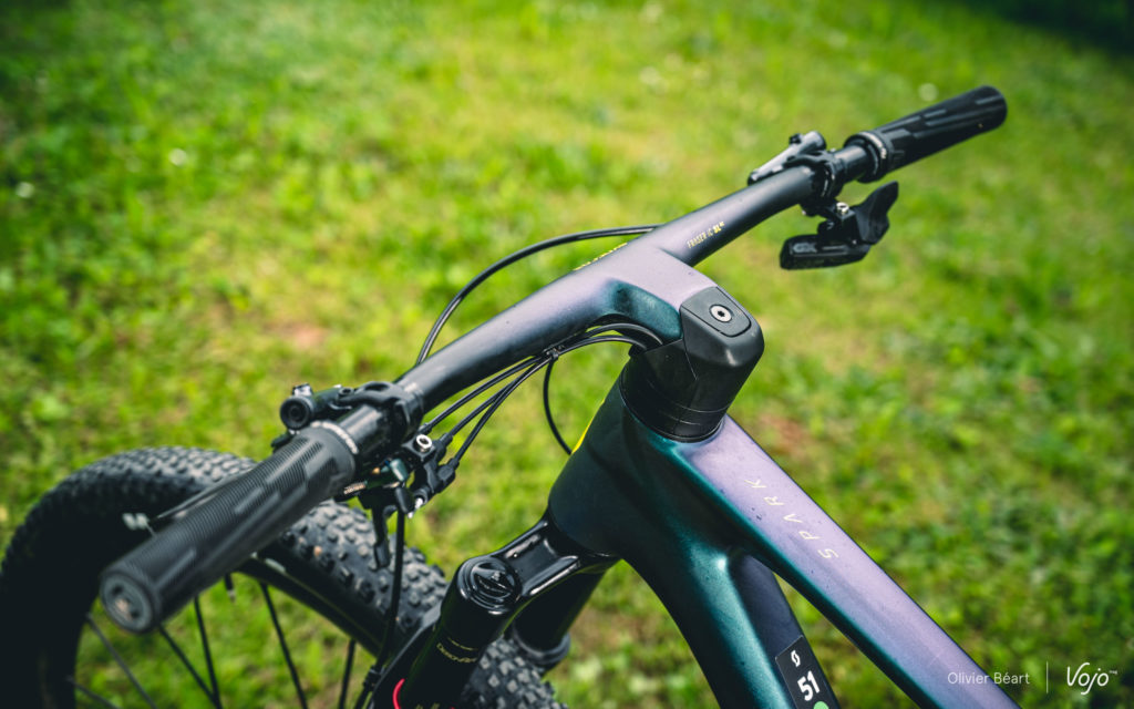 Il n’y a pas que sur l’amortisseur qu’un travail d’intégration a été fait. Le poste de pilotage a aussi fait l’objet d’un gros travail en synergie avec Syncros, la marque d’accessoires du groupe Scott. Les deux équipes ont travaillé main dans la main sur ce projet afin d’aller plus loin que le combo cintre-potence Fraser déjà existant.
