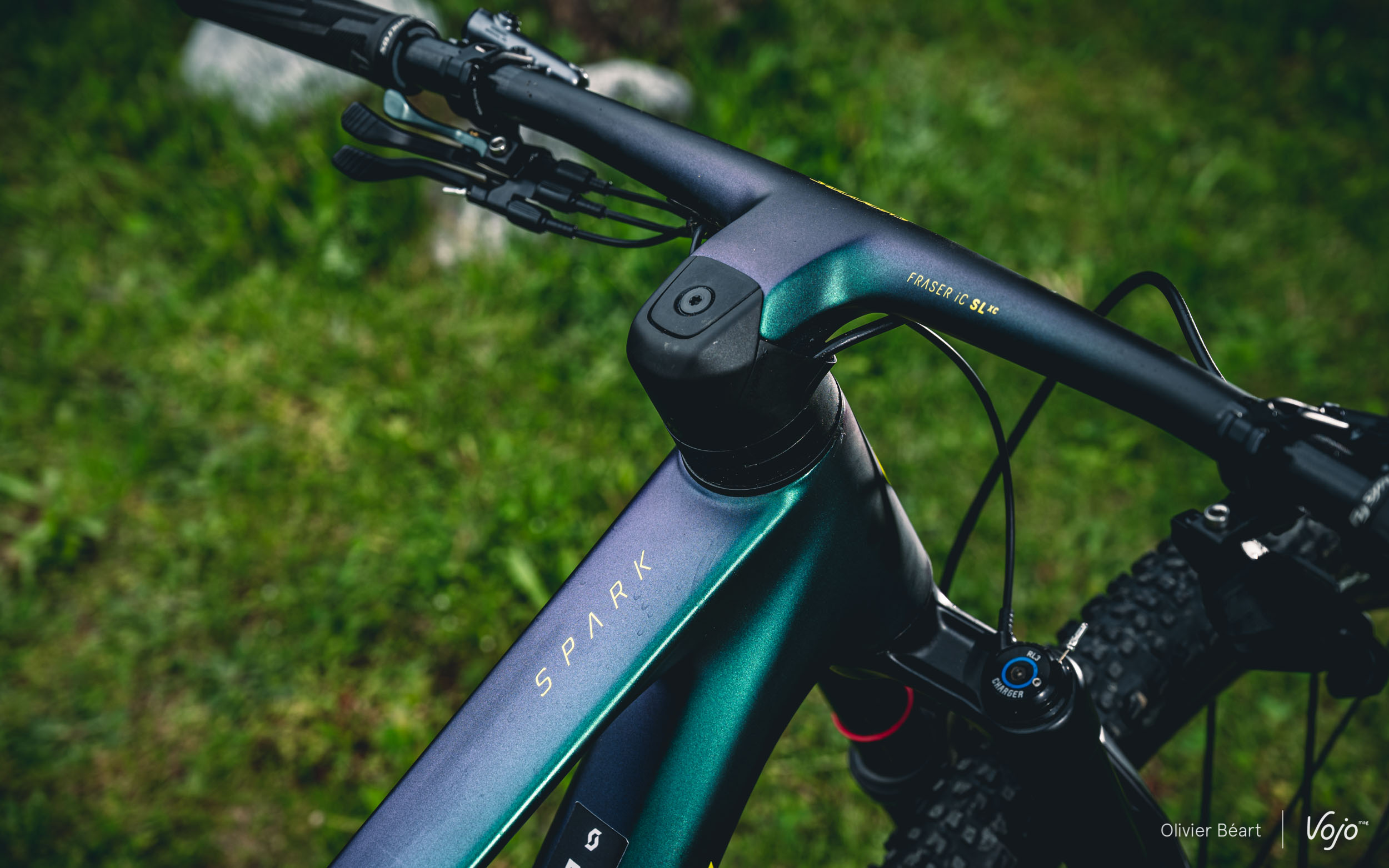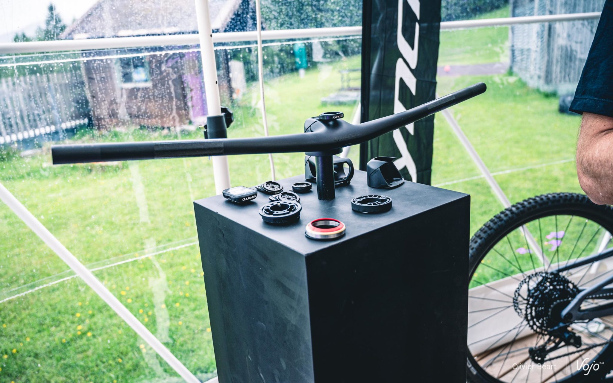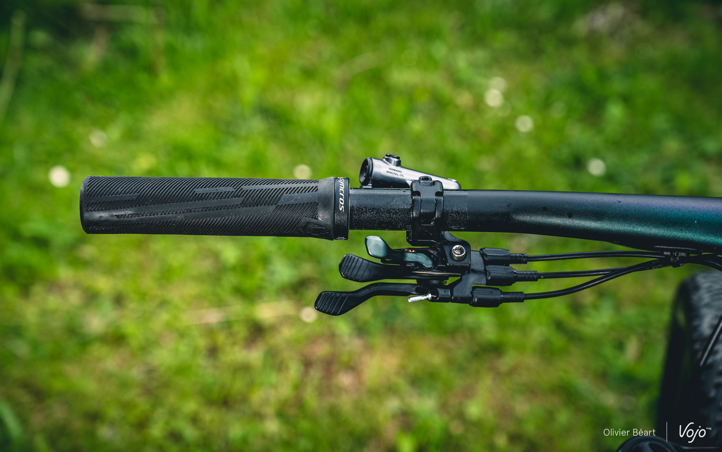 Il n’y a pas que sur l’amortisseur qu’un travail d’intégration a été fait. Le poste de pilotage a aussi fait l’objet d’un gros travail en synergie avec Syncros, la marque d’accessoires du groupe Scott. Les deux équipes ont travaillé main dans la main sur ce projet afin d’aller plus loin que le combo cintre-potence Fraser déjà existant.