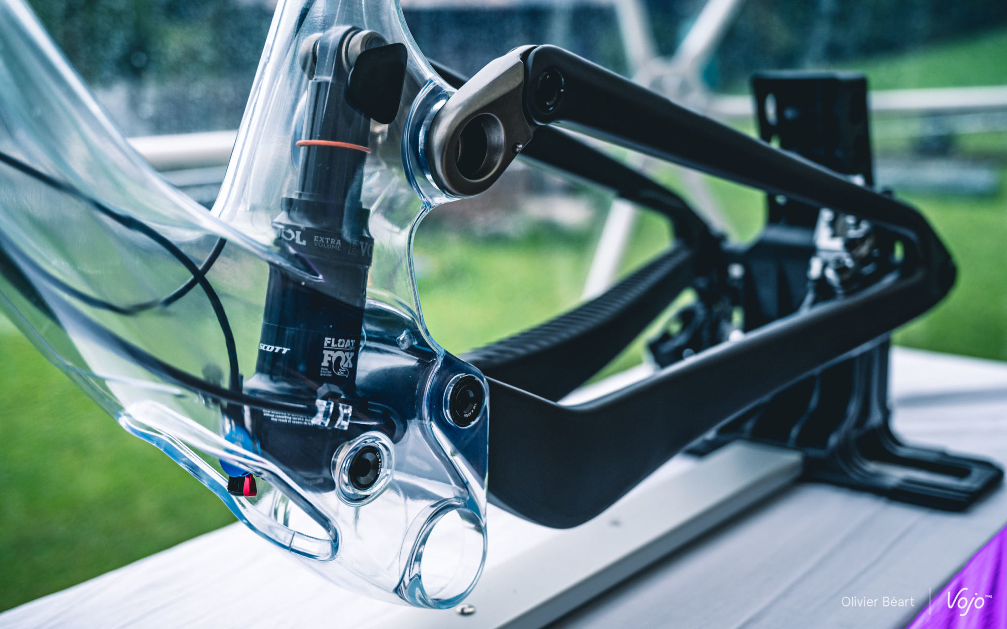 Lors de cette réflexion, Scott a examiné les brevets existants dans ce domaine et s’est rapproché de la petite marque suisse Bold, qui a mis au point un procédé d’intégration de l’amortisseur dans le cadre depuis quelques années déjà. Et le « match » s’est fait très rapidement ! Bold cherchait un partenaire industriel de grande taille pour poursuivre son développement et Scott trouvait avec Bold une excellente manière (brevetée) d’intégrer l’amortisseur dans le cadre. Pour la petite histoire, Bold fait désormais partie intégrante du groupe Scott. Et pas question de juste prendre les beaux morceaux puis de laisser la marque dépérir ! Les responsables du groupe nous ont annoncé de nouveaux développements importants pour Bold qui est destiné à devenir la marque ultra premium du groupe afin de proposer des produits encore plus originaux et exclusifs, destinés à aller chasser sur le terrain de marques mythiques comme Intense ou Yeti. Fin de la parenthèse.