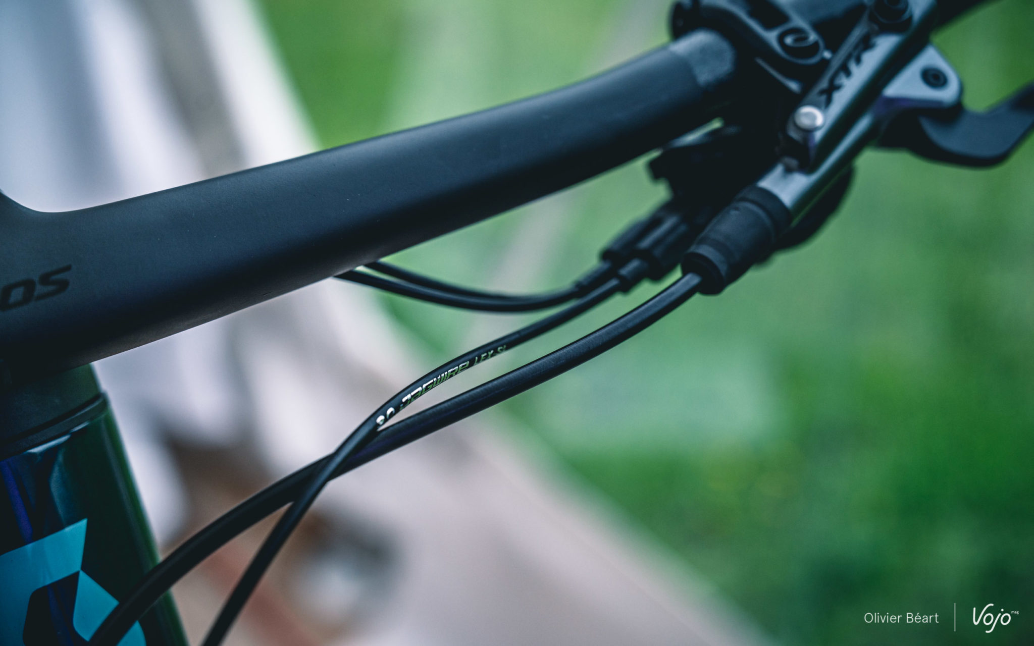 L’idée est ici d’intégrer les câbles et Durit en les faisant rentrer dans le cadre au niveau du jeu de direction. Scott a repris les grandes lignes du procédé mis au point par Acros, spécialiste allemand du jeu de direction, en l’adaptant légèrement et surtout en concevant son propre poste de pilotage Syncros adapté. Sans être intégrés au cintre (les composants de grande série ne sont pas encore prêts pour cela), l’idée est ici de faire une « semi-intégration » des gaines sous le cintre avant qu’elles disparaissent dans le cadre sur les côtés de la potence.
