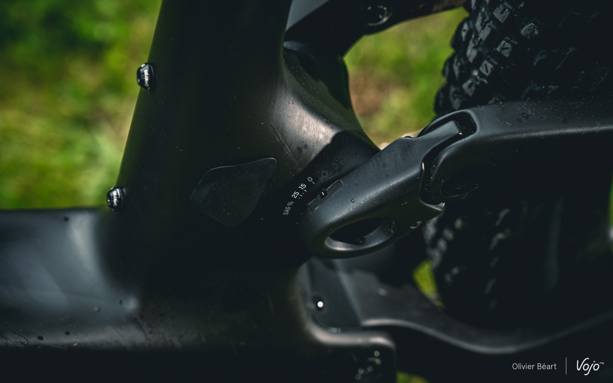 Au niveau de la biellette haute, un indicateur de SAG permet de visualiser facilement si le réglage de l’enfoncement statique de la suspension est correct, malgré l’absence de contact visuel direct avec l’amortisseur qui sert habituellement de référence de mesure. Un petit trou a aussi été fait dans le tube de selle pour accéder à la vis de fixation haute de l’amortisseur sur la biellette. A noter que l’espace intérieur est suffisant pour accueillir de nombreux modèles d’amortisseur, y compris avec chambre d’air plus volumineuse. Sur la gamme Spark, Scott travaille d’ailleurs avec Fox, RockShox et aussi X-Fusion sur les modèles d’entrée de gamme.