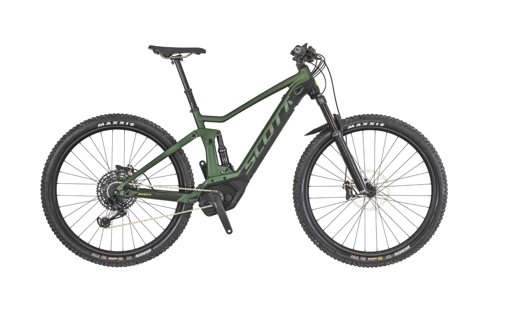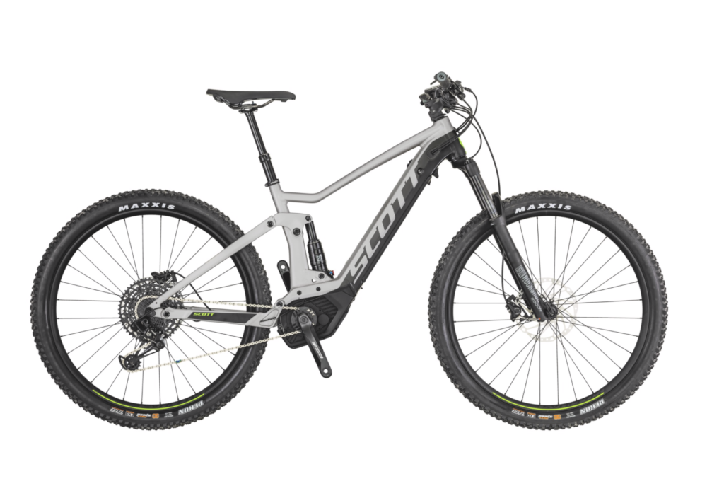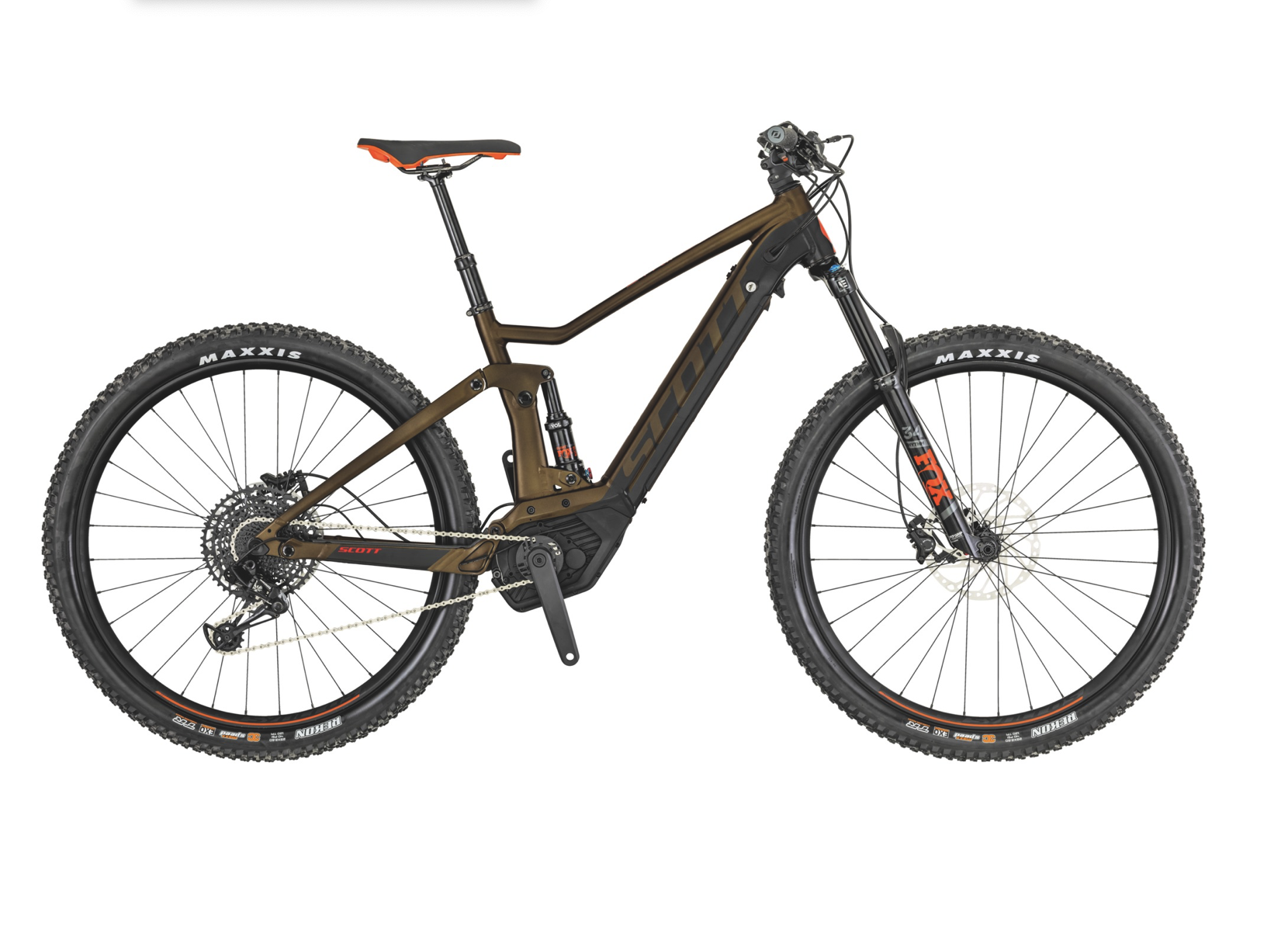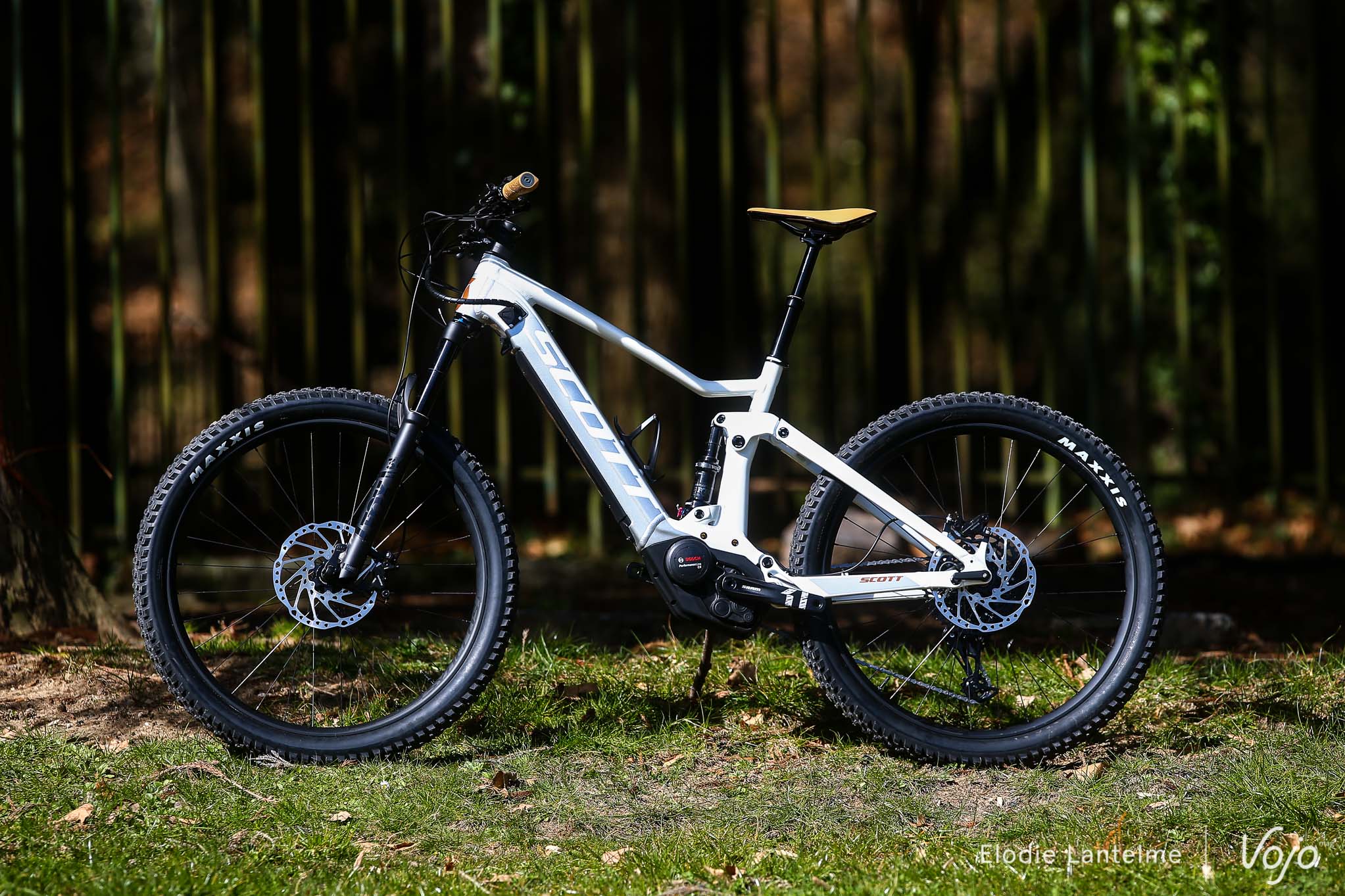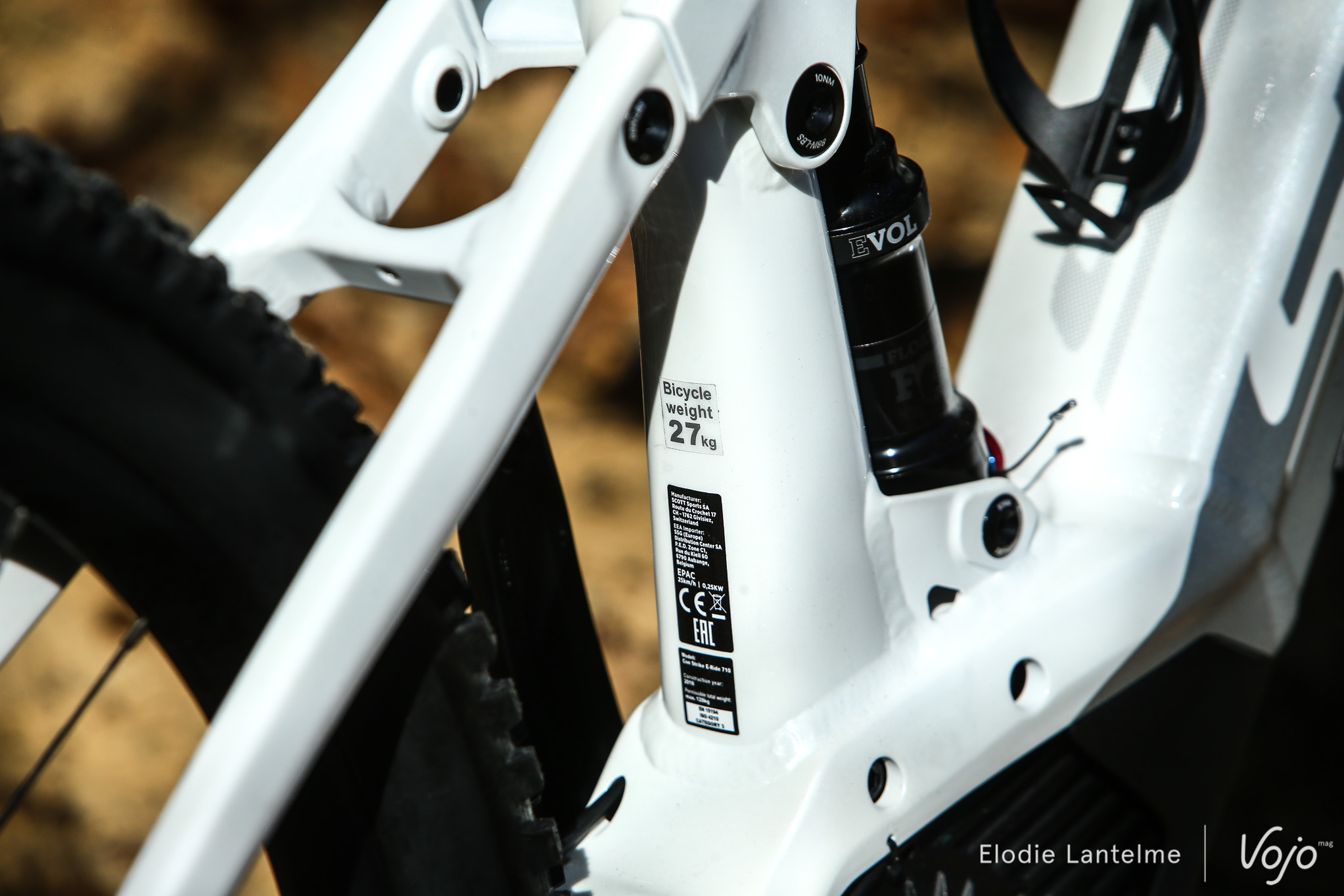 Le cœur de la géométrie et de la cinématique Scott a été décliné, conservant le Four Bar Linkage et la fixation Trunnion pour l’amortisseur, ici un Fox Float, couplé à l’avant avec la Fox 34 Rhythm spécifique ebike, tous deux en 140 mm.