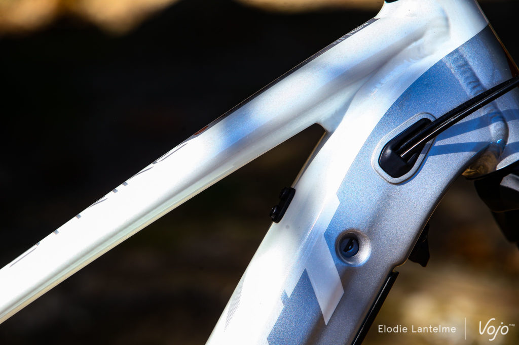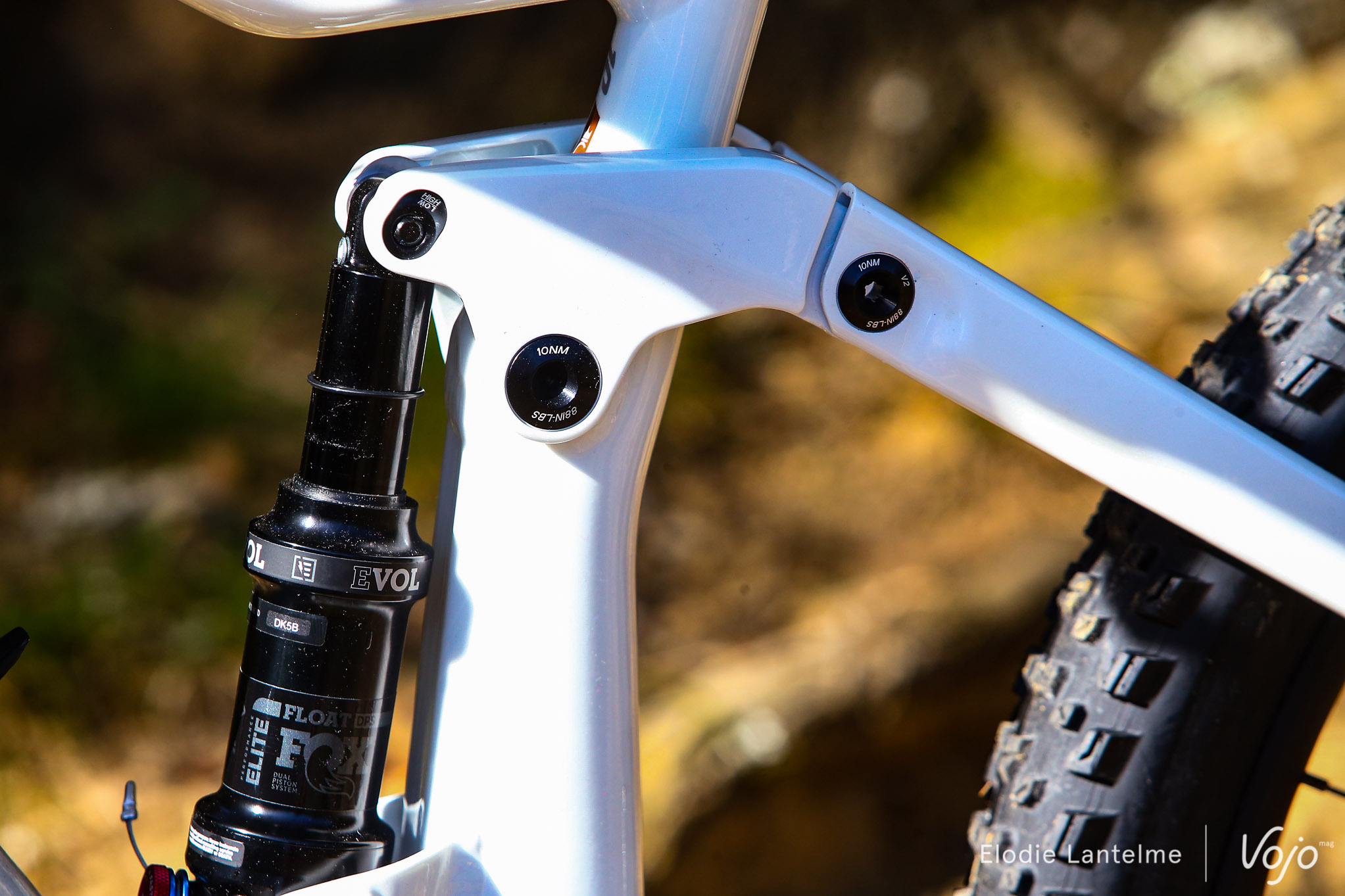 Pour ce faire, le Strike adopte un top-tube légèrement plus court que son cousin sportif (600 mm en taille M contre 605) et des bases arrière plus longues (475 mm contre 460), un boitier de pédalier plus haut (339 mm de hauteur d’axe de pédalier annoncée), un angle de tube de selle de 73,4° (contre 75,5) et un angle de direction de 65° (contre 65,3).