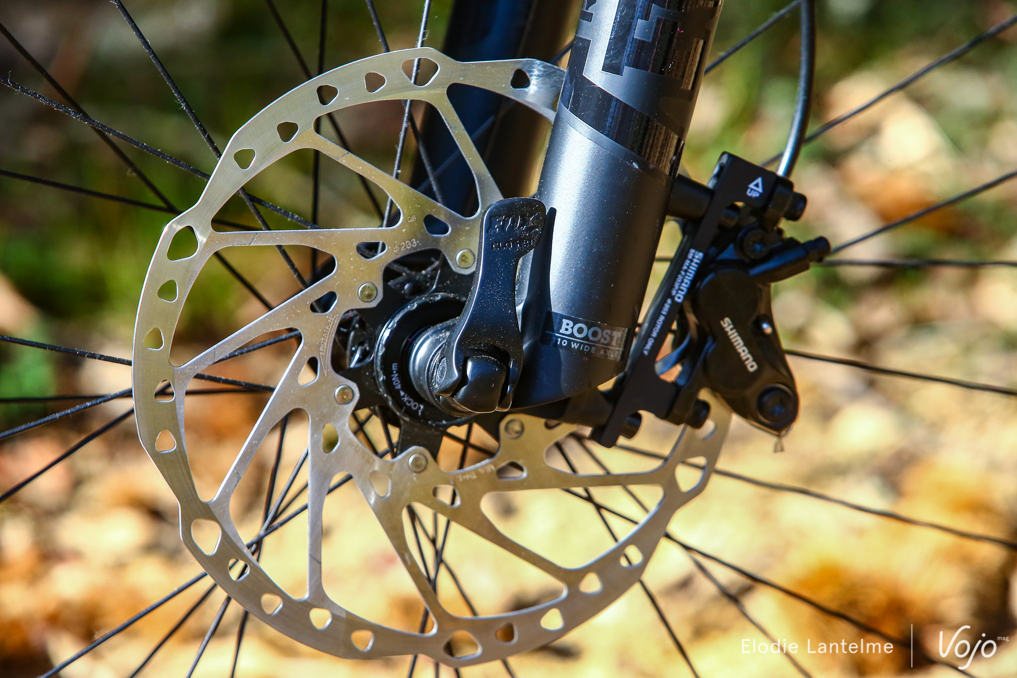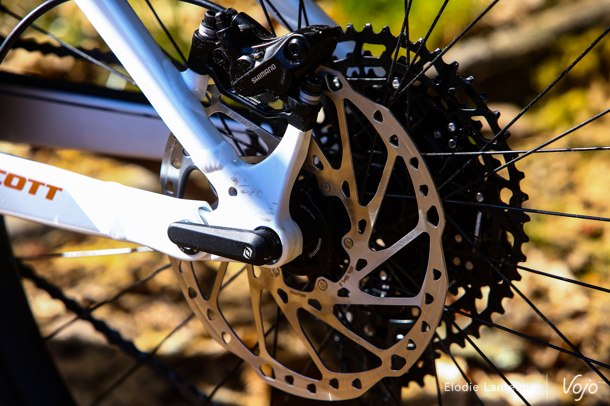 Sur cette version Contessa 710, pour les freins, Scott est repassé chez Shimano, avec des MT520 en 200 mm de diamètre. On notera, à l’arrière, le très discret capteur, totalement intégré.