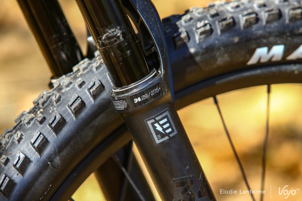 La versatilité a bien dû guider les chefs produits, puisque que le Strike, s’il n’est pas proposé de série dans cette configuration, peut quitter ses 27,5 pouces et être monté en 29 pouces. Une option intéressante en vue de muscler ce vélo si besoin, tout comme celle du montage des pneus Maxxis Rekon de section 2.8 en tubeless. Une quasi-obligation, vu le poids de l’ensemble (on parle bien du vélo, là, comme vous y allez!).