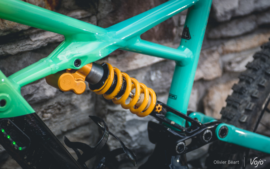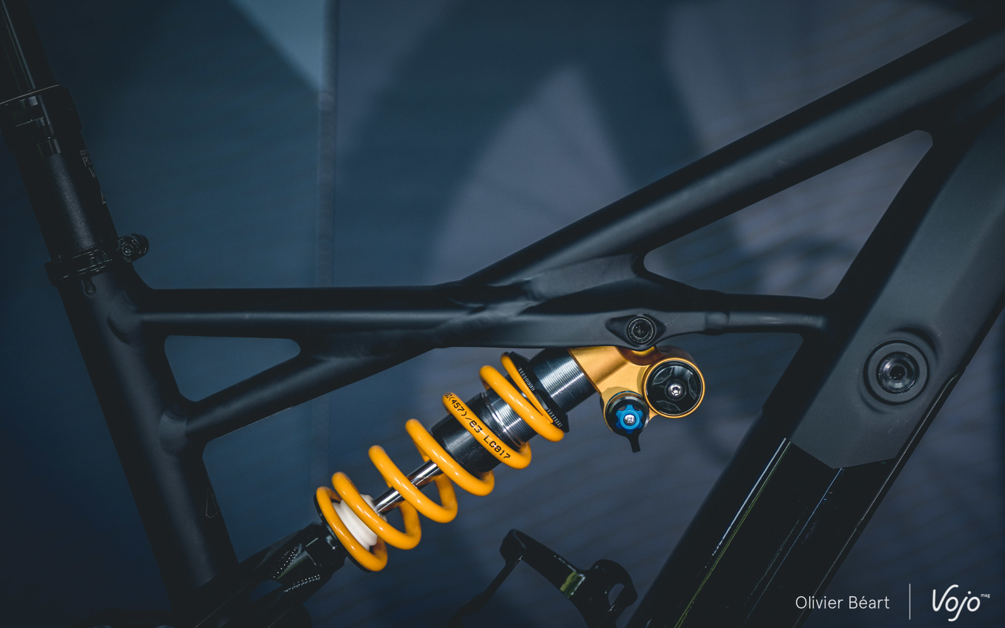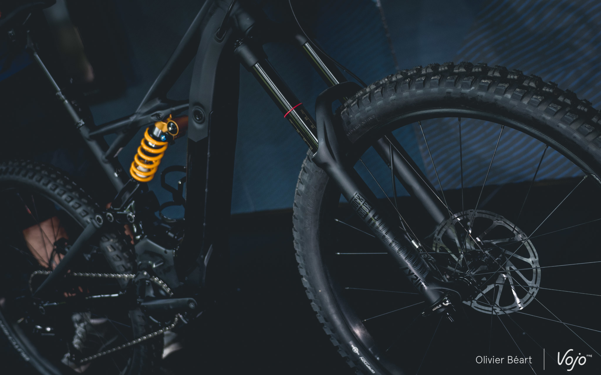 S’agissant d’un vélo plus lourd et voyant que les clients potentiels de ce genre de machine veulent pouvoir faire des pistes type bikepark en se passant de remontées mécaniques, le débattement est augmenté par rapport à un Enduro classique. Il passe à 180mm à l’avant comme à l’arrière, avec un amortisseur Ohlins TTX22M Coil et une fourche RockShox Lyrik RCT3. La biellette est renforcée par rapport à un Enduro classique.