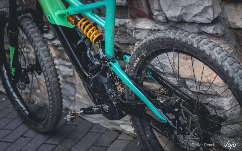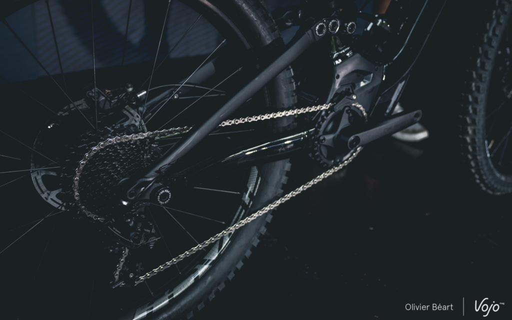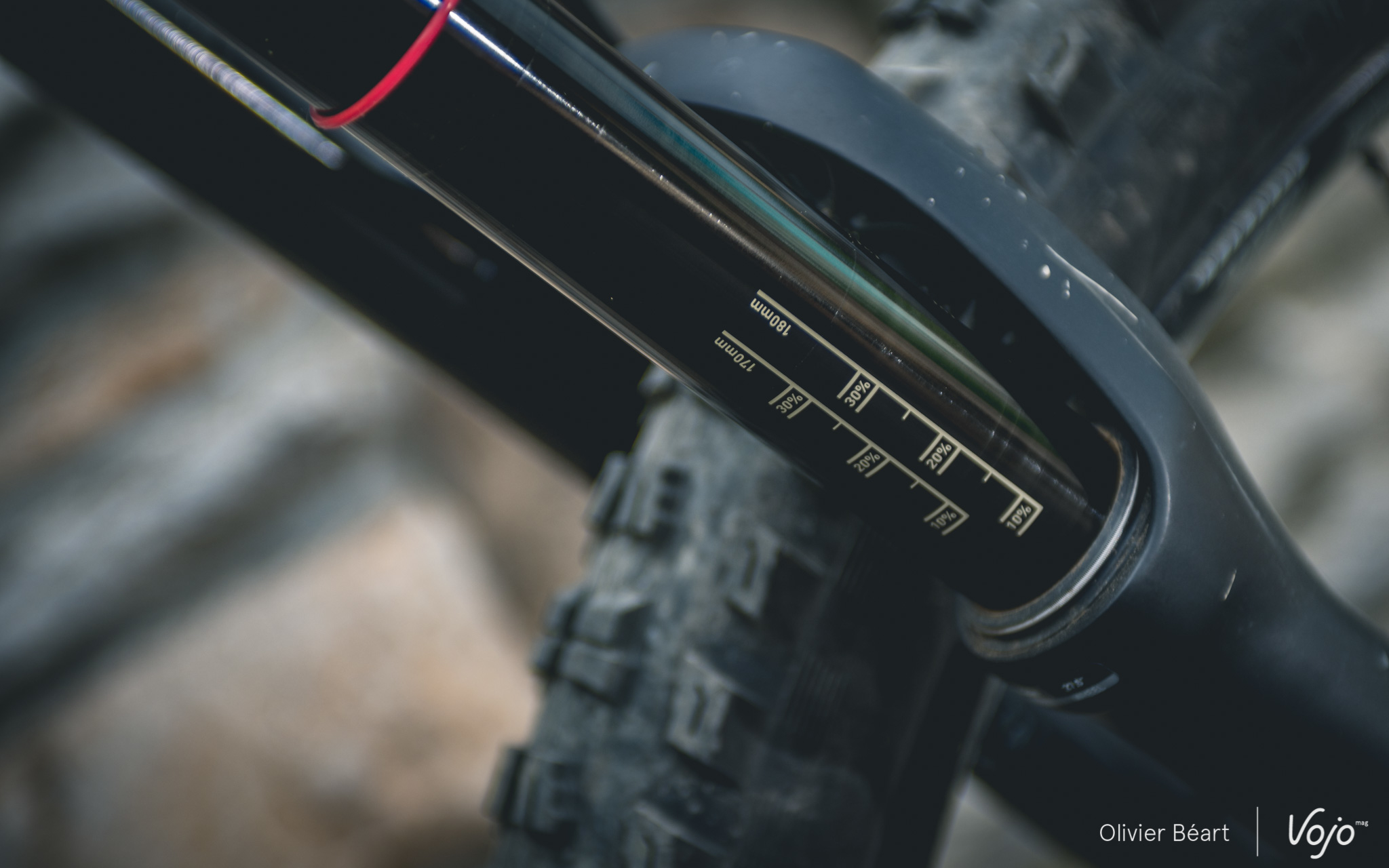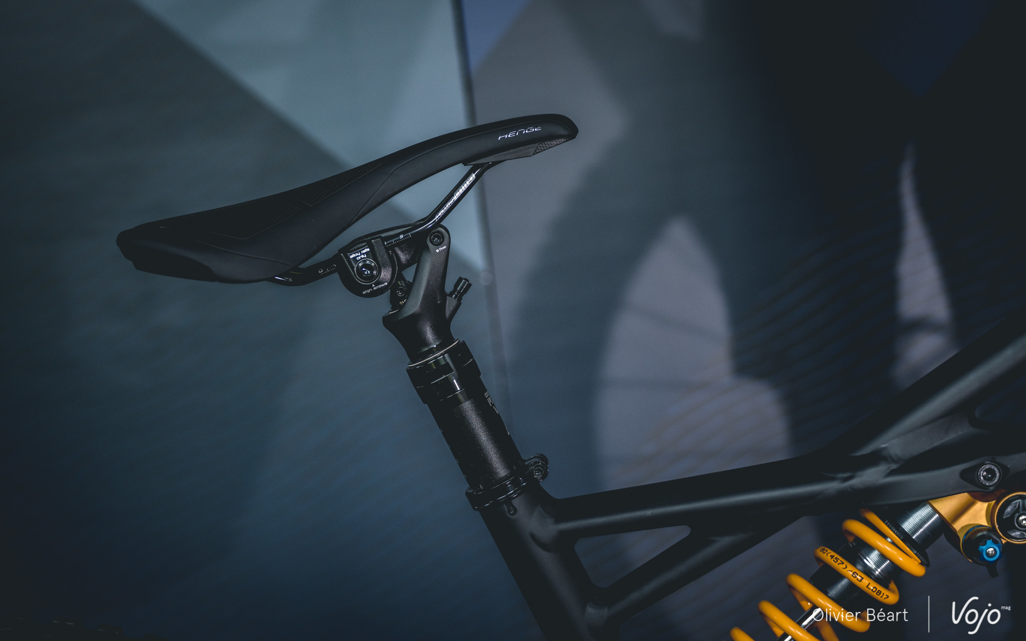 S’agissant d’un vélo plus lourd et voyant que les clients potentiels de ce genre de machine veulent pouvoir faire des pistes type bikepark en se passant de remontées mécaniques, le débattement est augmenté par rapport à un Enduro classique. Il passe à 180mm à l’avant comme à l’arrière, avec un amortisseur Ohlins TTX22M Coil et une fourche RockShox Lyrik RCT3. La biellette est renforcée par rapport à un Enduro classique.