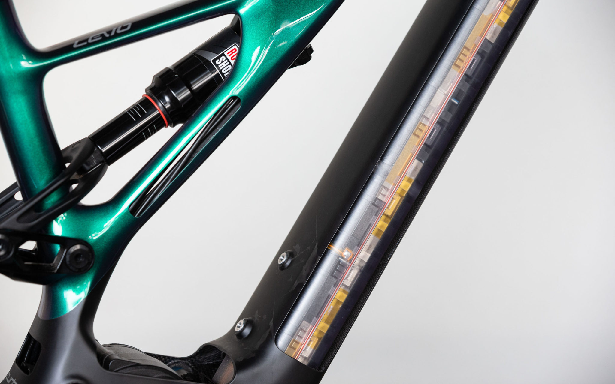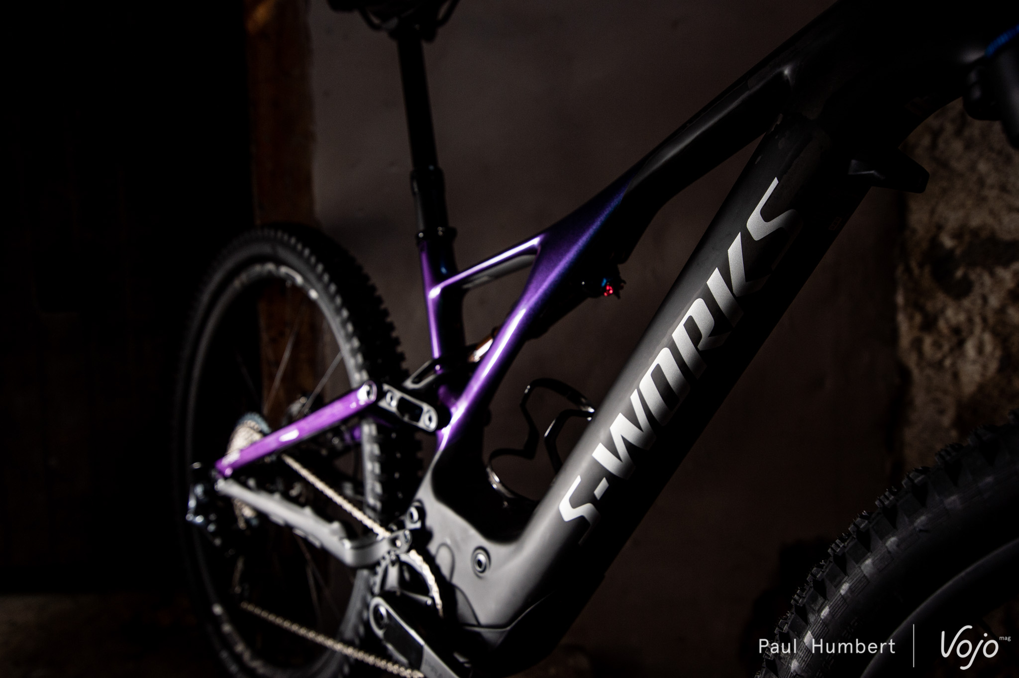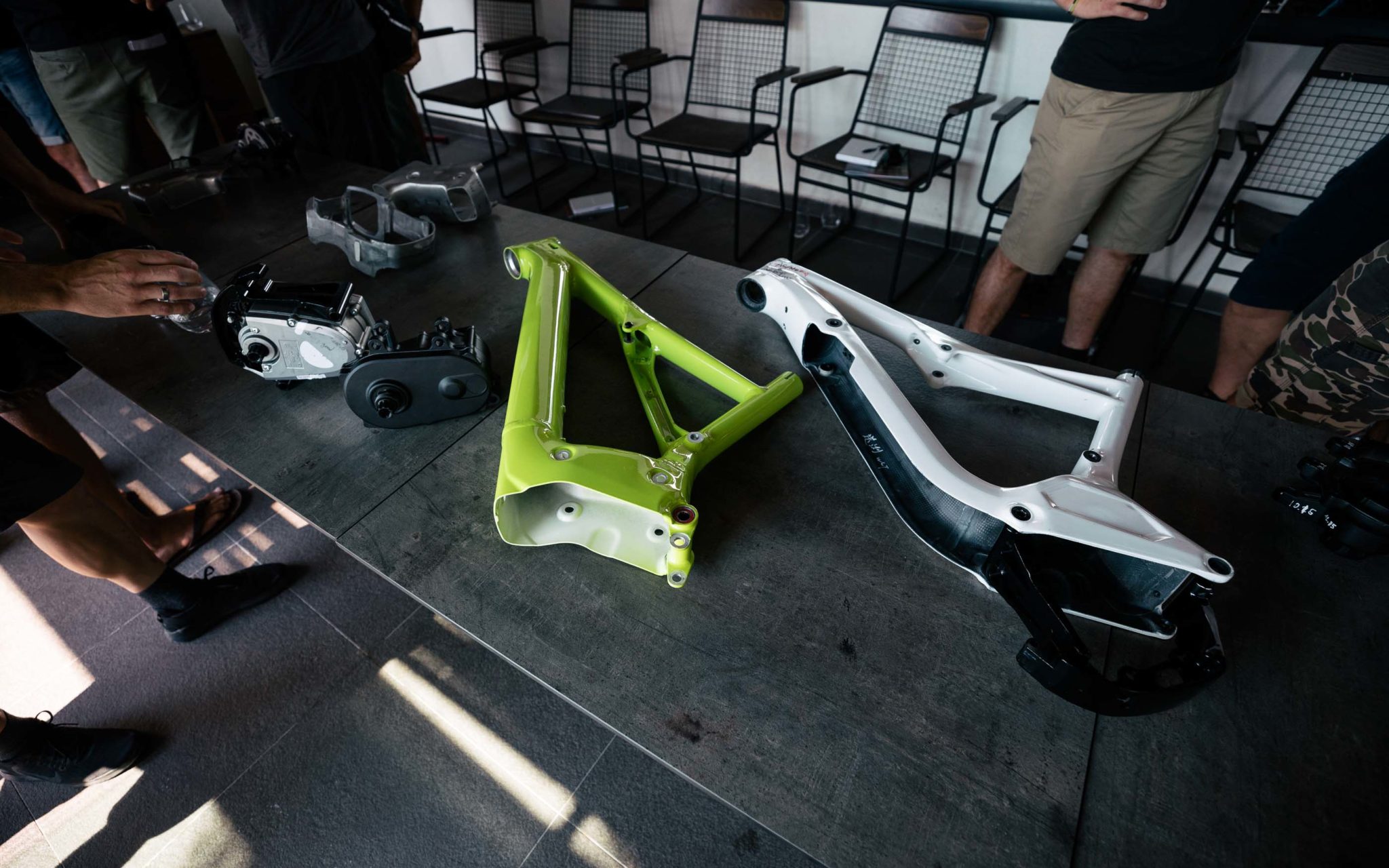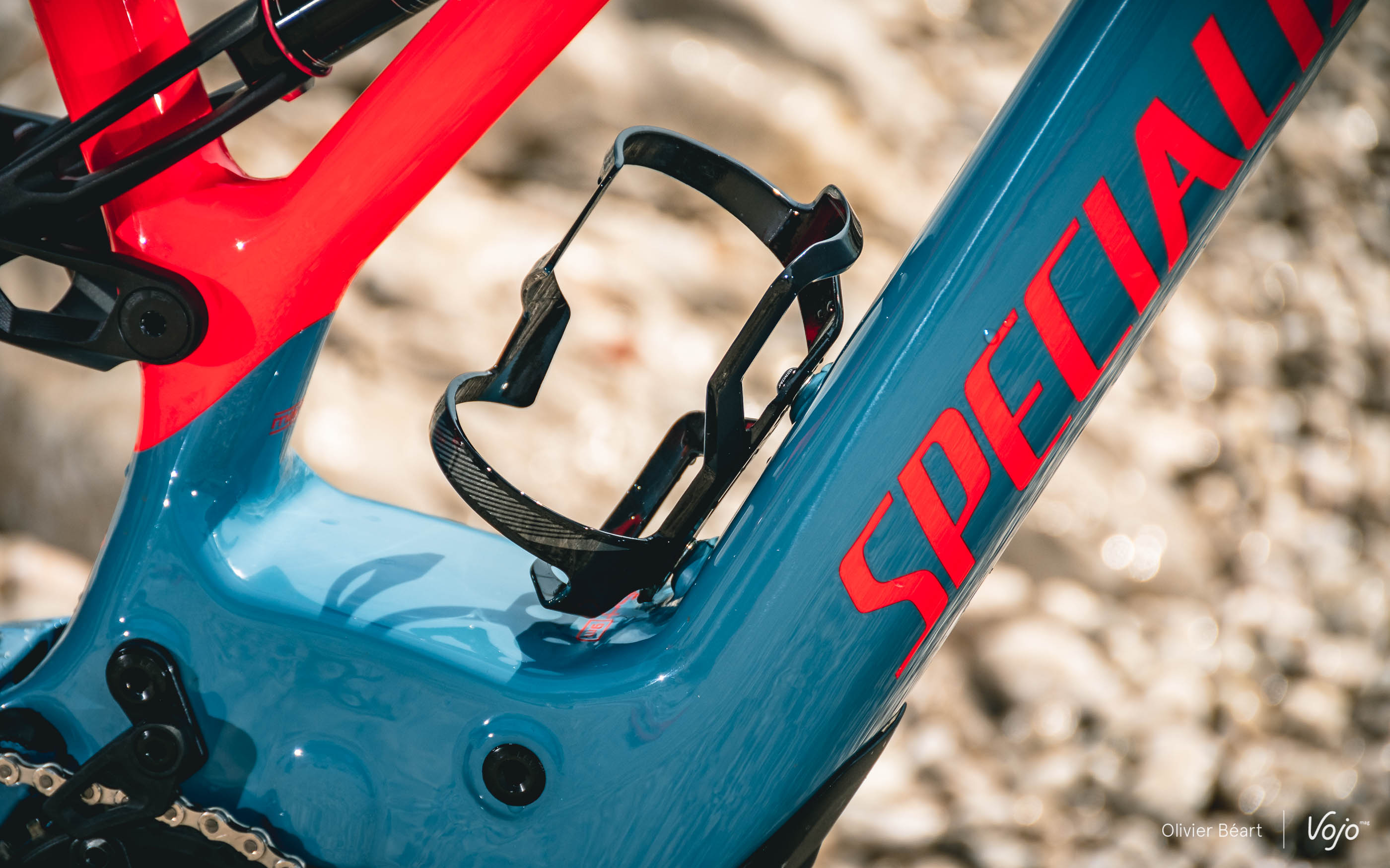 Au-delà de la filiation avec le dernier « Stumpy », la refonte du cadre du nouveau Levo a aussi pour but de loger une nouvelle batterie et d’améliorer son intégration. « Au niveau du look, on était déjà sur quelque chose de plutôt pas mal sur le premier Levo, mais structurellement, avoir un tube diagonal à moitié ouvert sur toute sa longueur, c’est loin d’être optimal », souligne Vincent Patureau en nous montrant une « mule » hybride qui leur a servi au moment du développement.