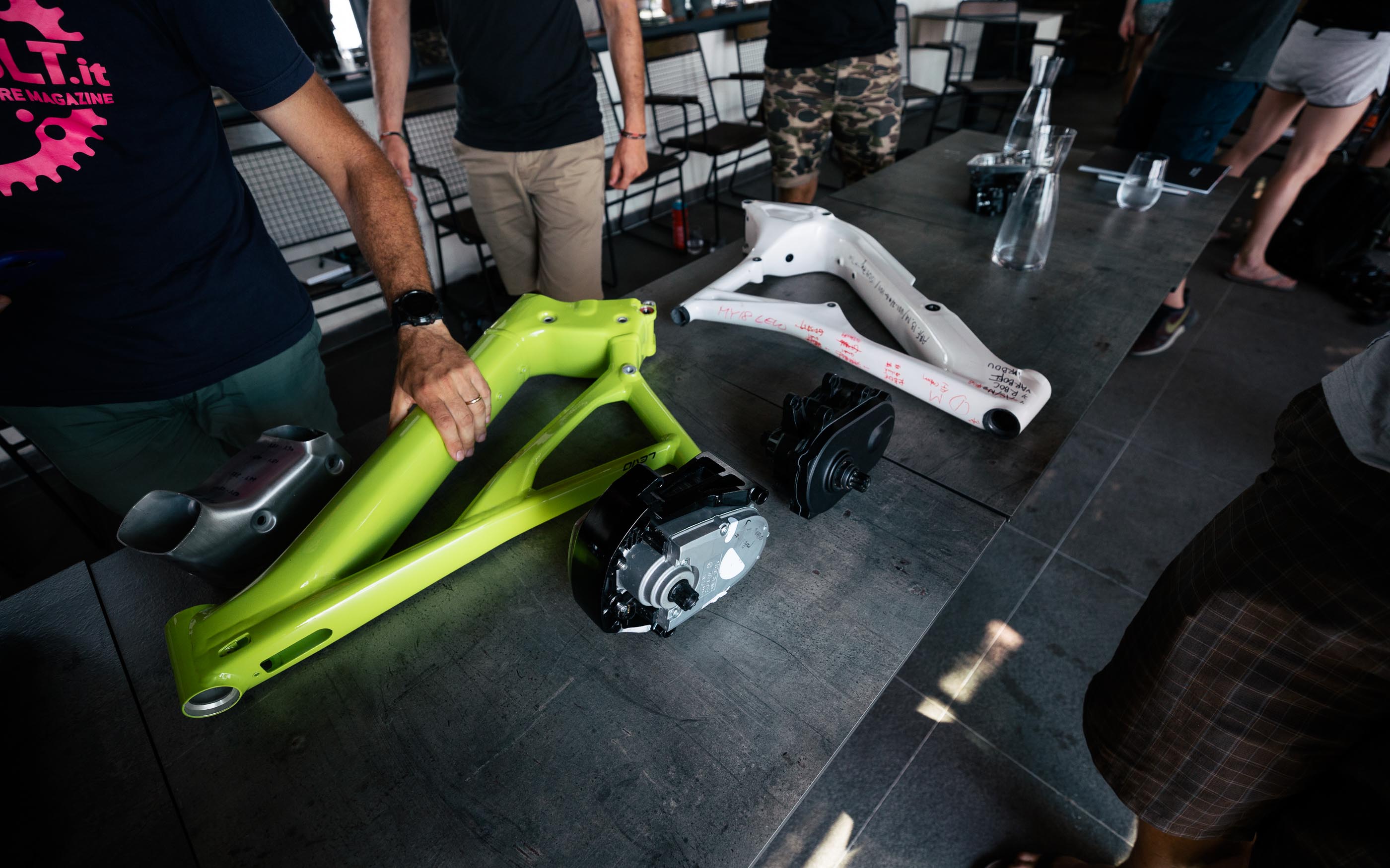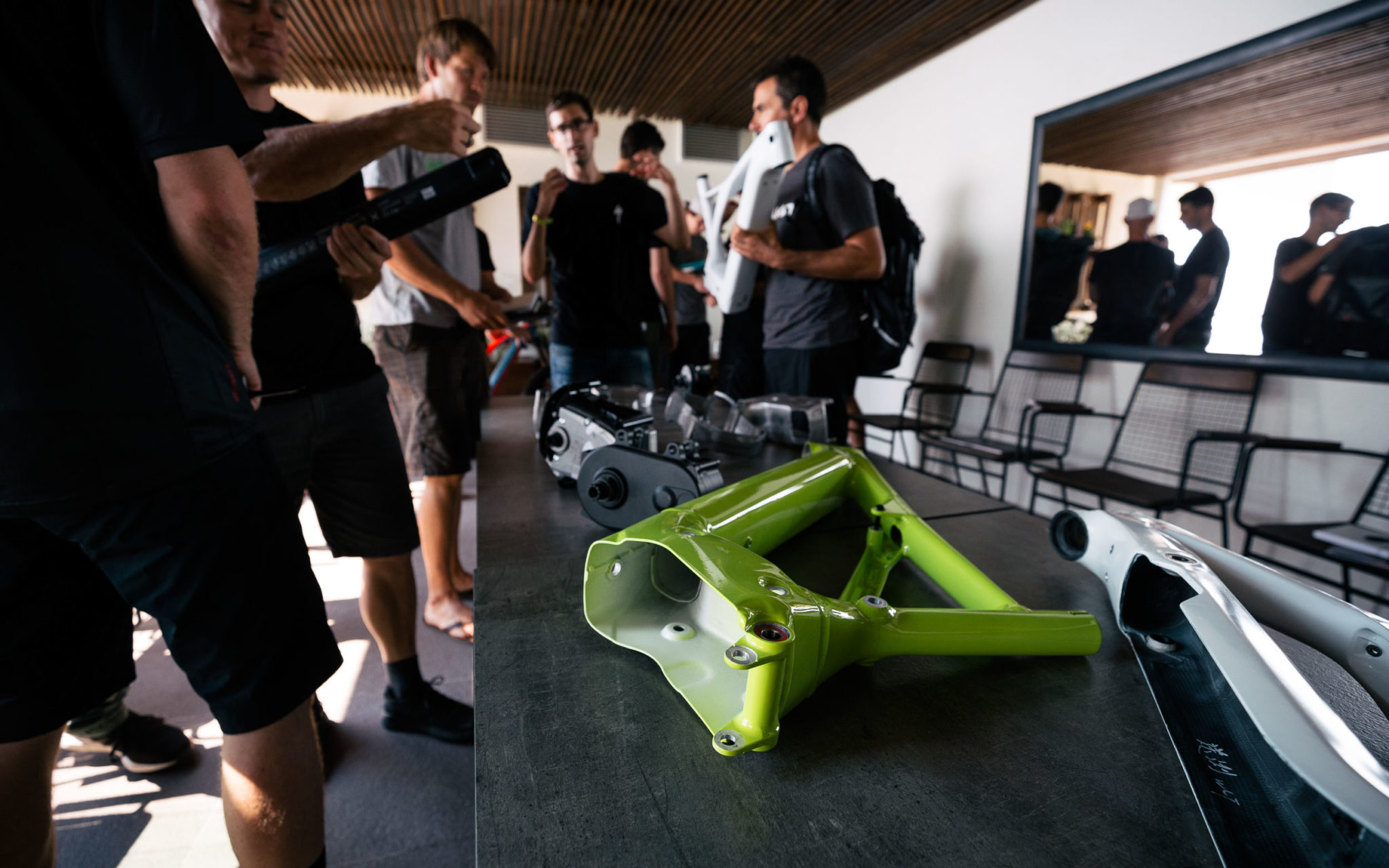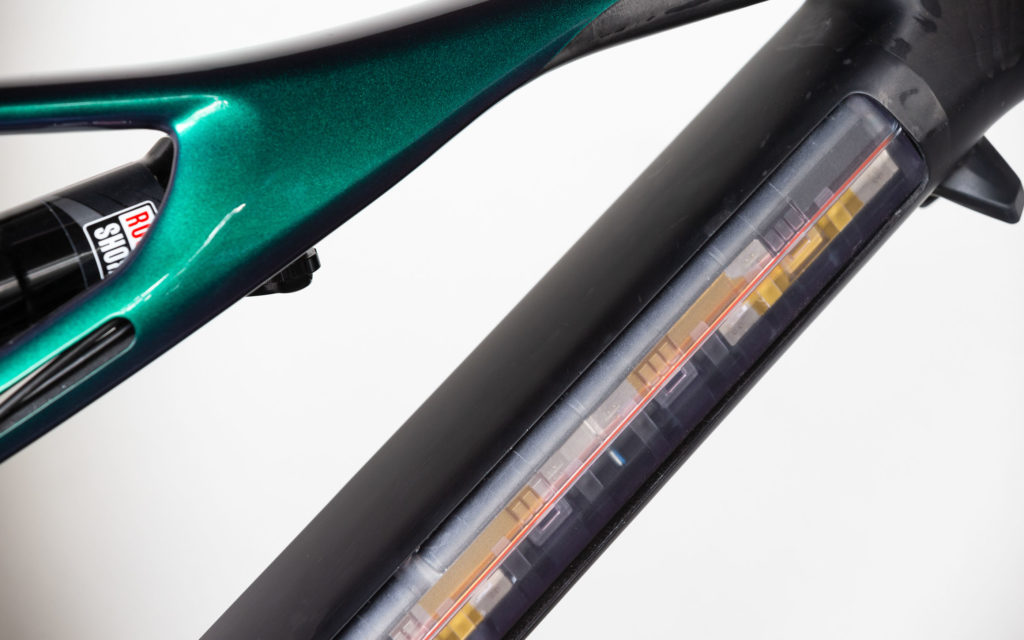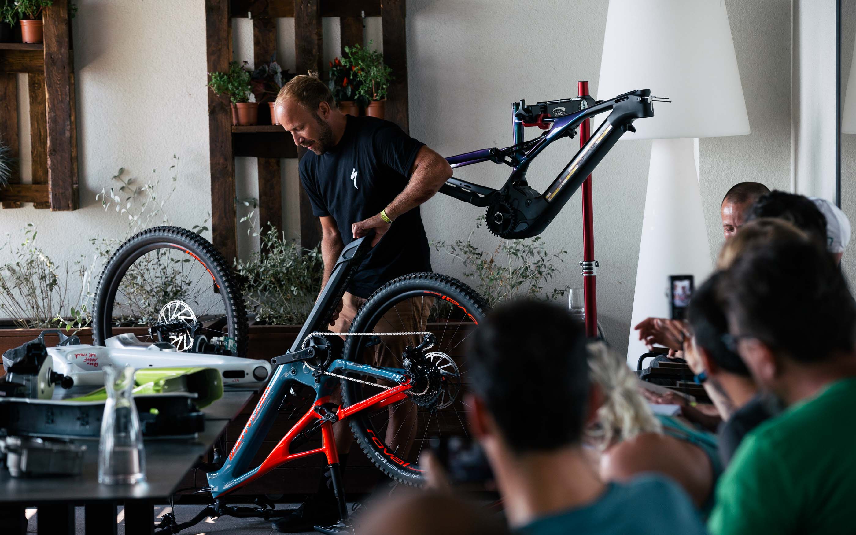 Au-delà de la filiation avec le dernier « Stumpy », la refonte du cadre du nouveau Levo a aussi pour but de loger une nouvelle batterie et d’améliorer son intégration. « Au niveau du look, on était déjà sur quelque chose de plutôt pas mal sur le premier Levo, mais structurellement, avoir un tube diagonal à moitié ouvert sur toute sa longueur, c’est loin d’être optimal », souligne Vincent Patureau en nous montrant une « mule » hybride qui leur a servi au moment du développement.