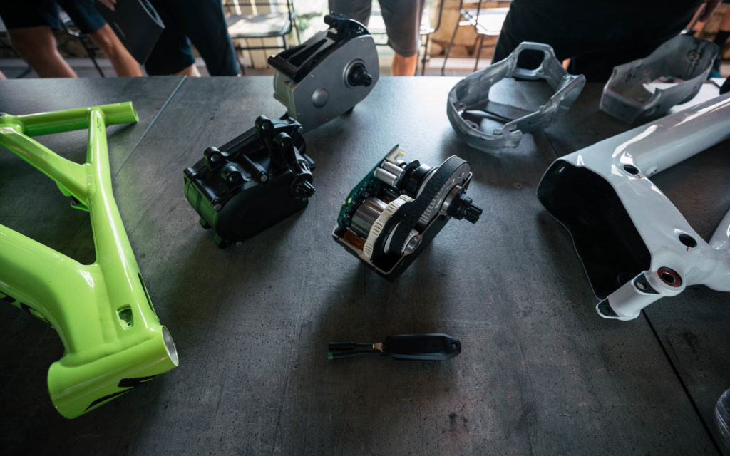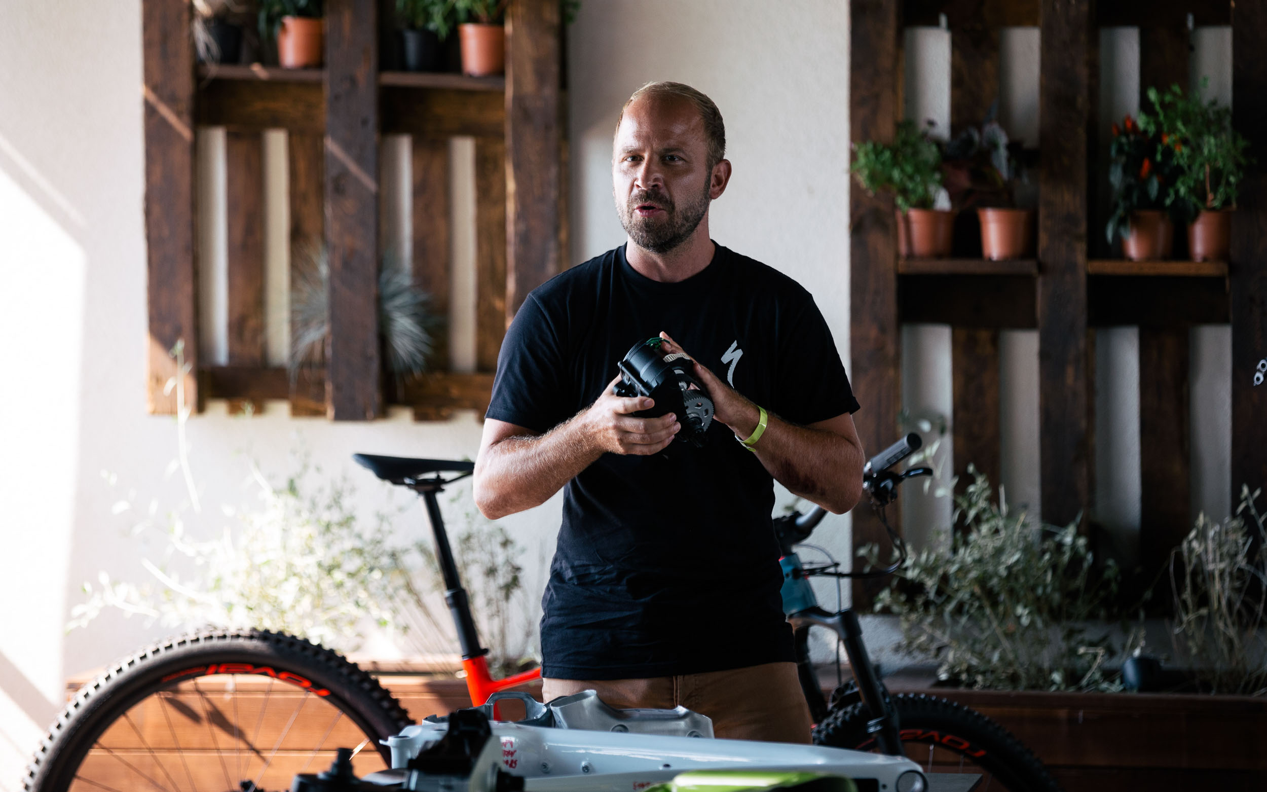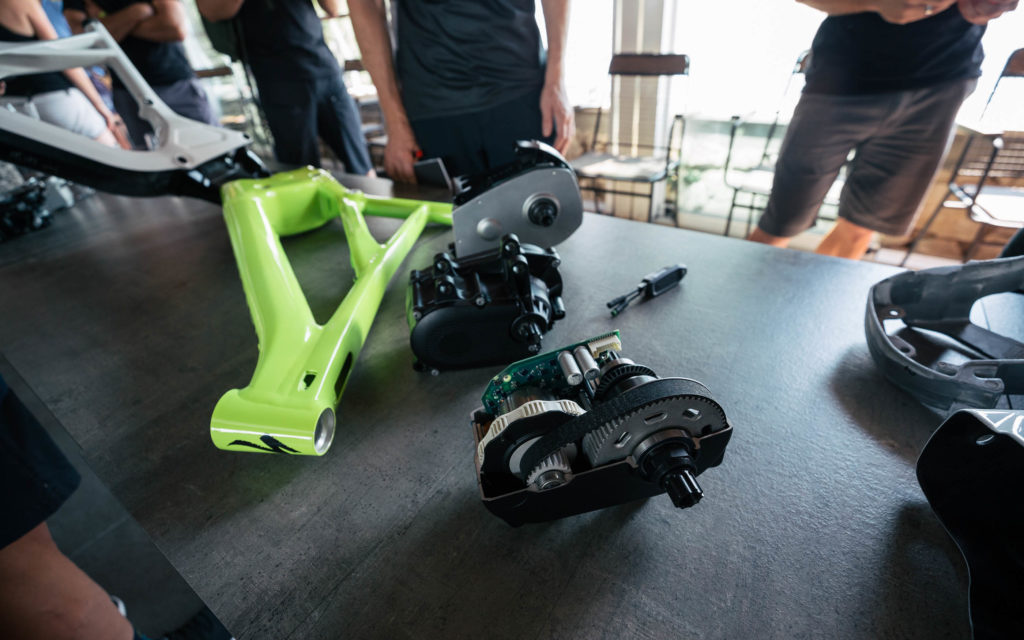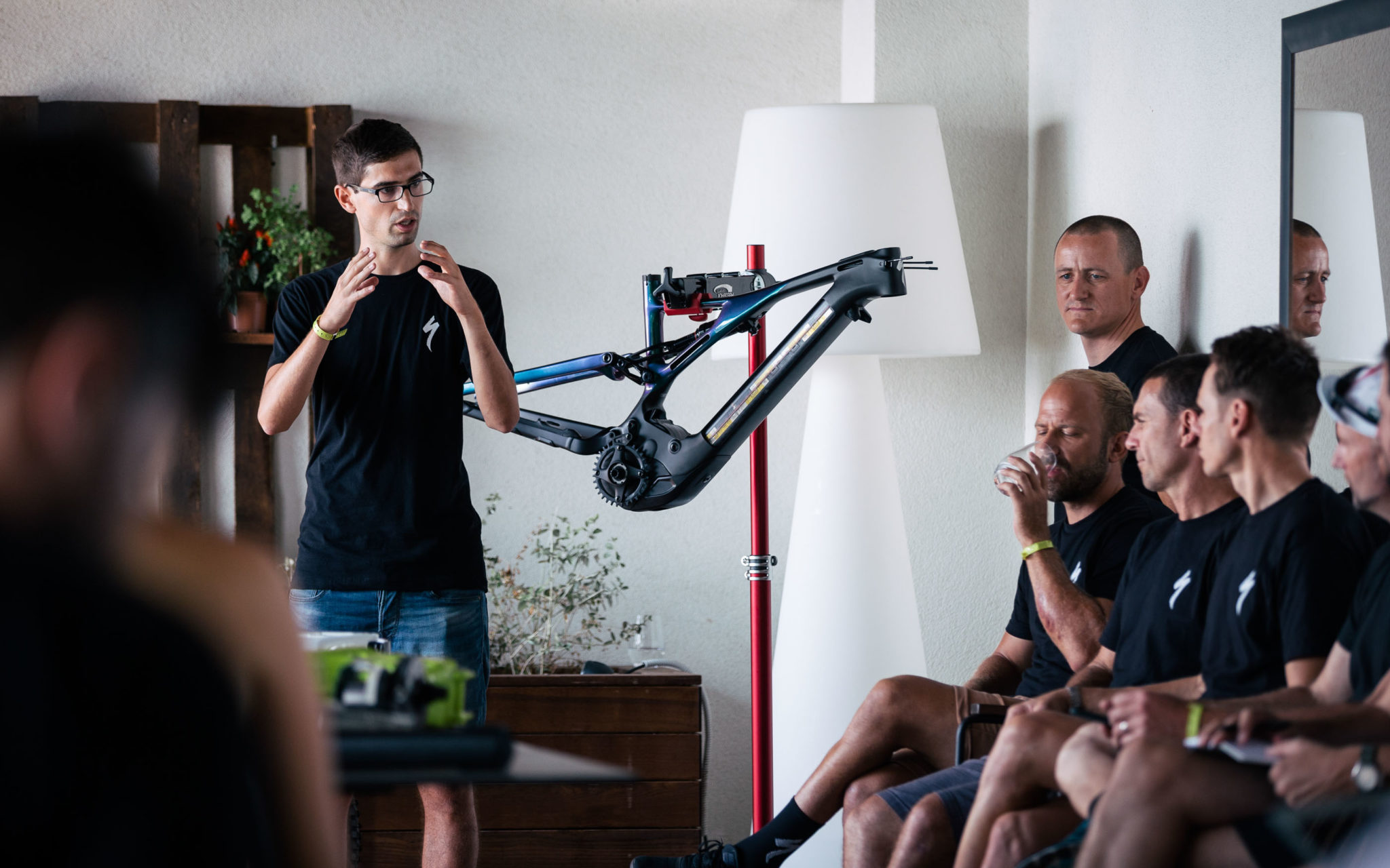 Au-delà de la filiation avec le dernier « Stumpy », la refonte du cadre du nouveau Levo a aussi pour but de loger une nouvelle batterie et d’améliorer son intégration. « Au niveau du look, on était déjà sur quelque chose de plutôt pas mal sur le premier Levo, mais structurellement, avoir un tube diagonal à moitié ouvert sur toute sa longueur, c’est loin d’être optimal », souligne Vincent Patureau en nous montrant une « mule » hybride qui leur a servi au moment du développement.