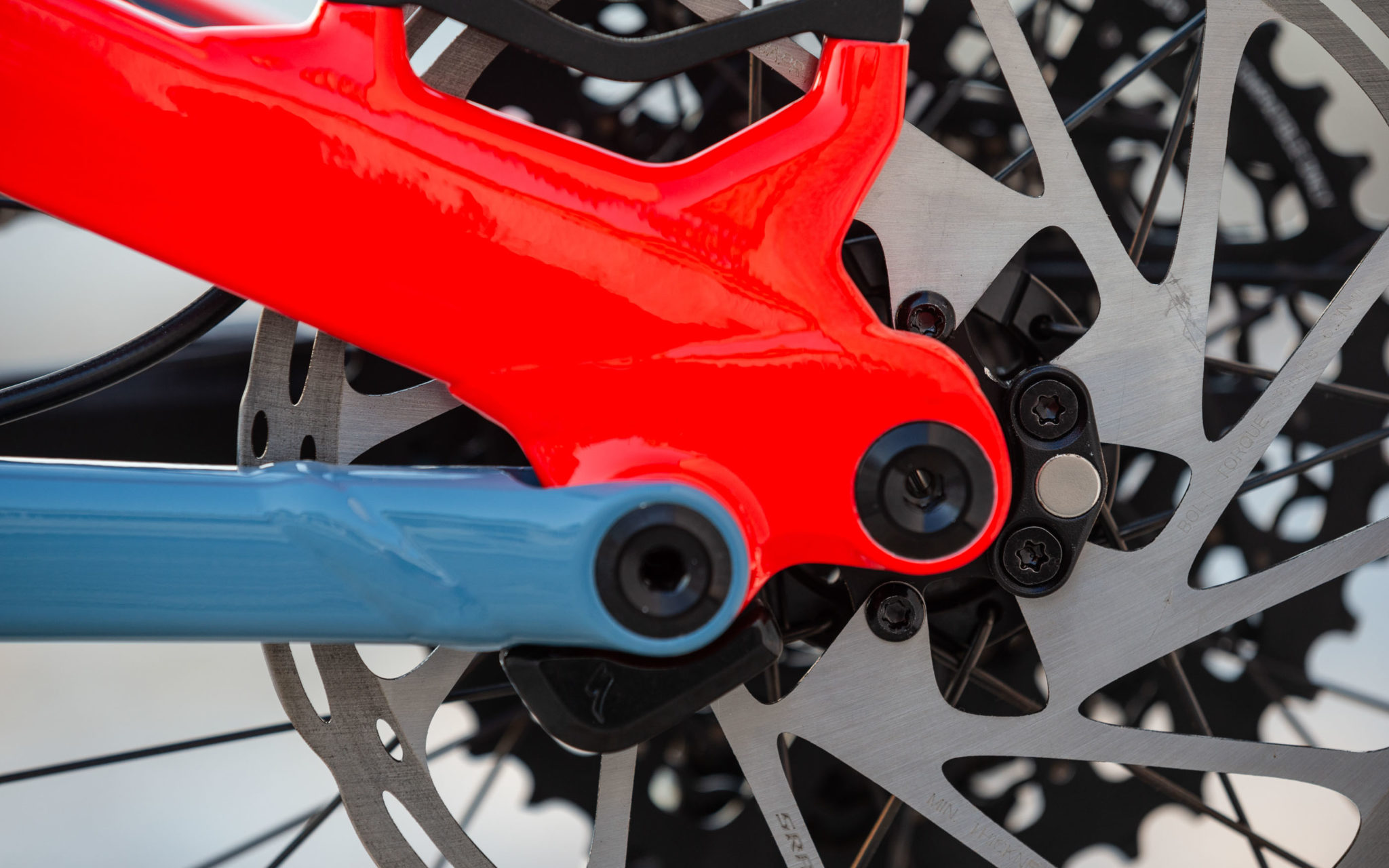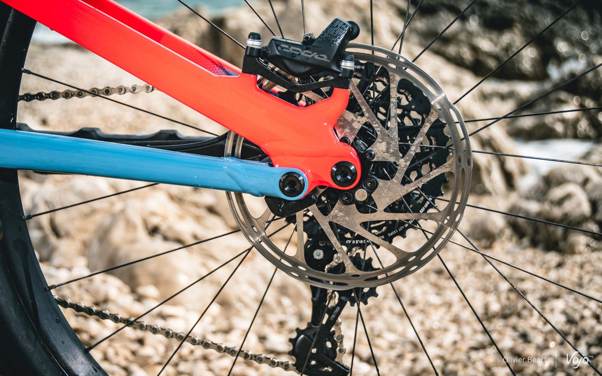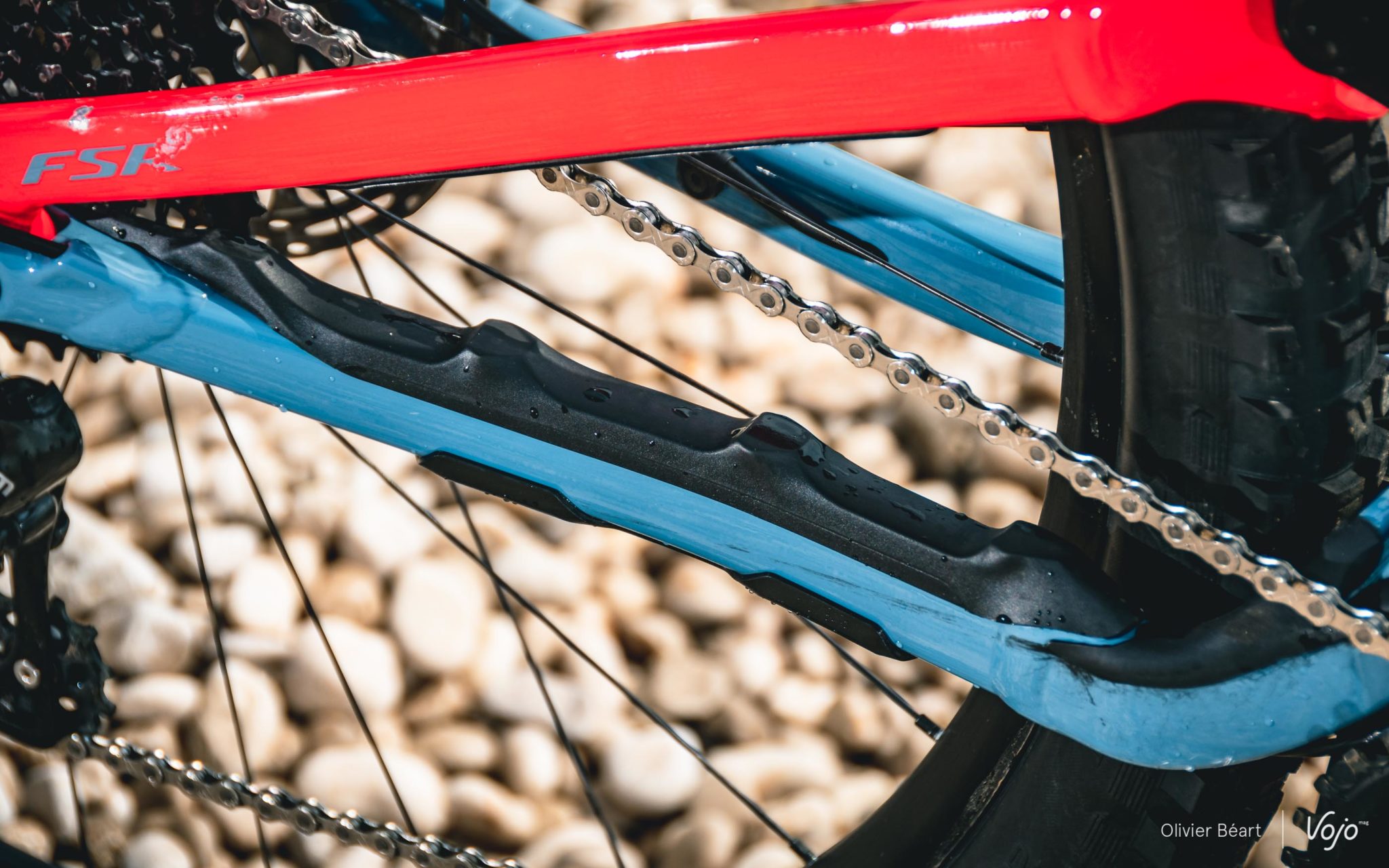 Le protège-base reprend les petites excroissances anti-bruit déjà vues sur le Stumpjumper et développées sur base d’un petit « truc » employé depuis longtemps par les mécanos du team de DH, qui les créaient eux-mêmes à partir de morceaux de caoutchouc repliés. Quant au capteur de vitesse, il est toujours intégré au niveau du disque arrière et encore plus discret qu’avant.